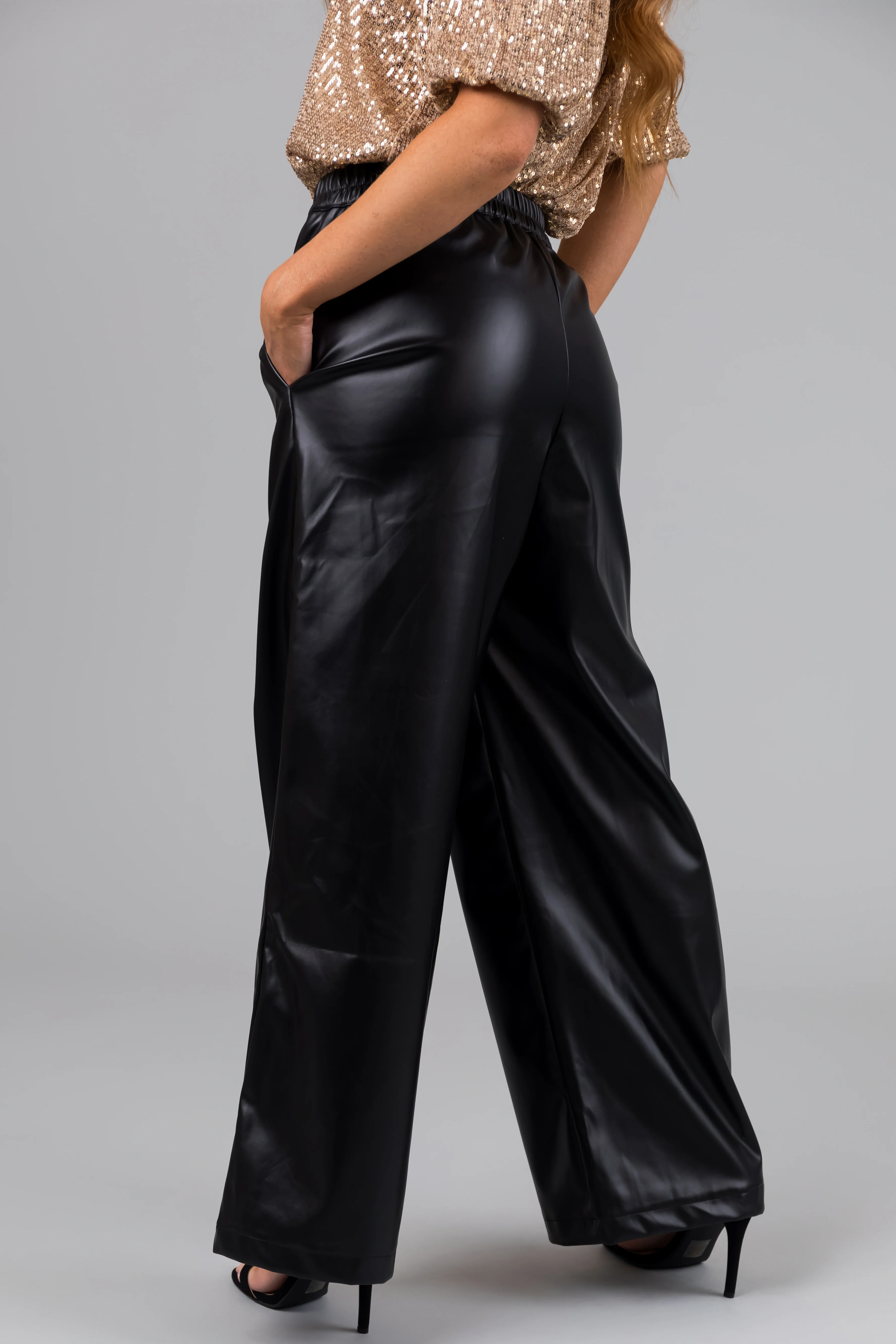 Black Pleather Elastic Waist Wide Leg Pants
