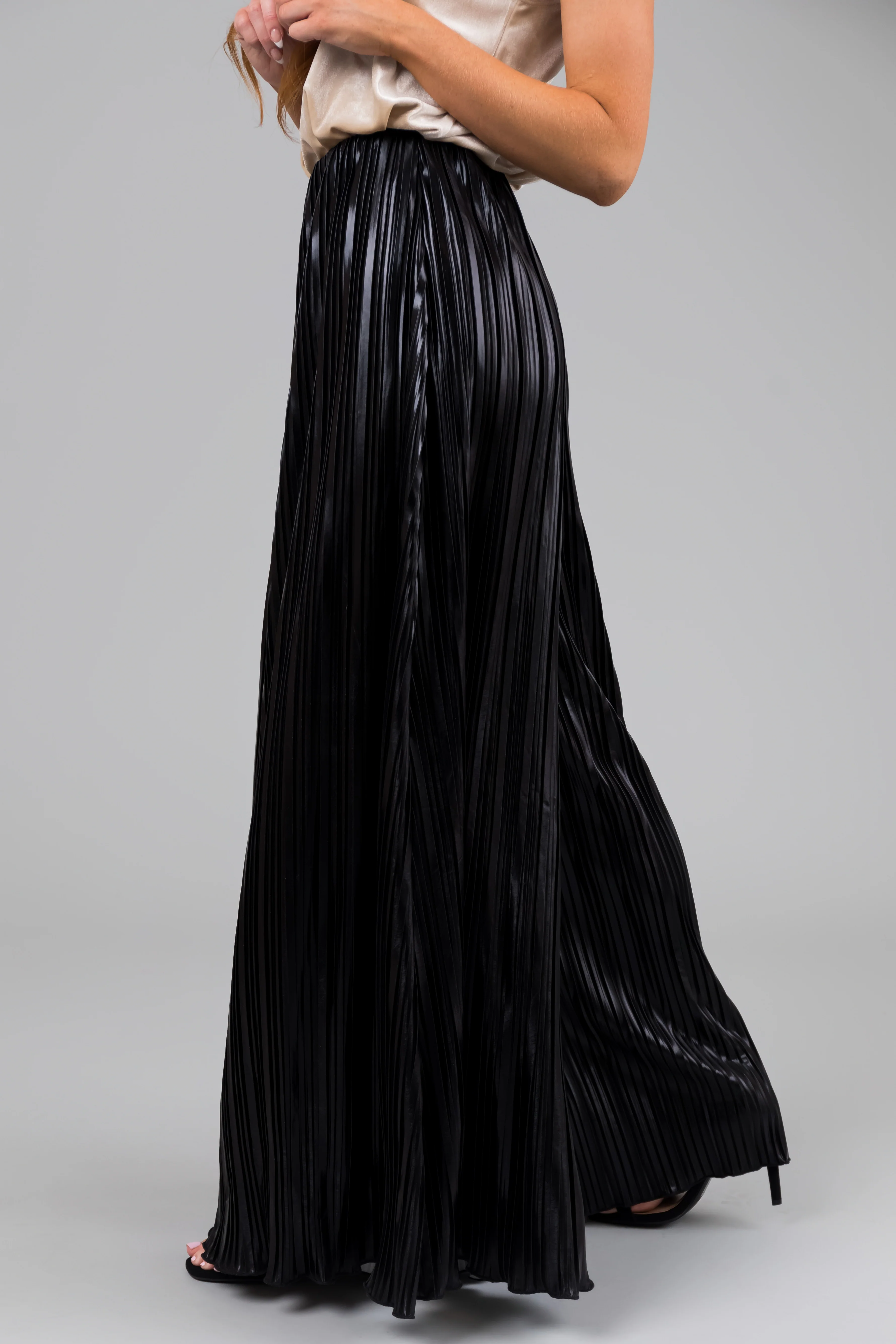 Black Metallic Pleated Flare High Waist Pants