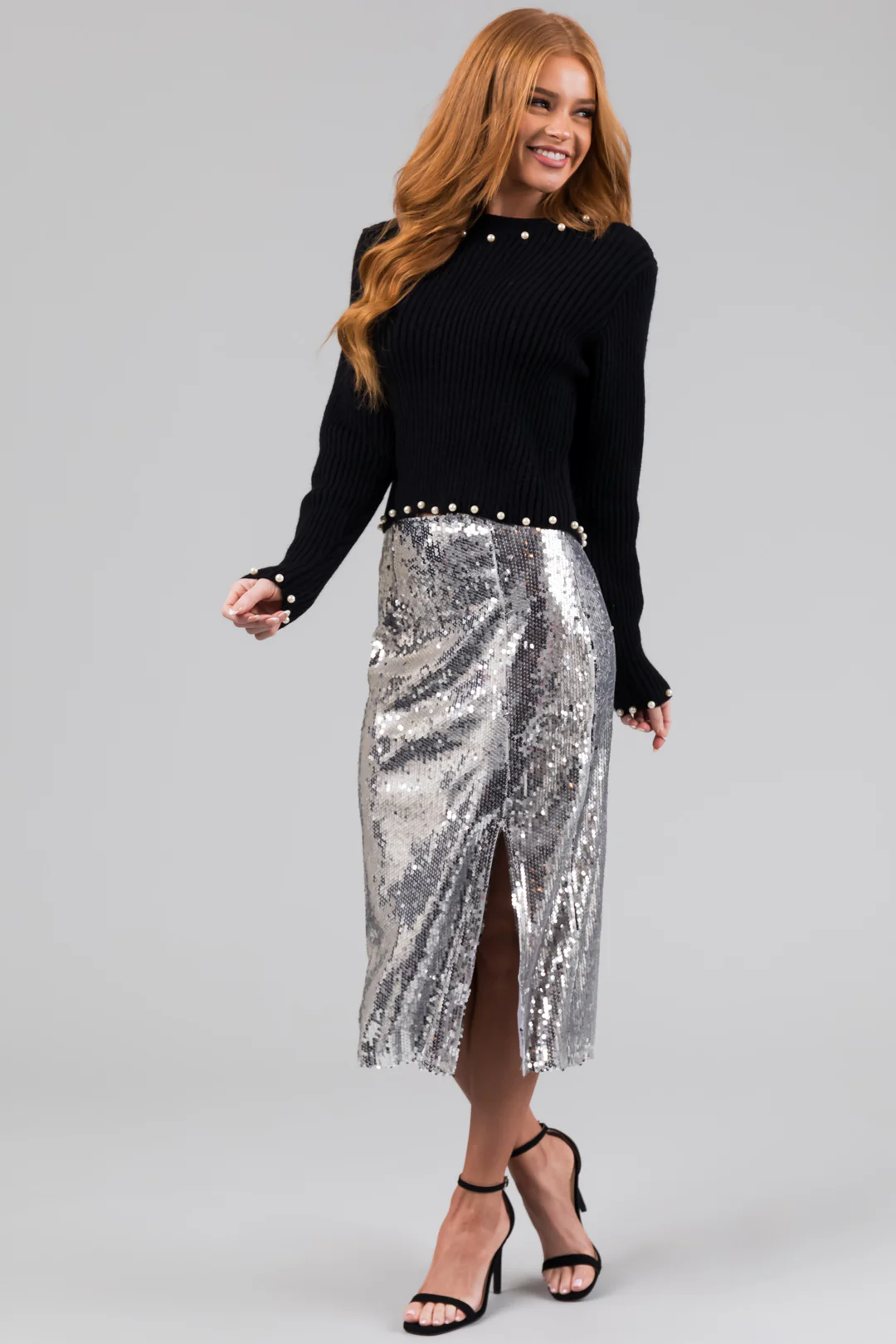 Silver Sequin Side Slit Midi Skirt