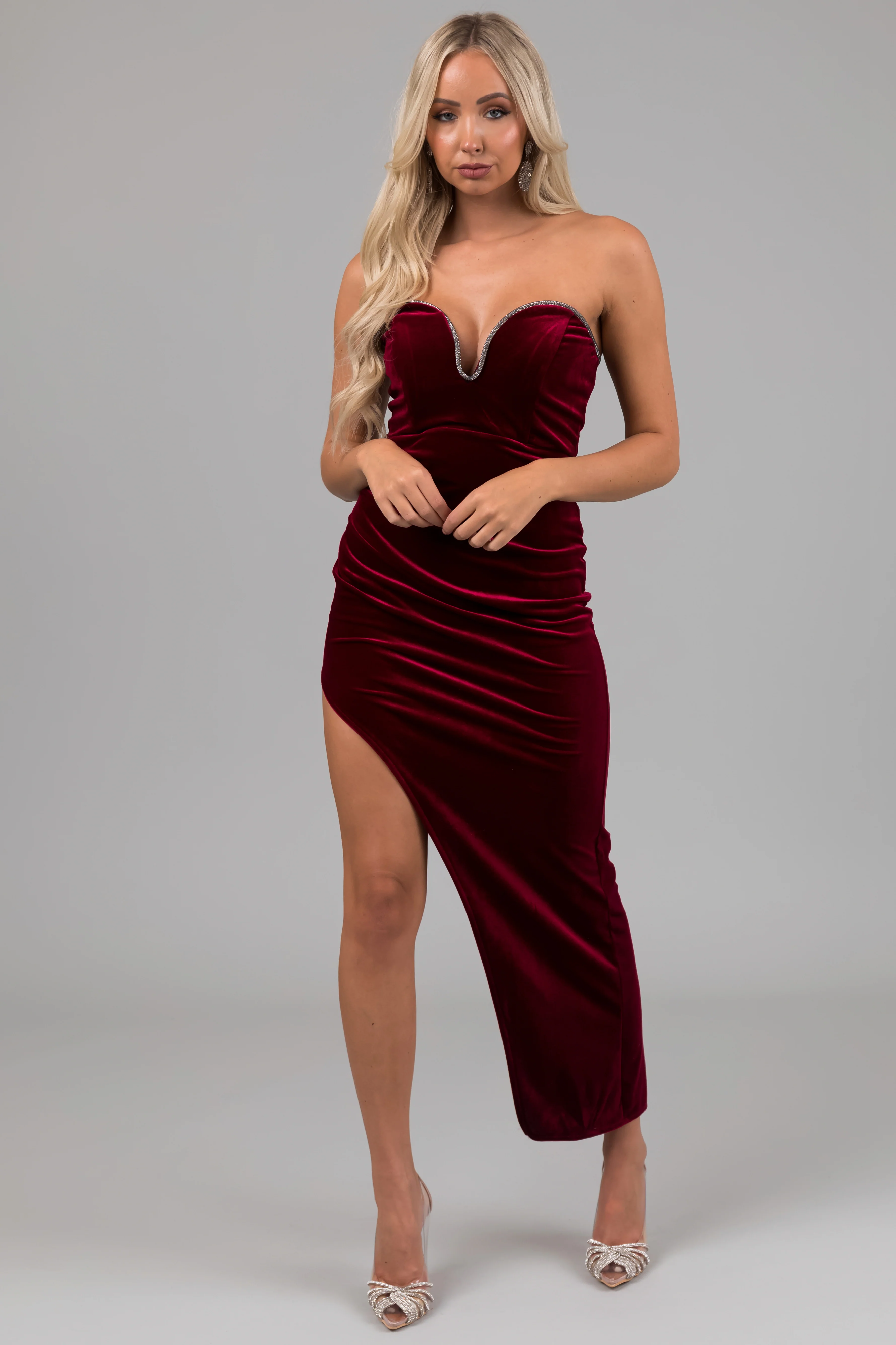 Maroon Strapless Rhinestone Detail Maxi Dress