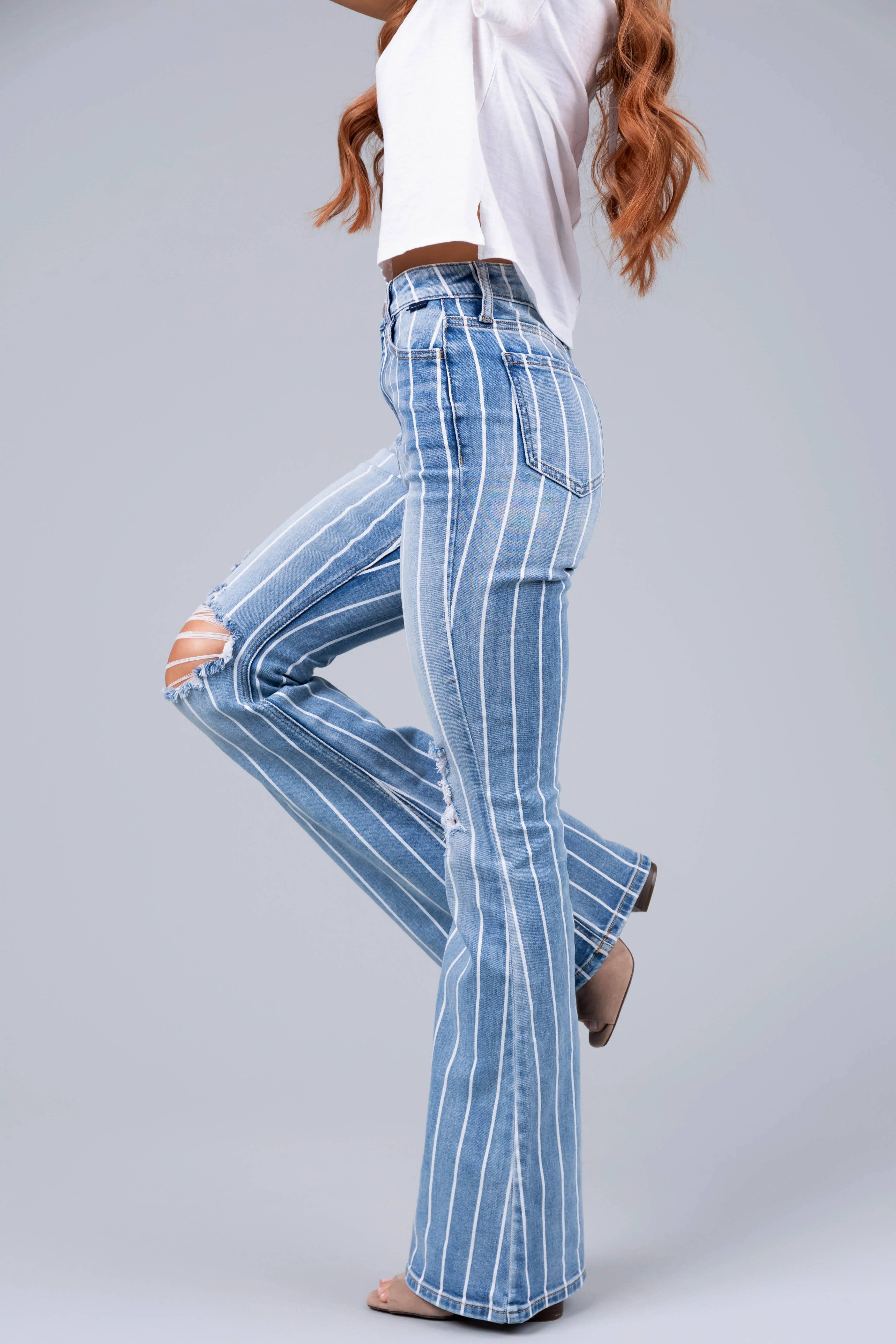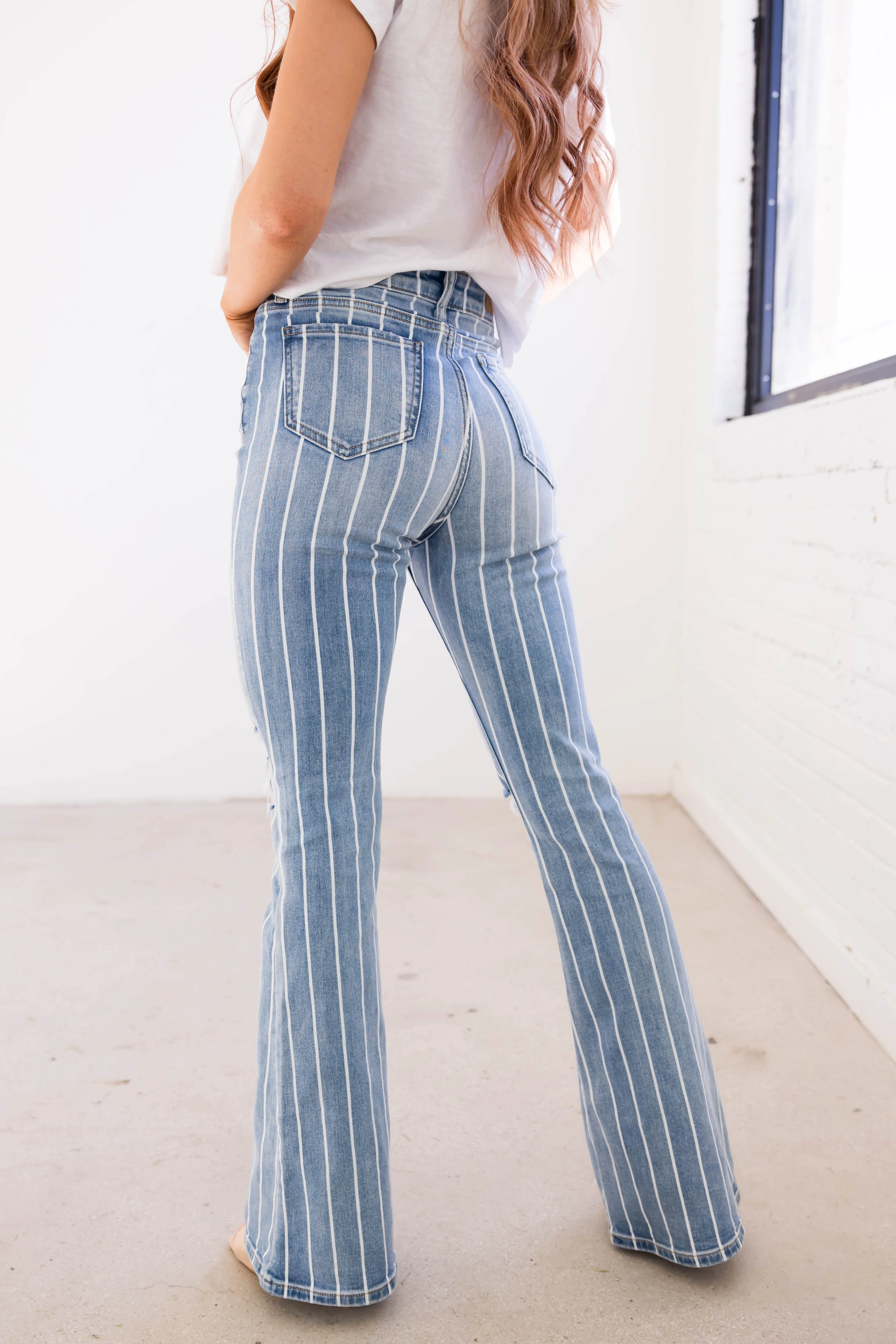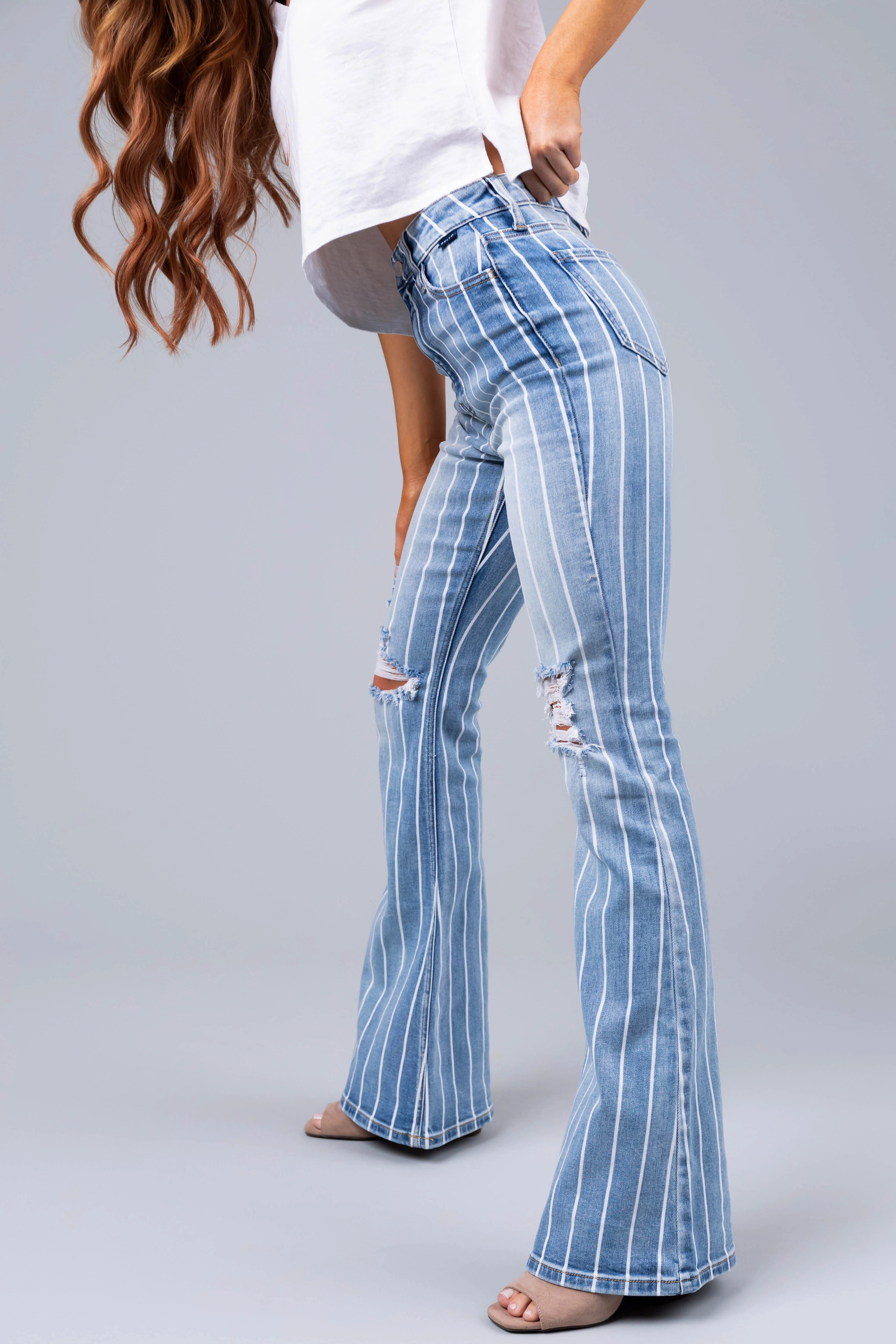 Cello Light Wash Striped High Rise Flare Jeans