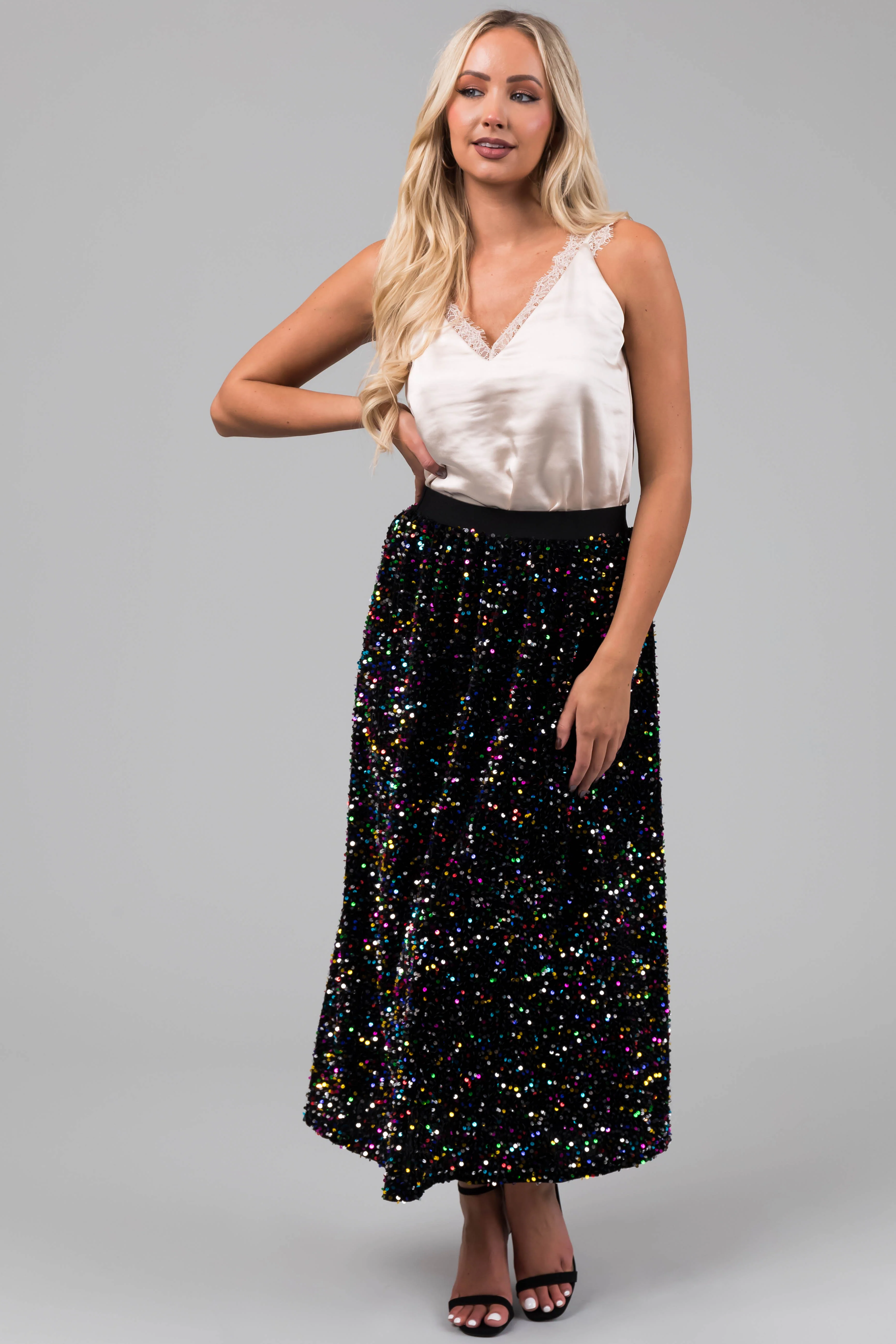 Black Colorful Sequin Velvet Midi Skirt