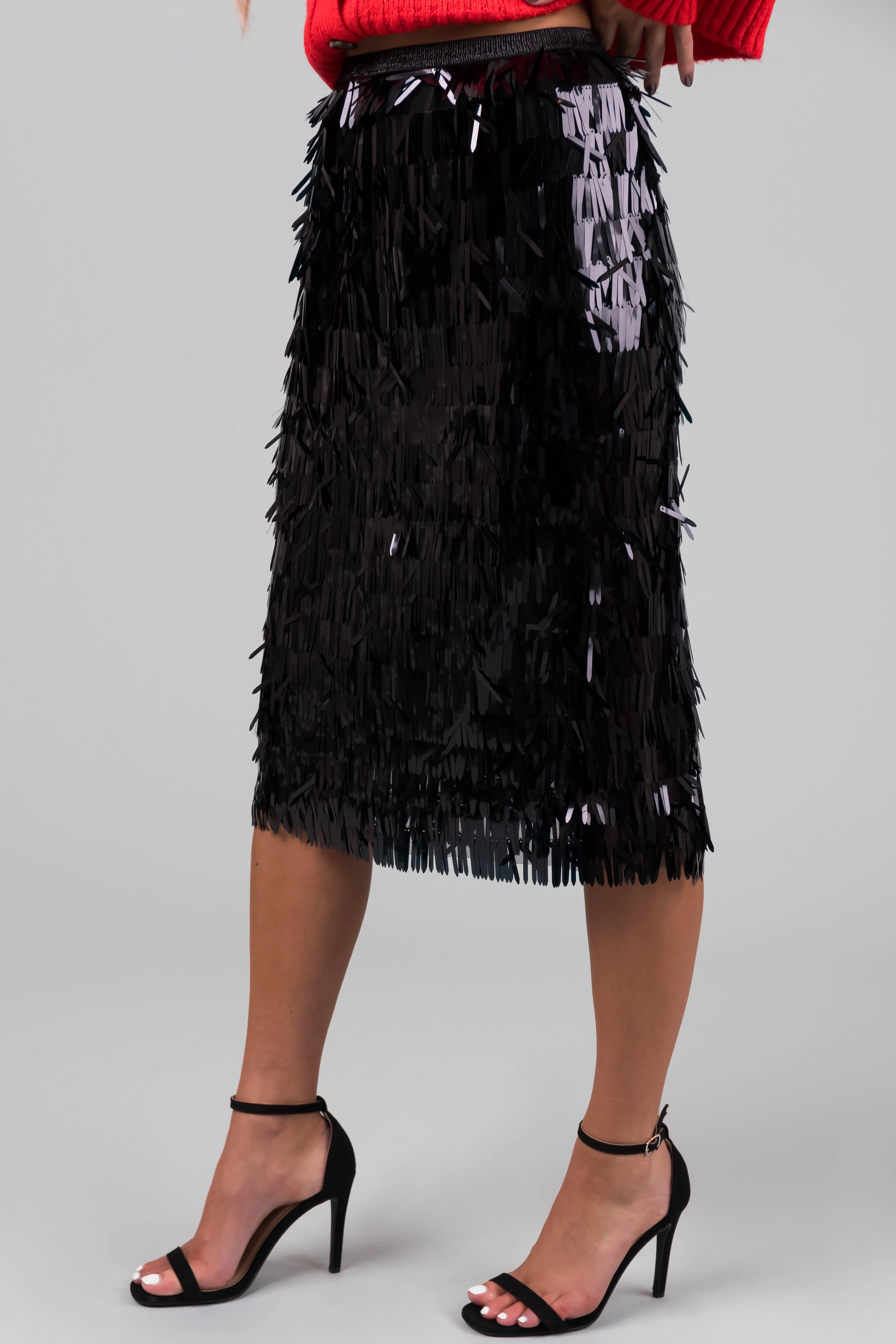 Black Fringe Sequin Elastic Midi Skirt