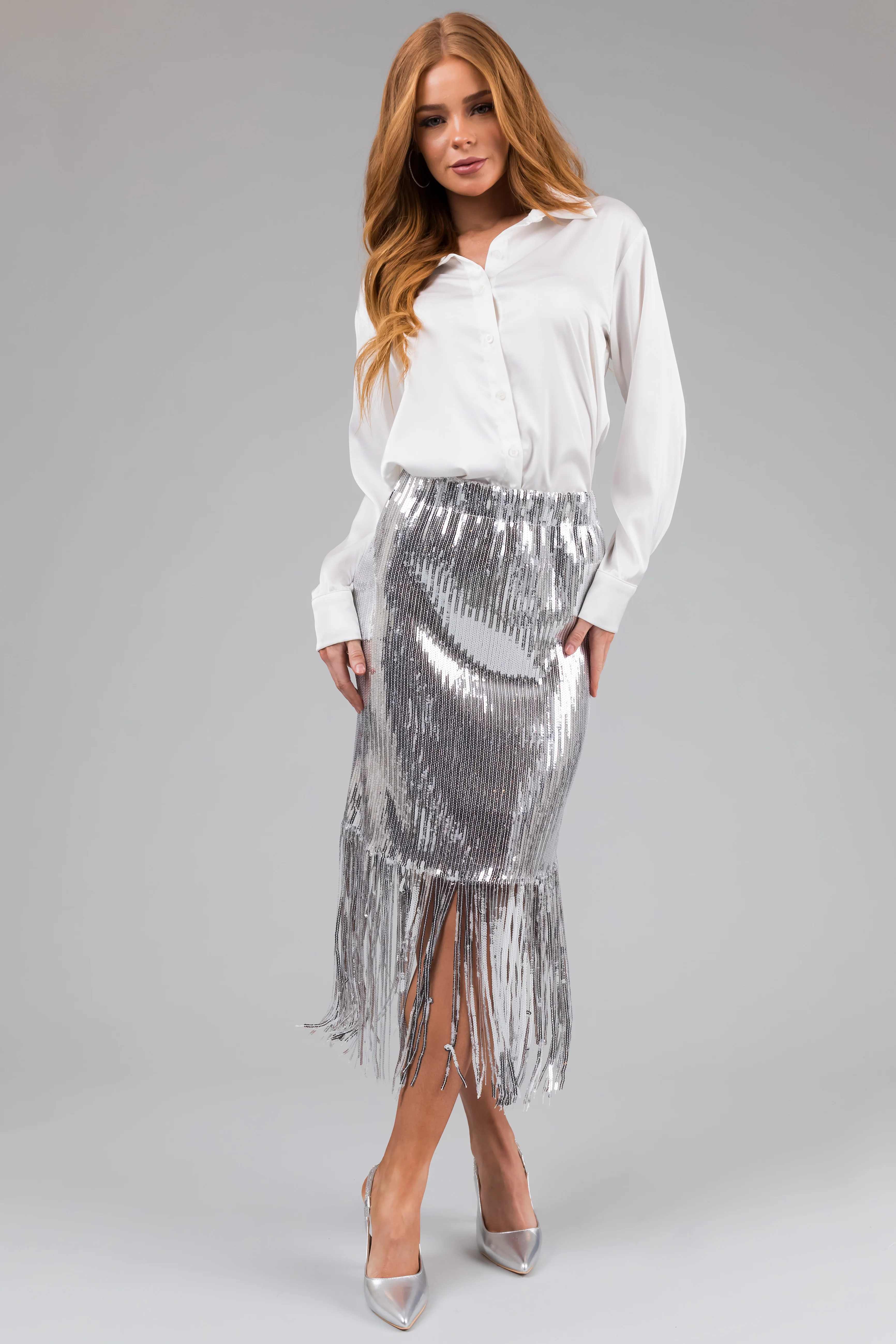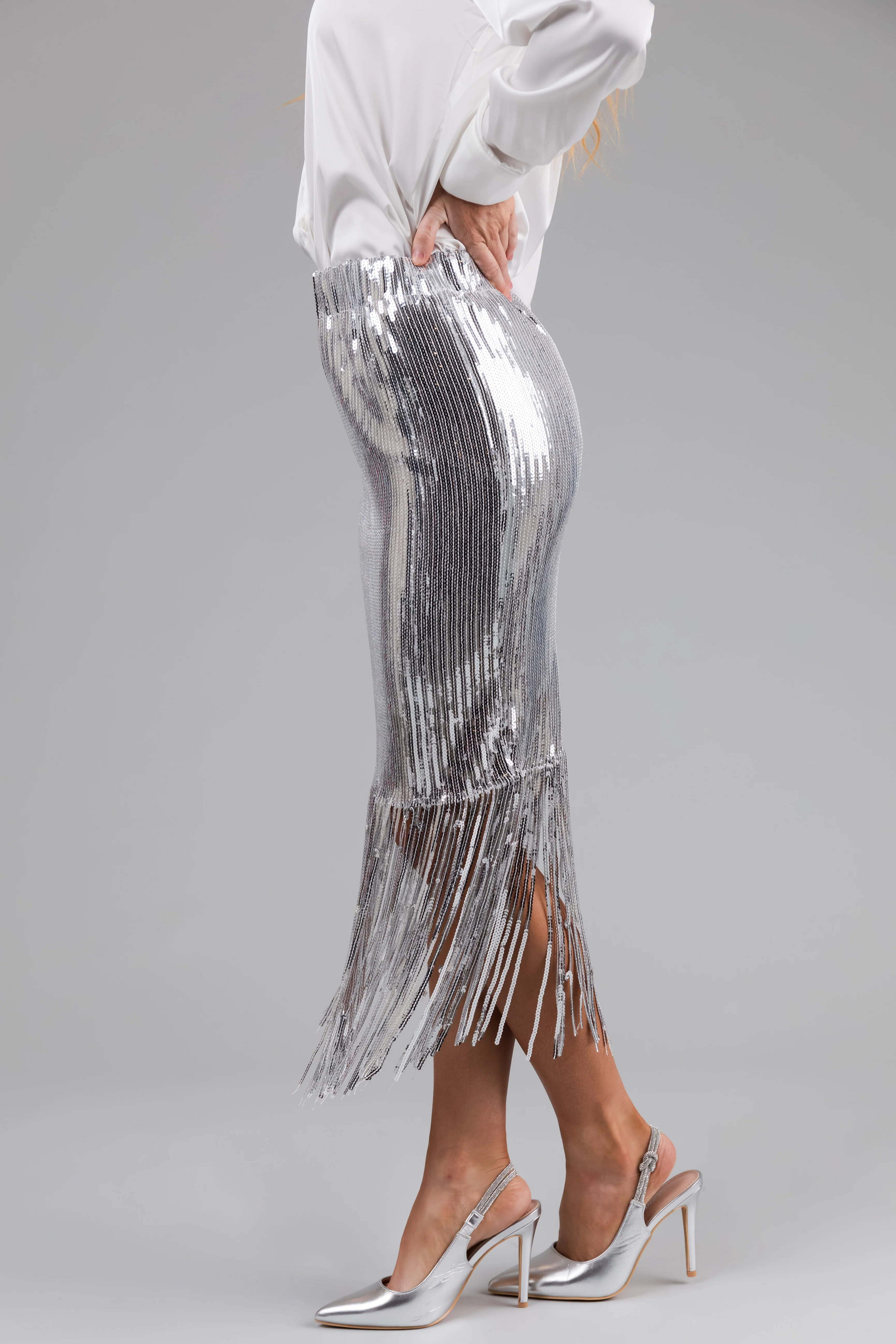 Silver Sequin Fringe Hemline Midi Skirt