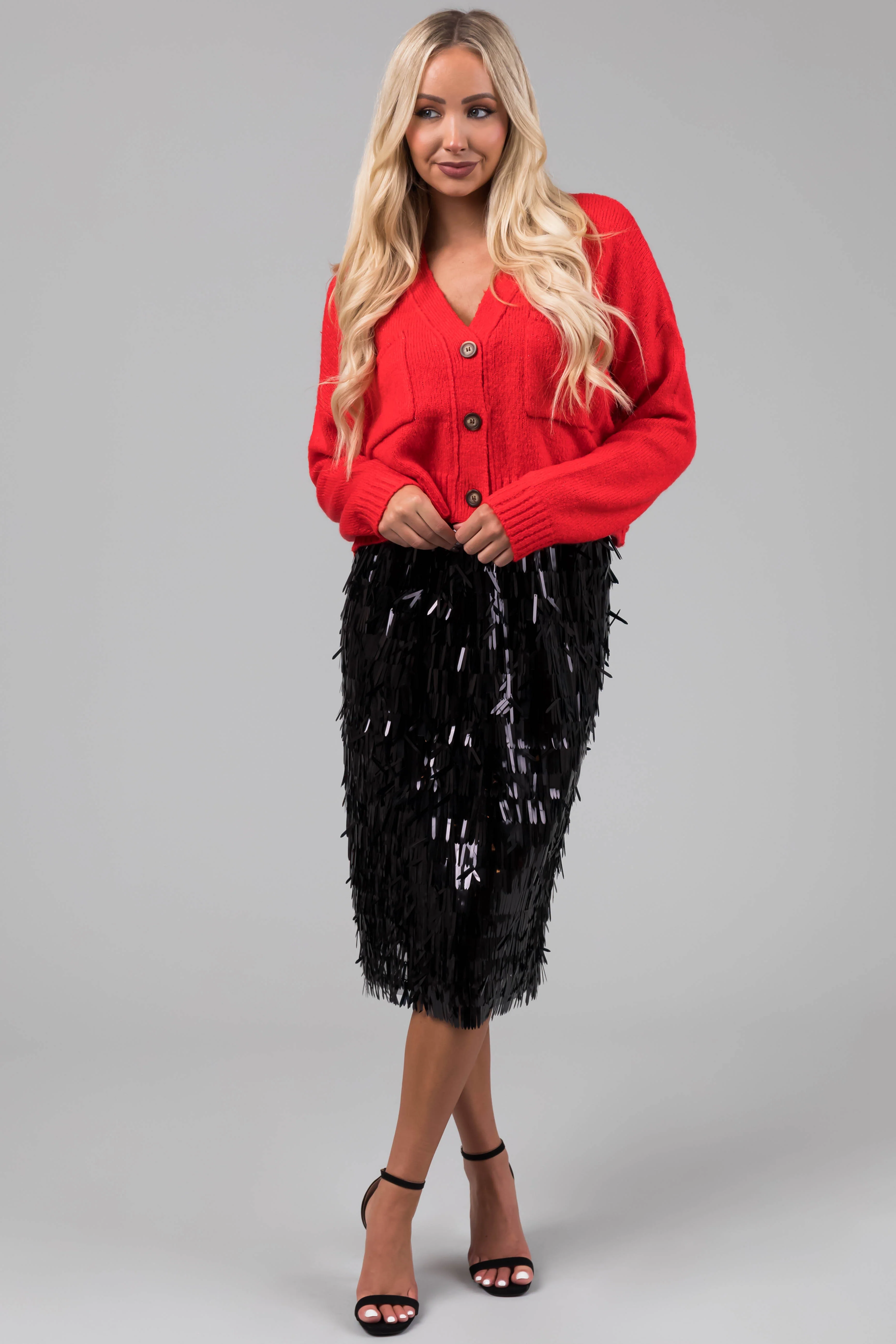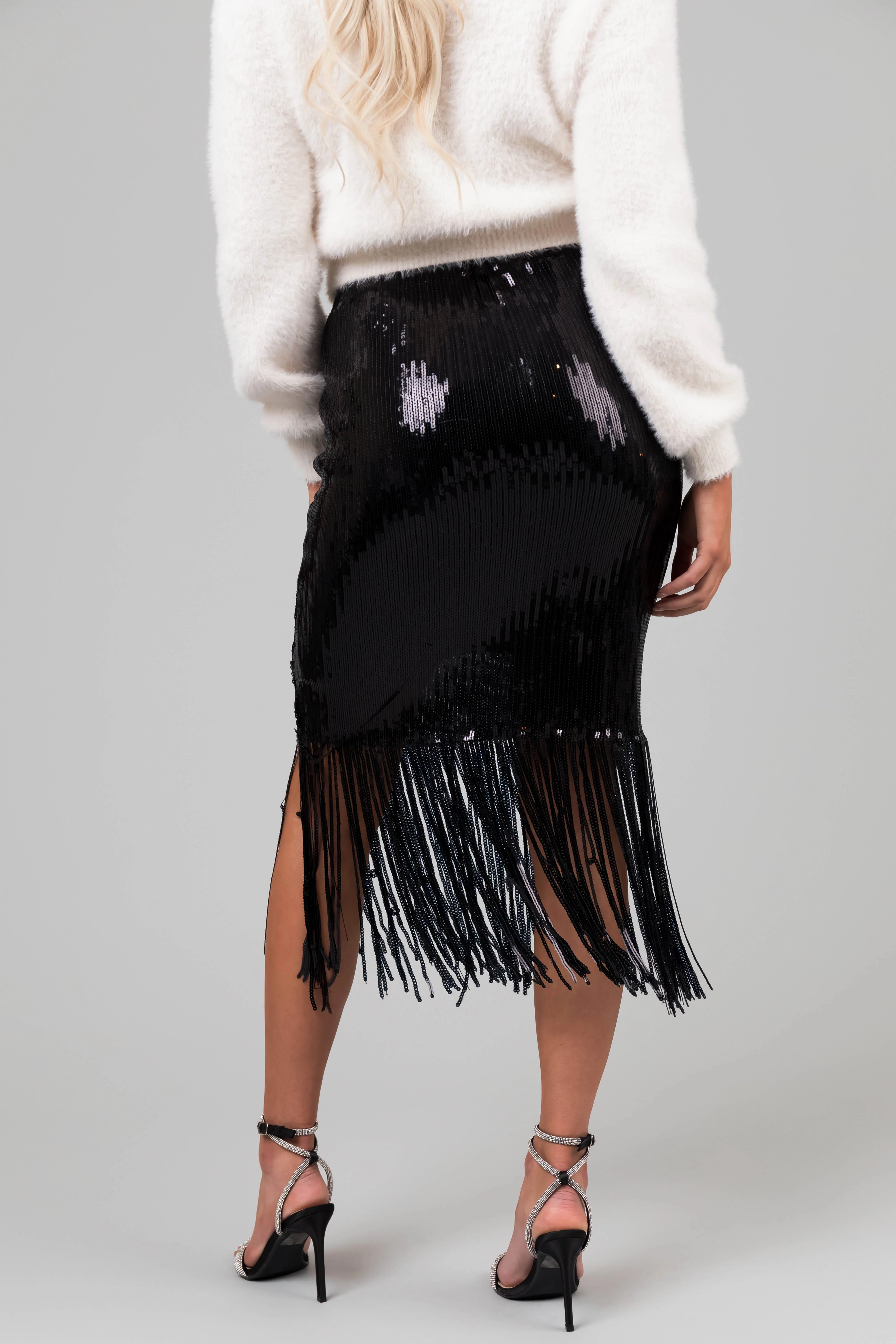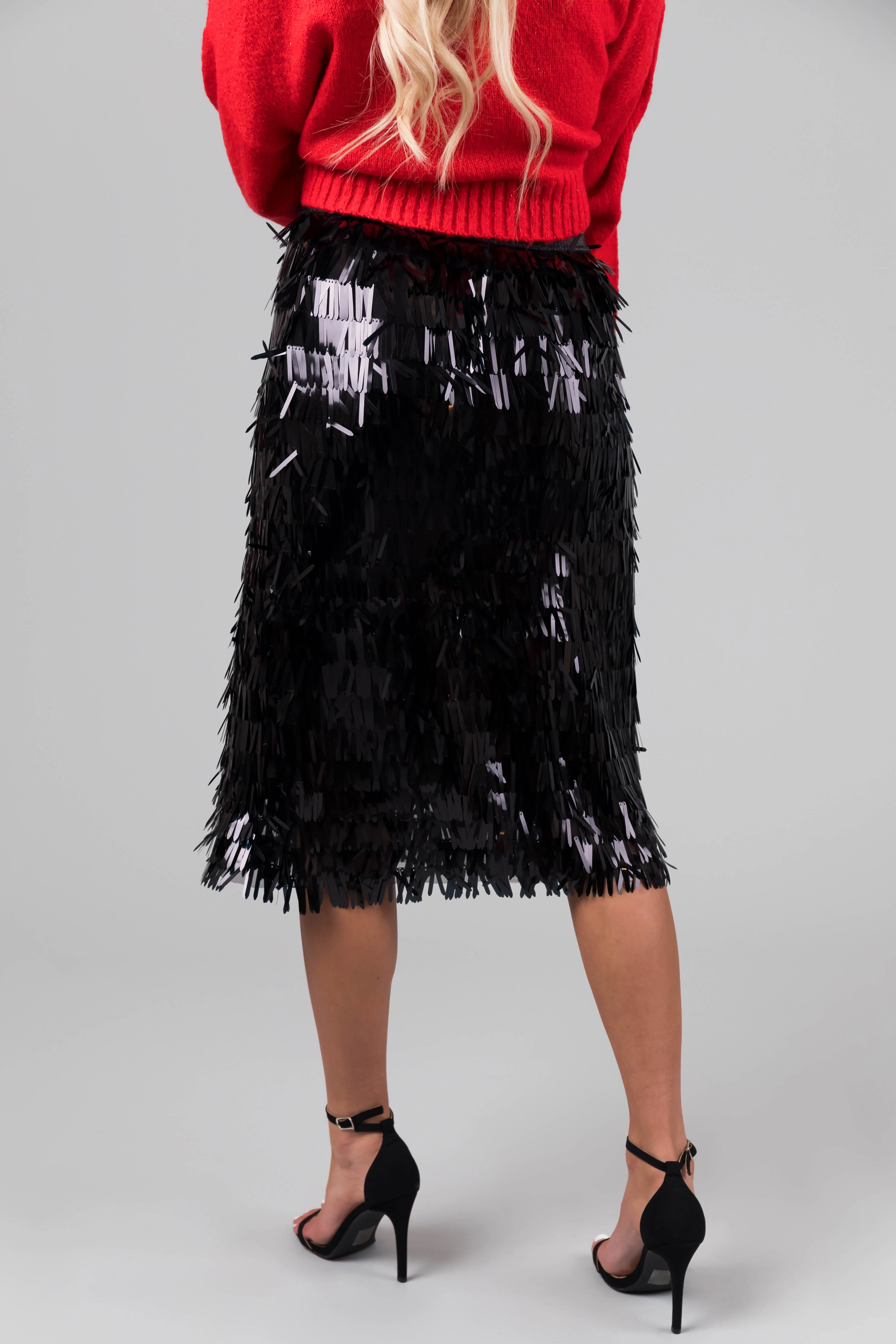 Black Sequin Fringe Hemline Midi Skirt