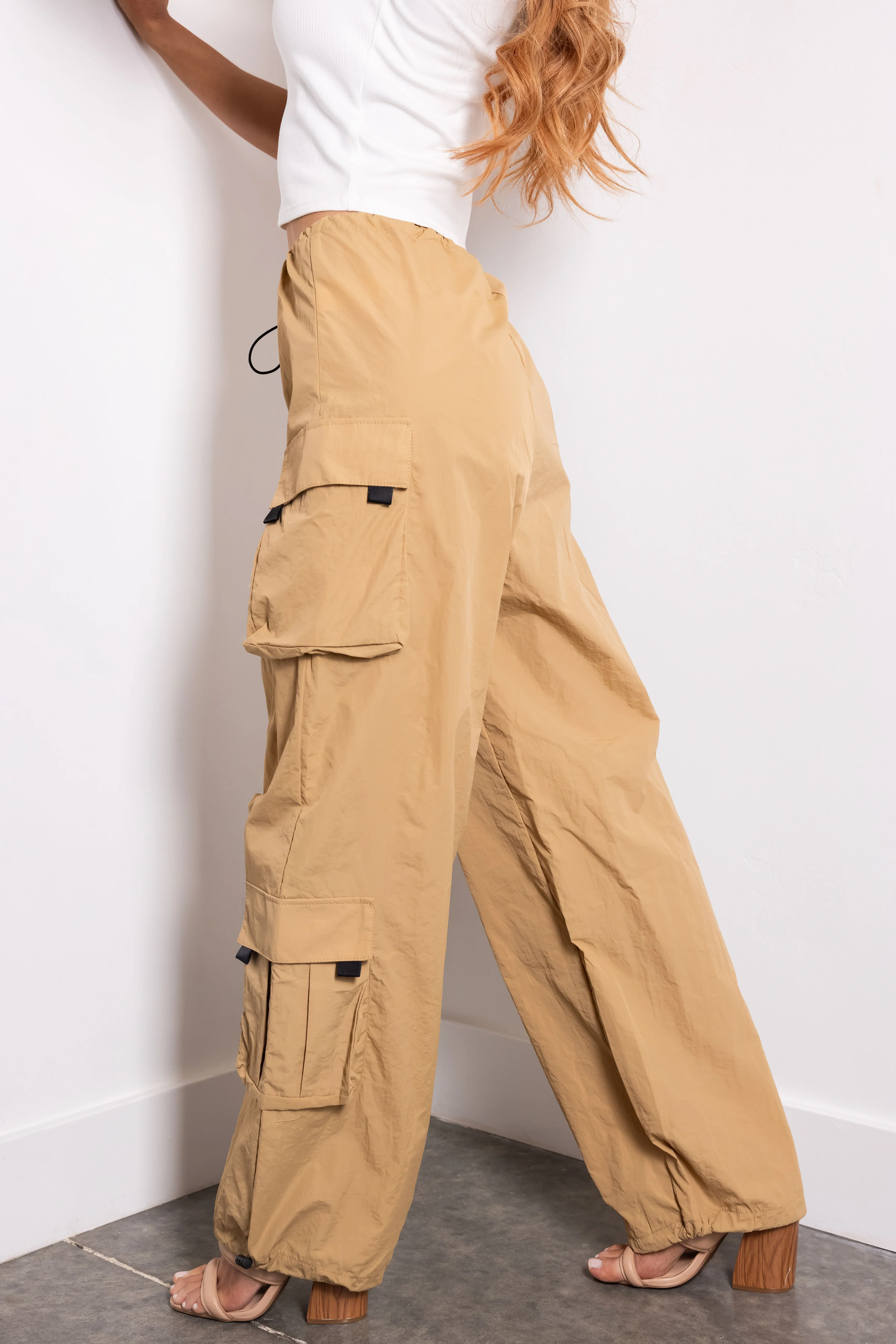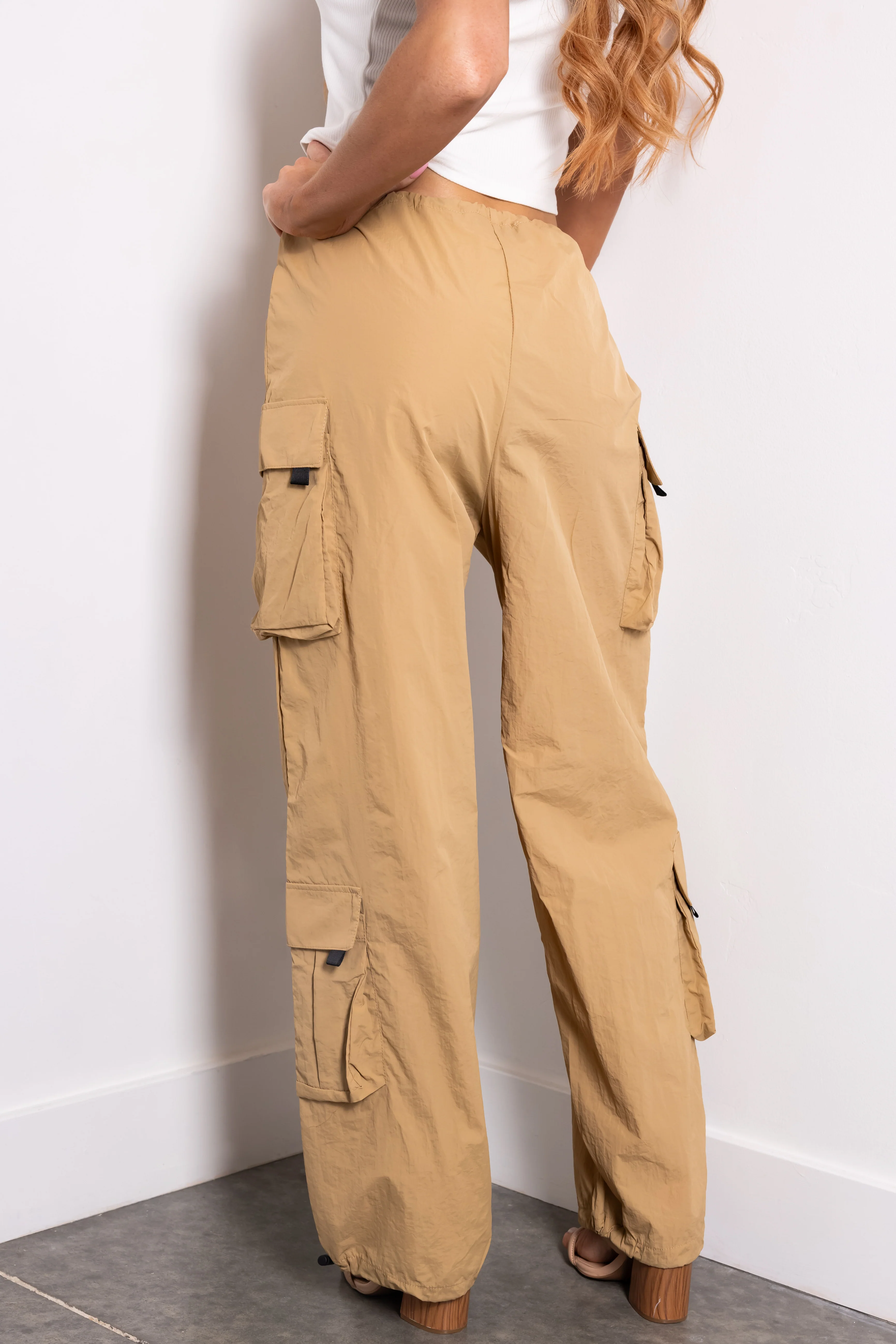 Camel Drawstring Cargo Parachute Pants