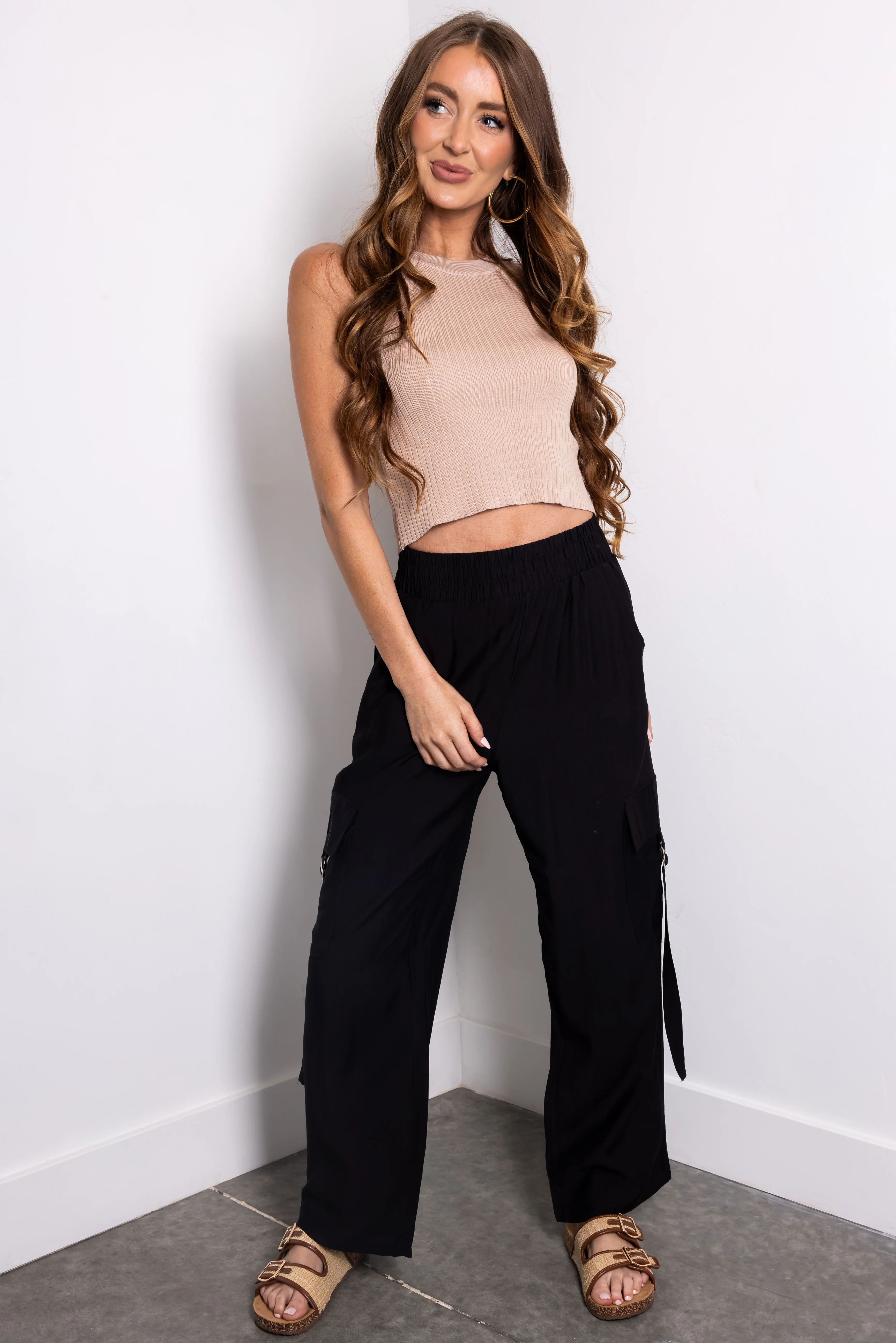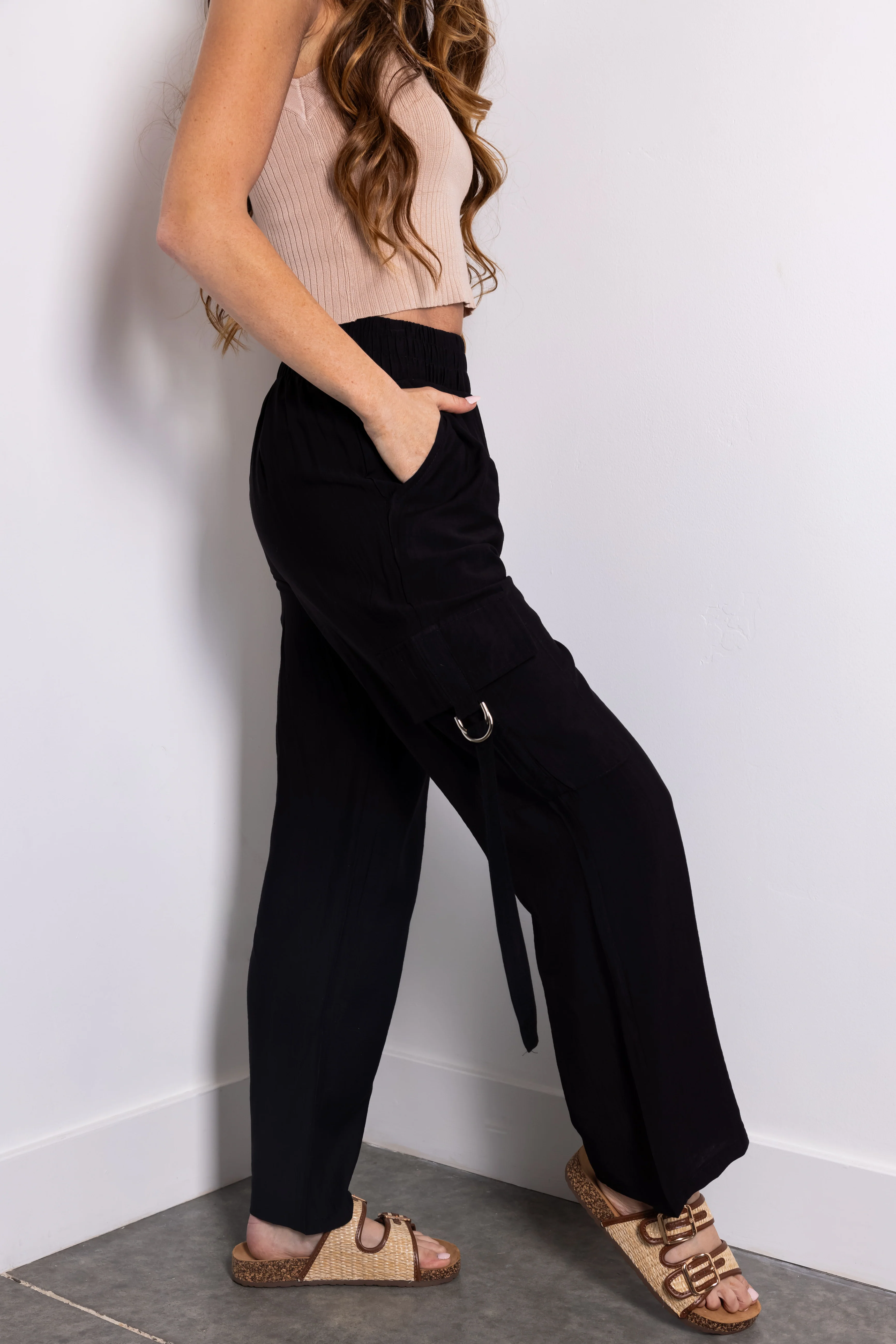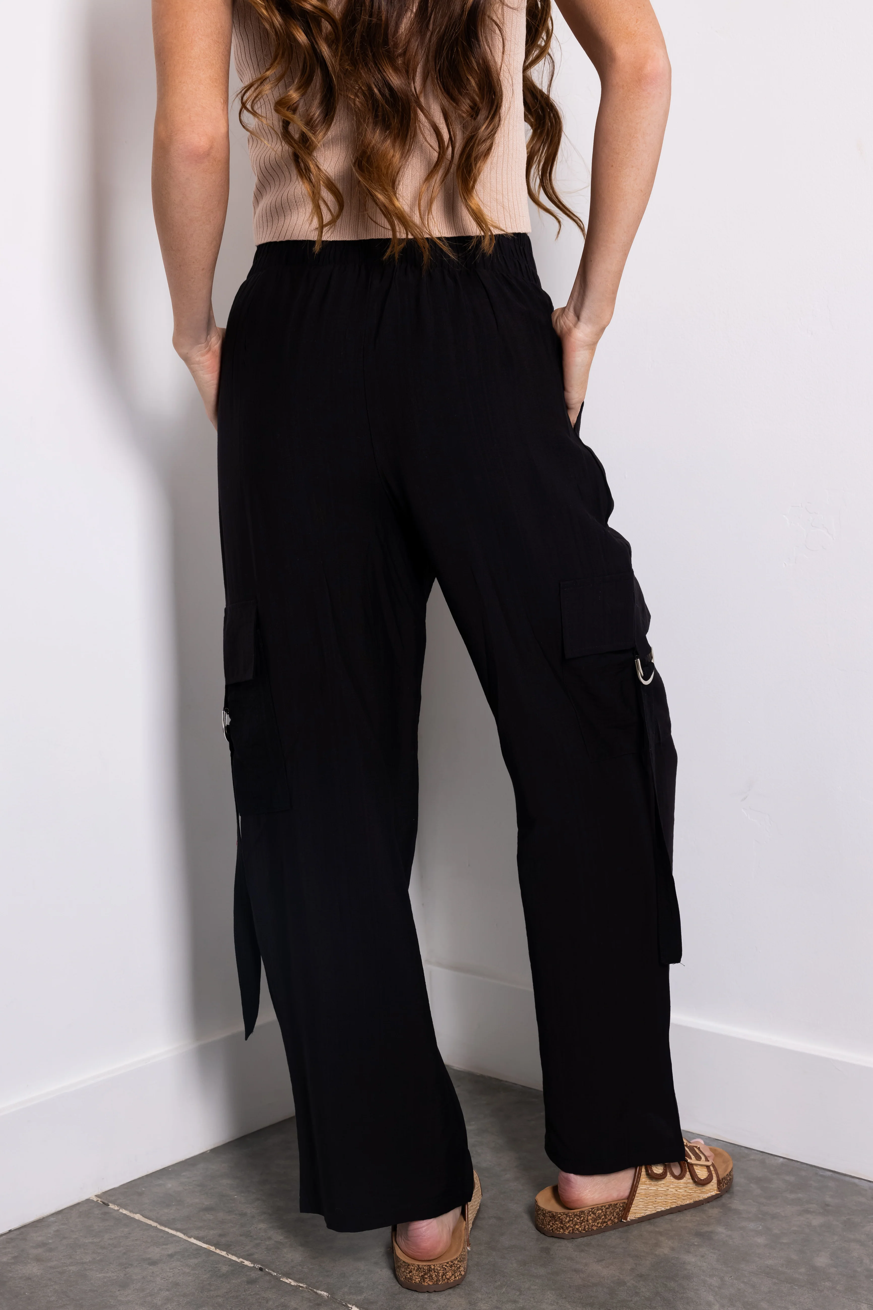 Black Faux Linen Wide Leg Cargo Pants