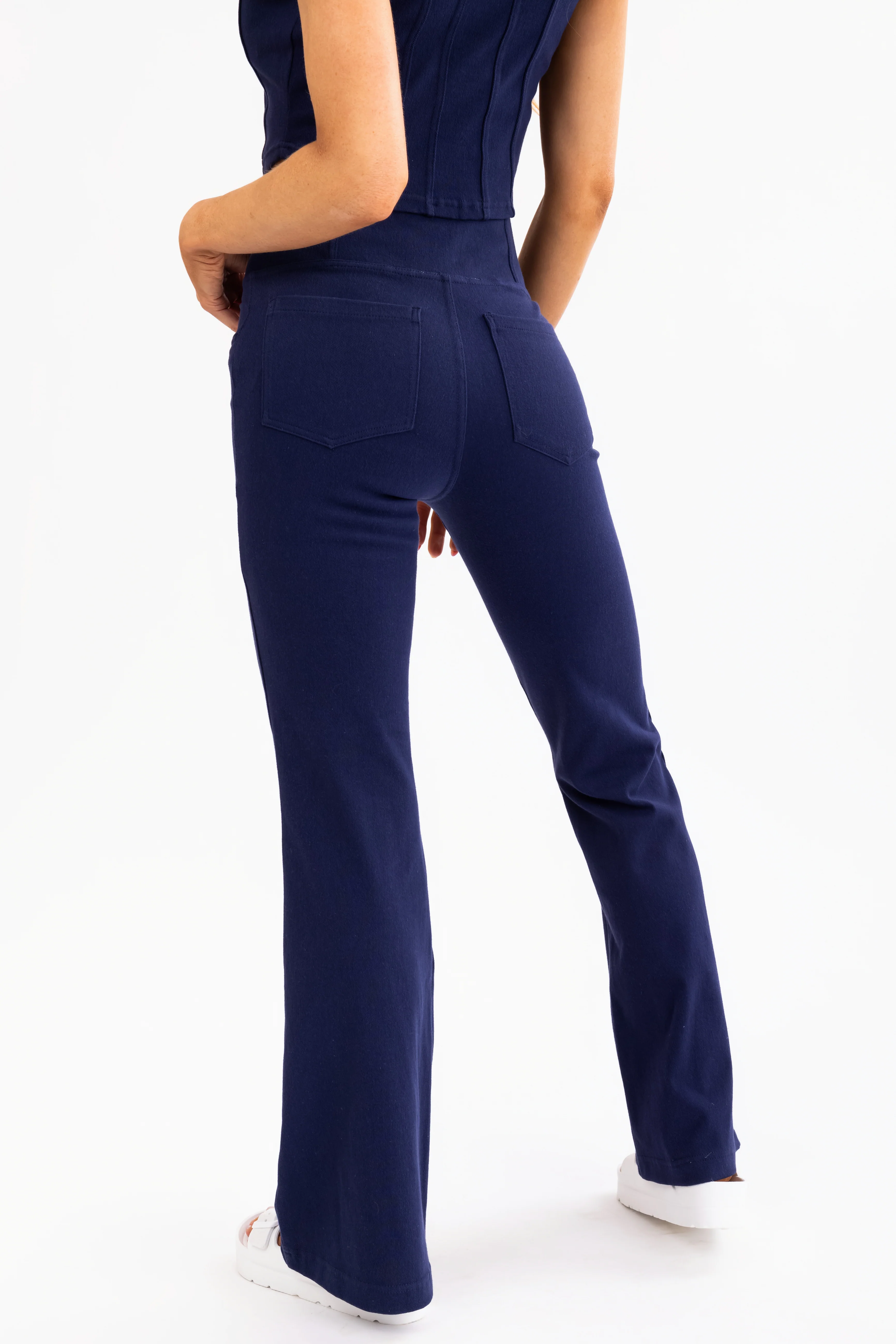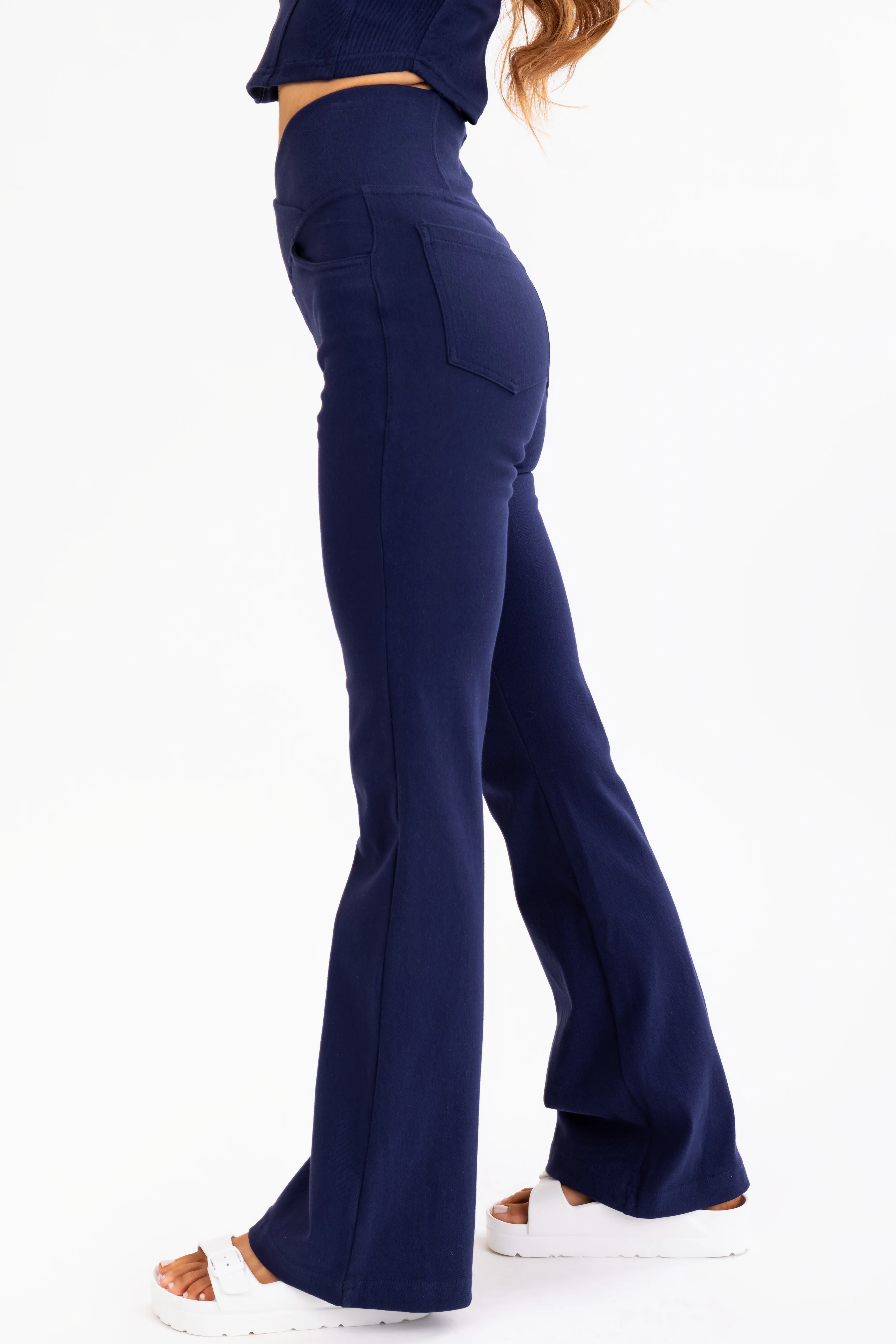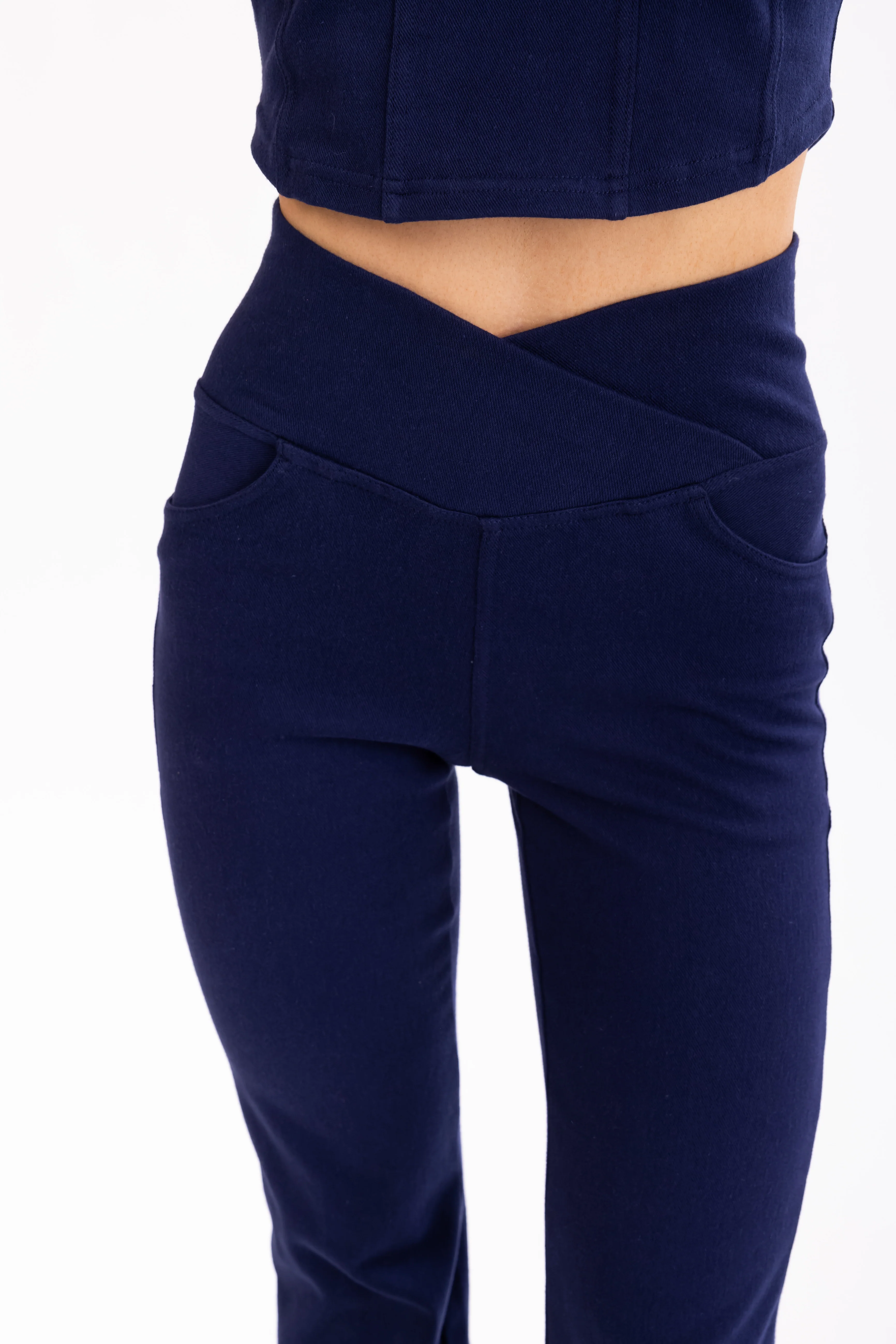 Navy Flared Leg Crossover Waist Knit Pants
