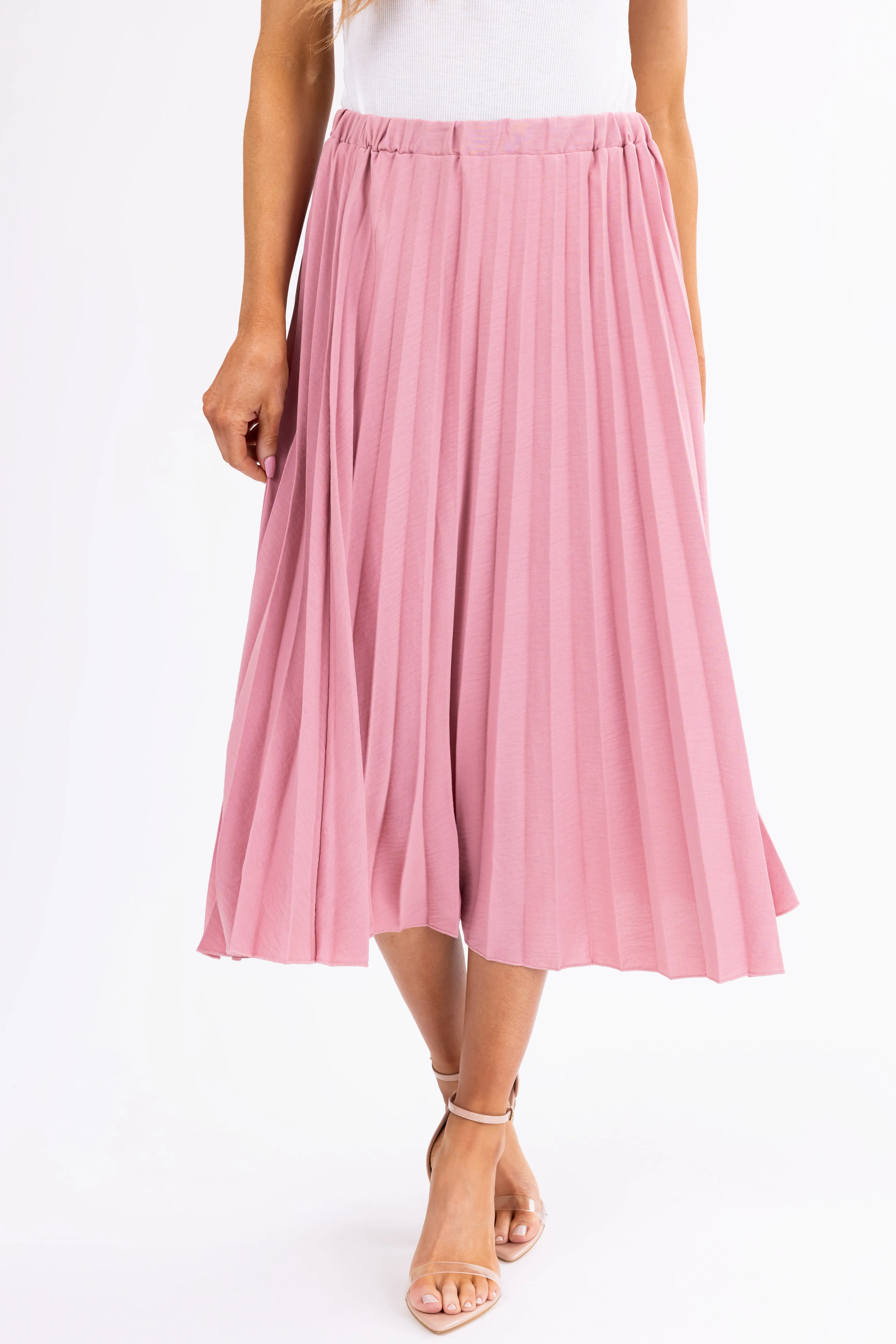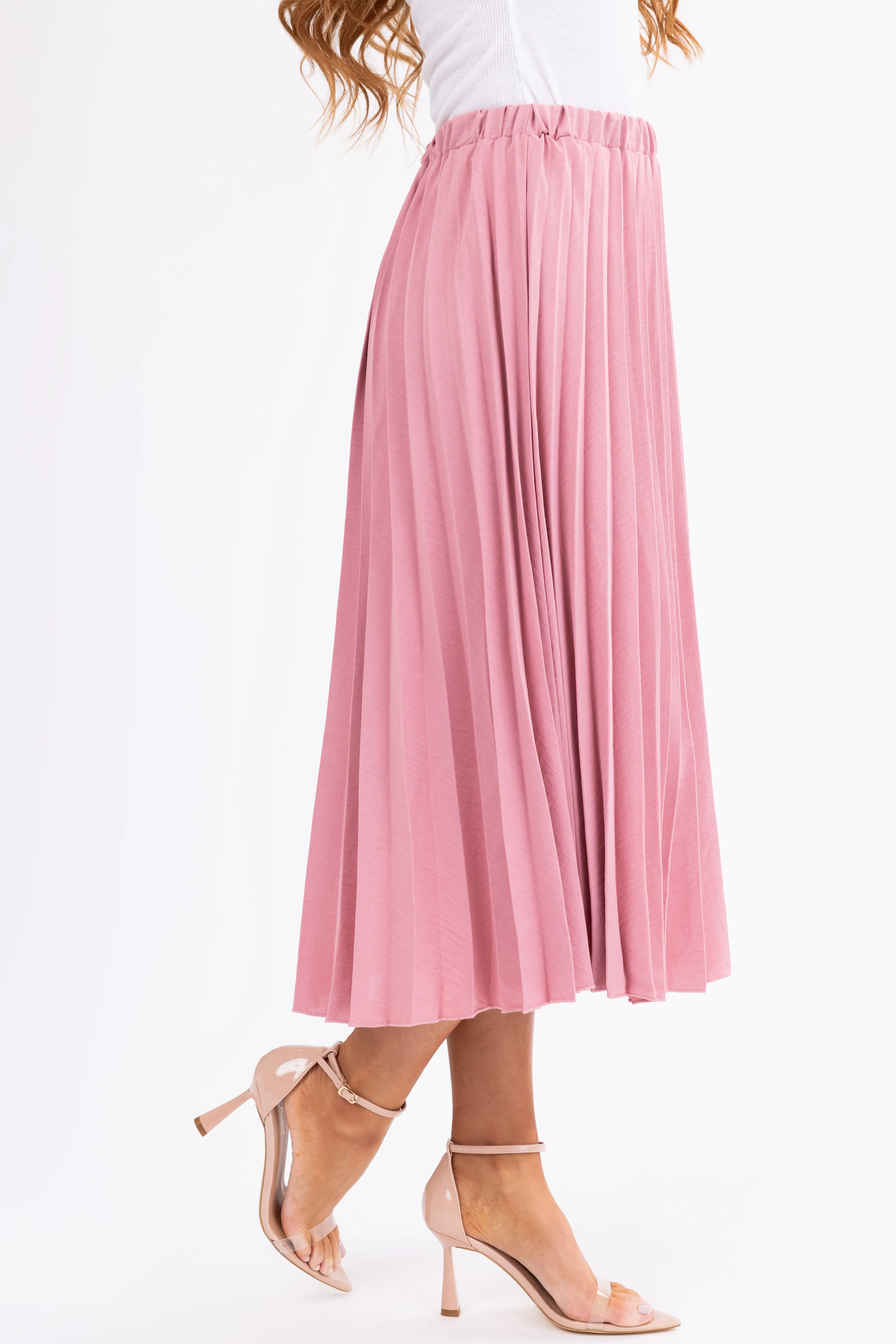 Hazy Pink Pleated Elastic Waist Midi Skirt