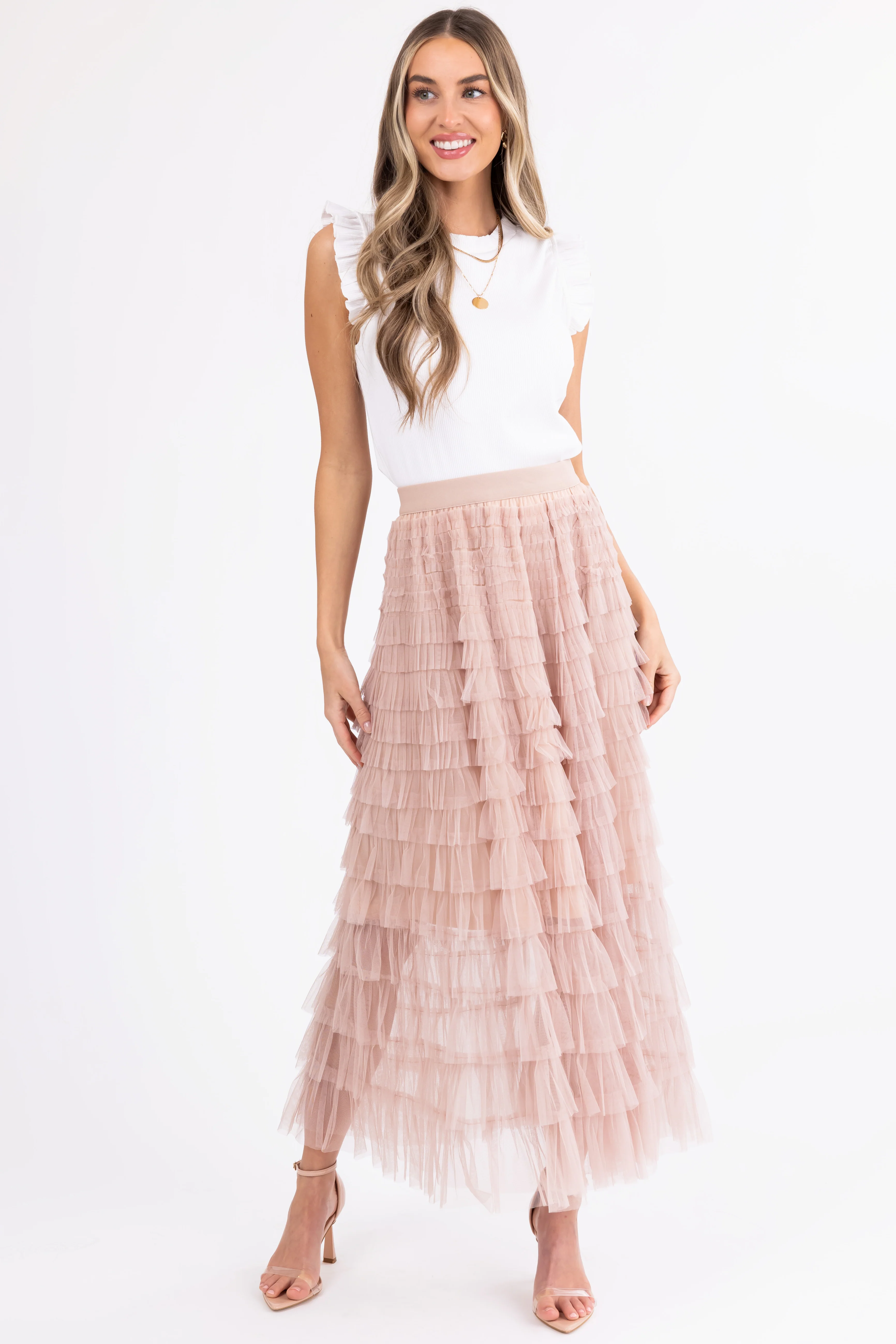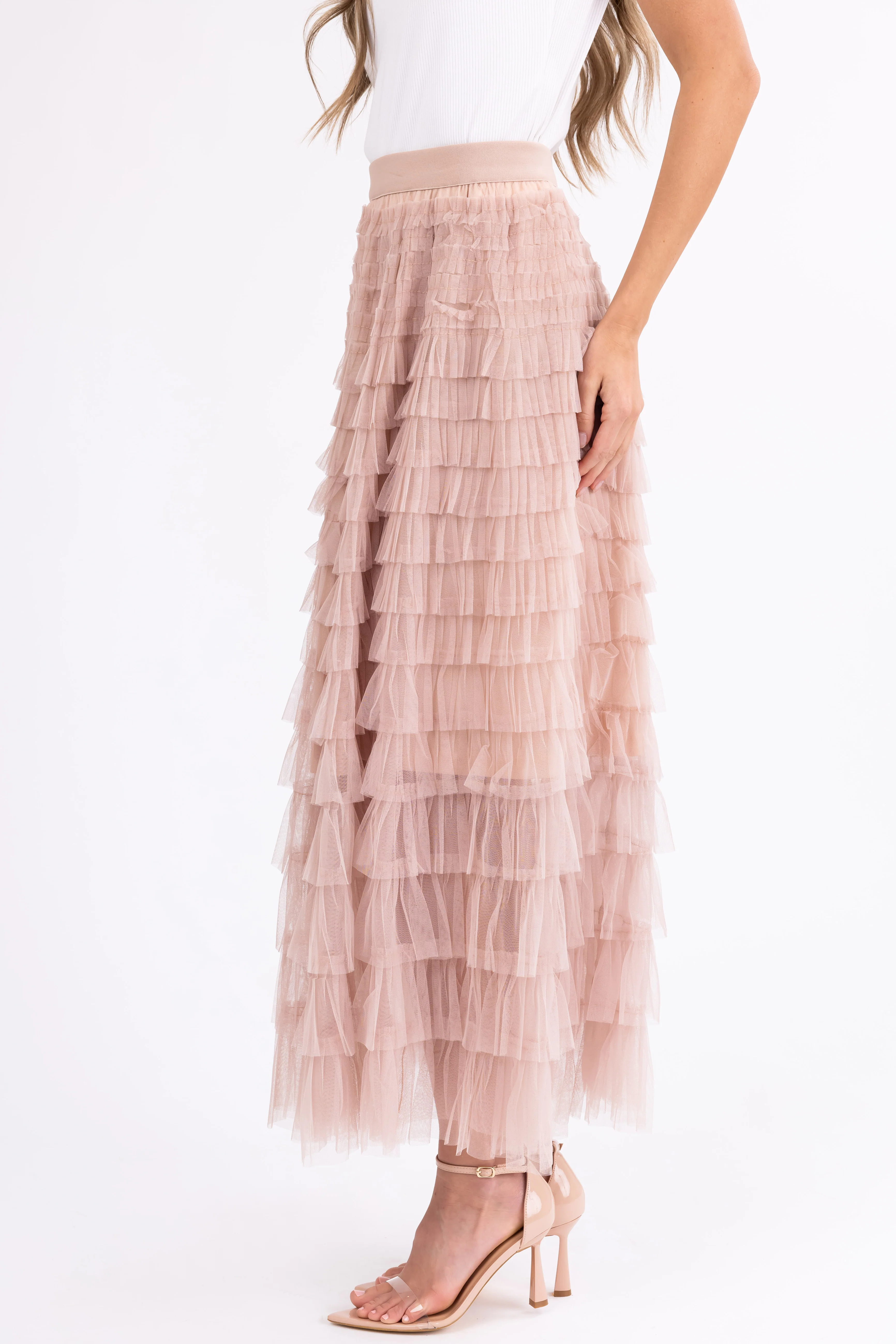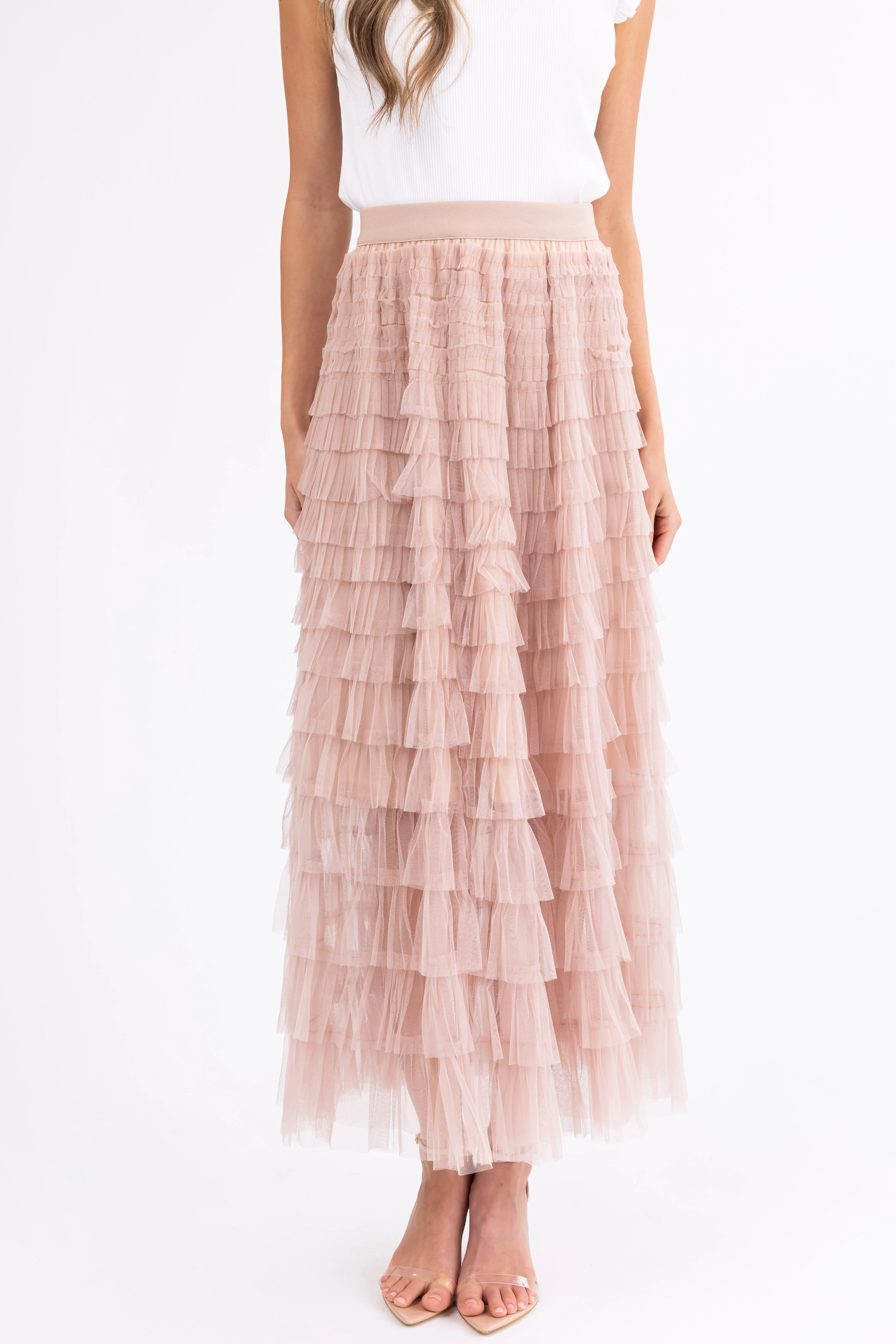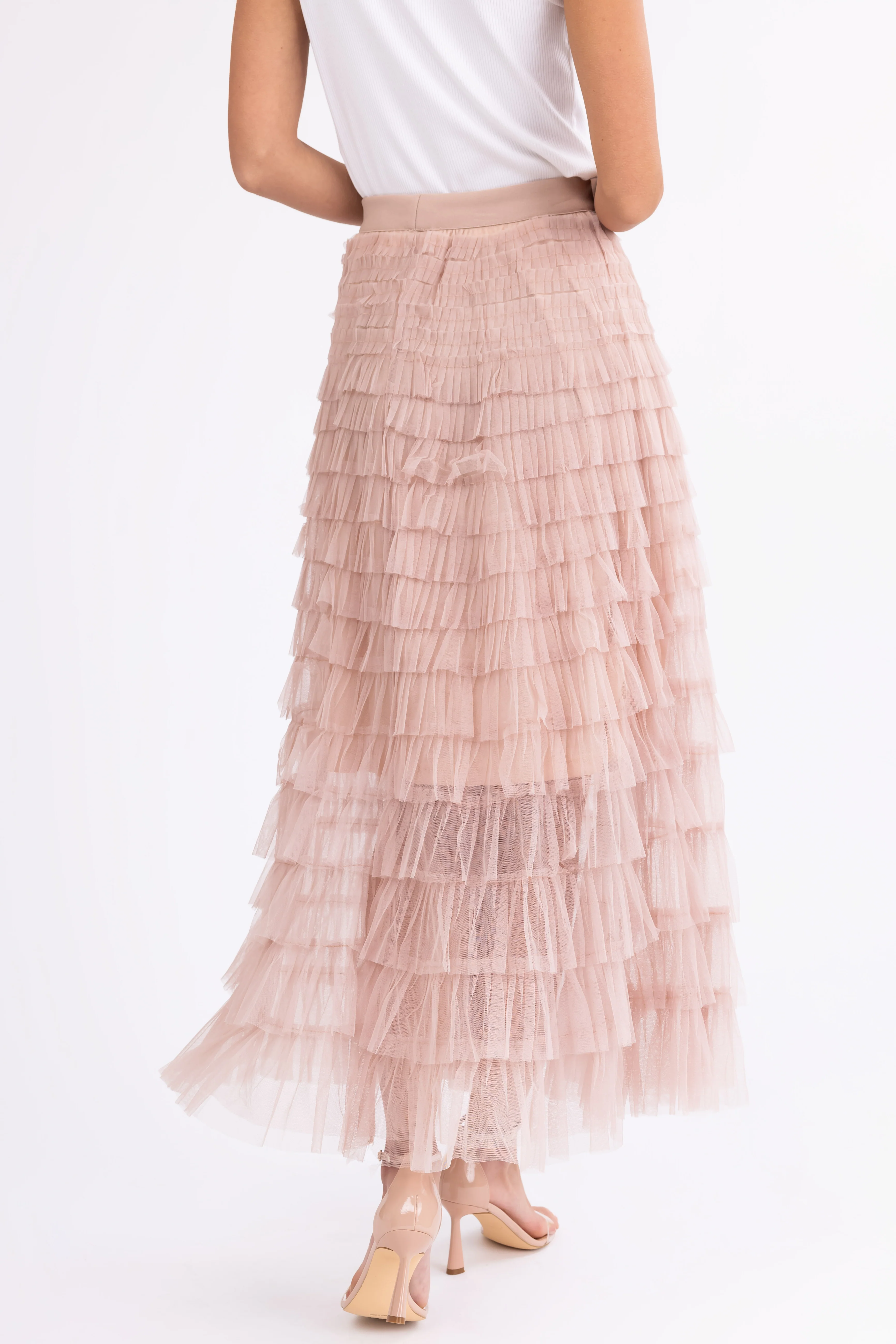 Nude Ruffle Tulle Elastic Maxi Skirt
