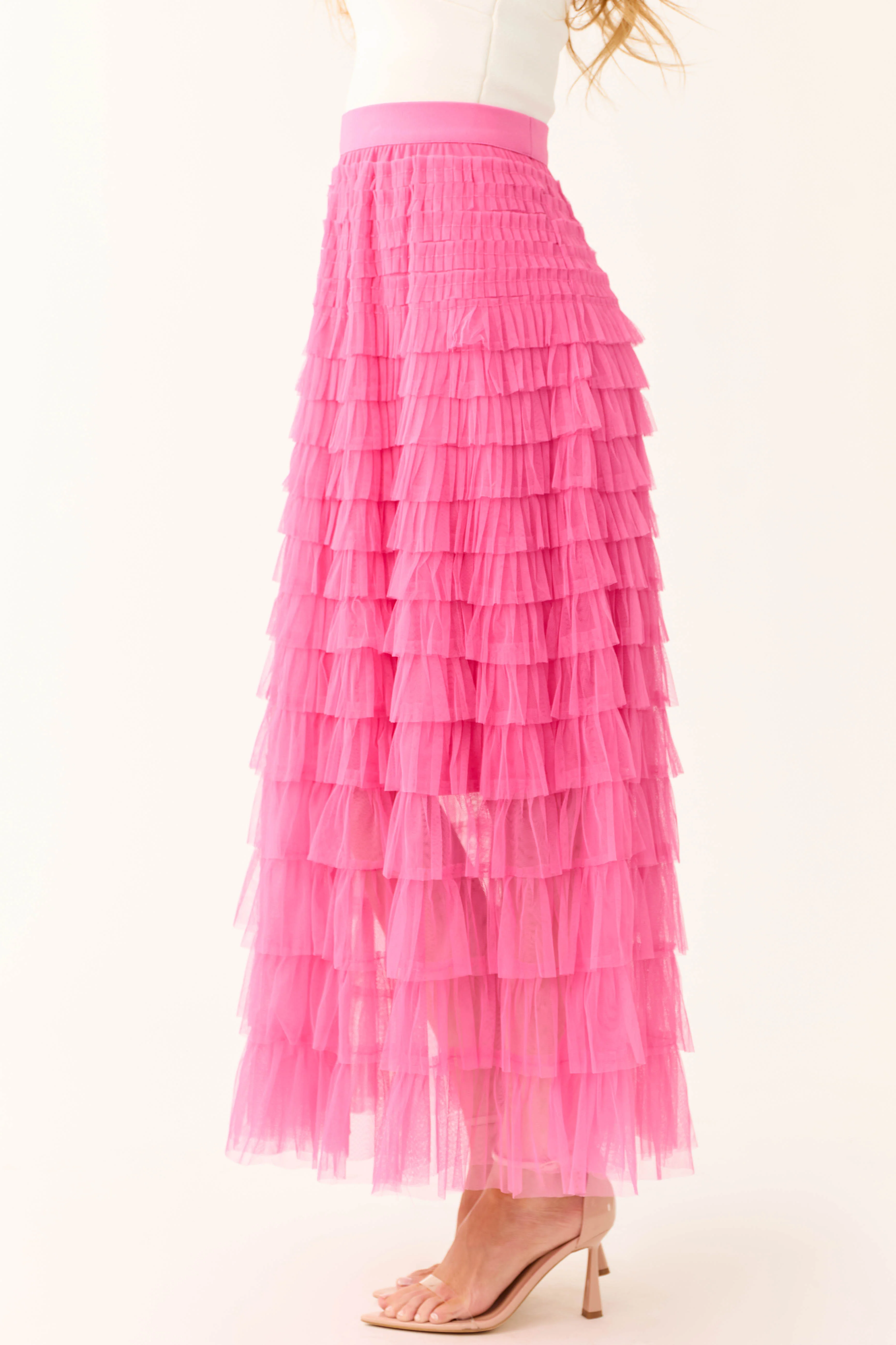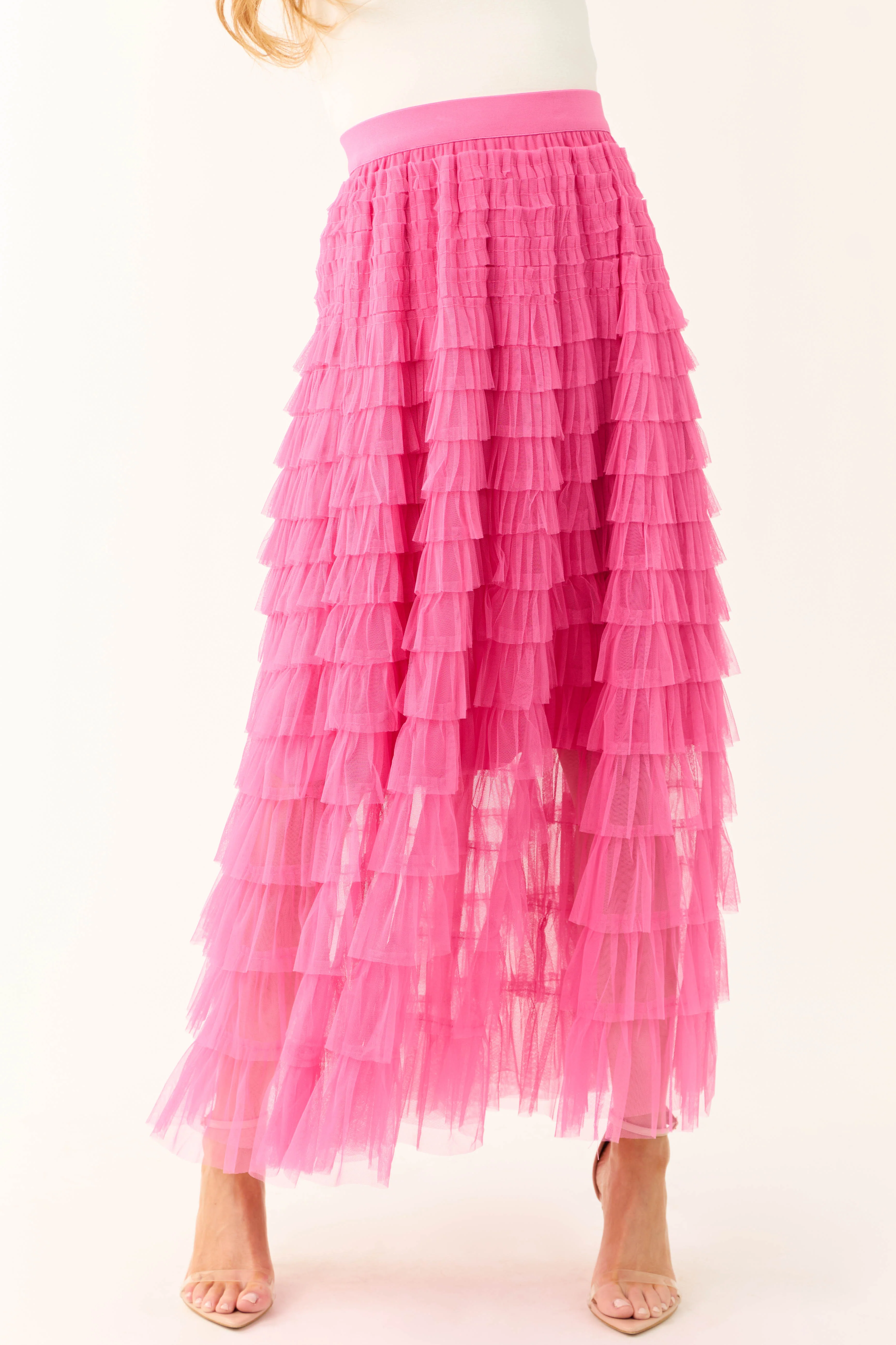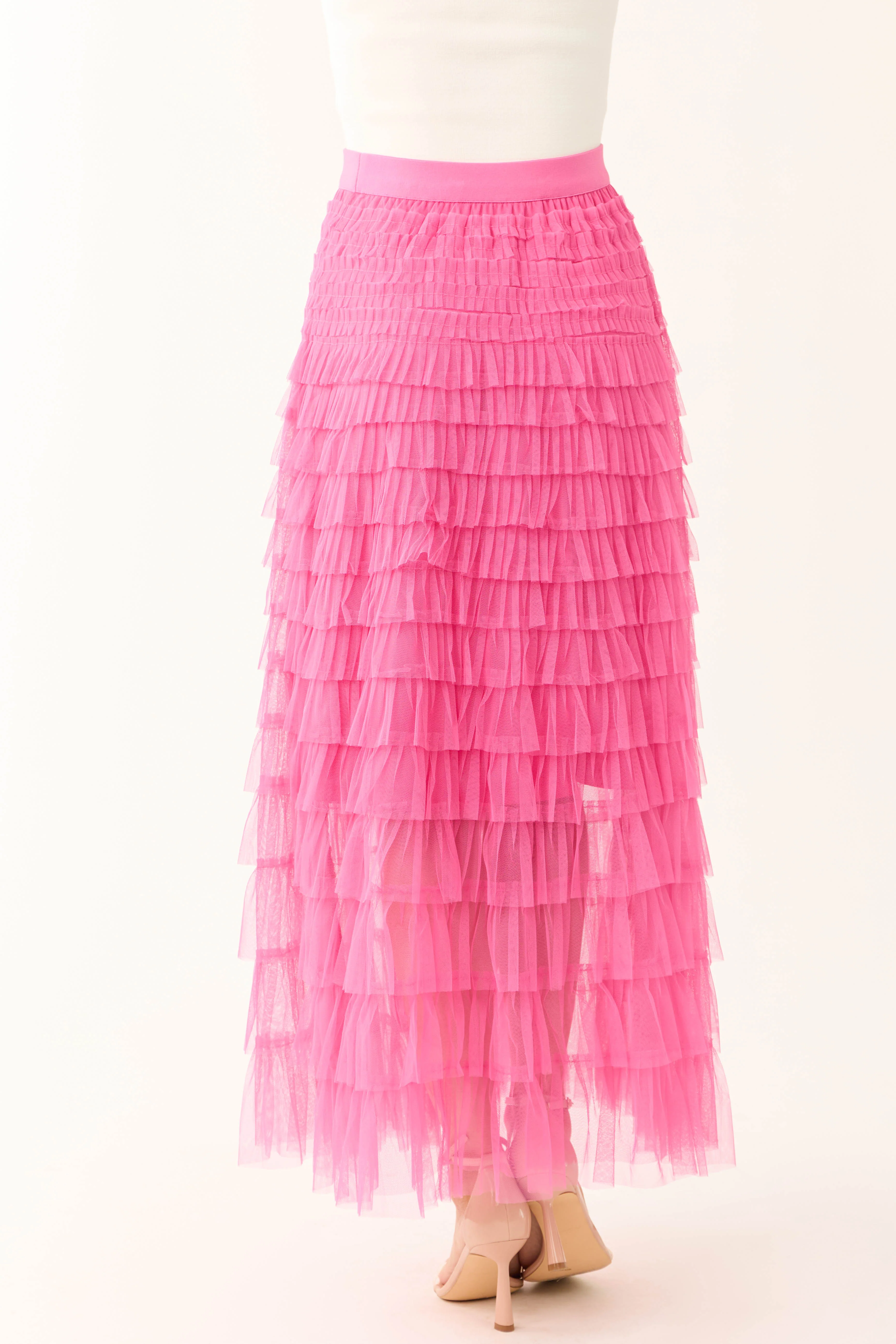 Magenta Ruffle Tulle Elastic Maxi Skirt