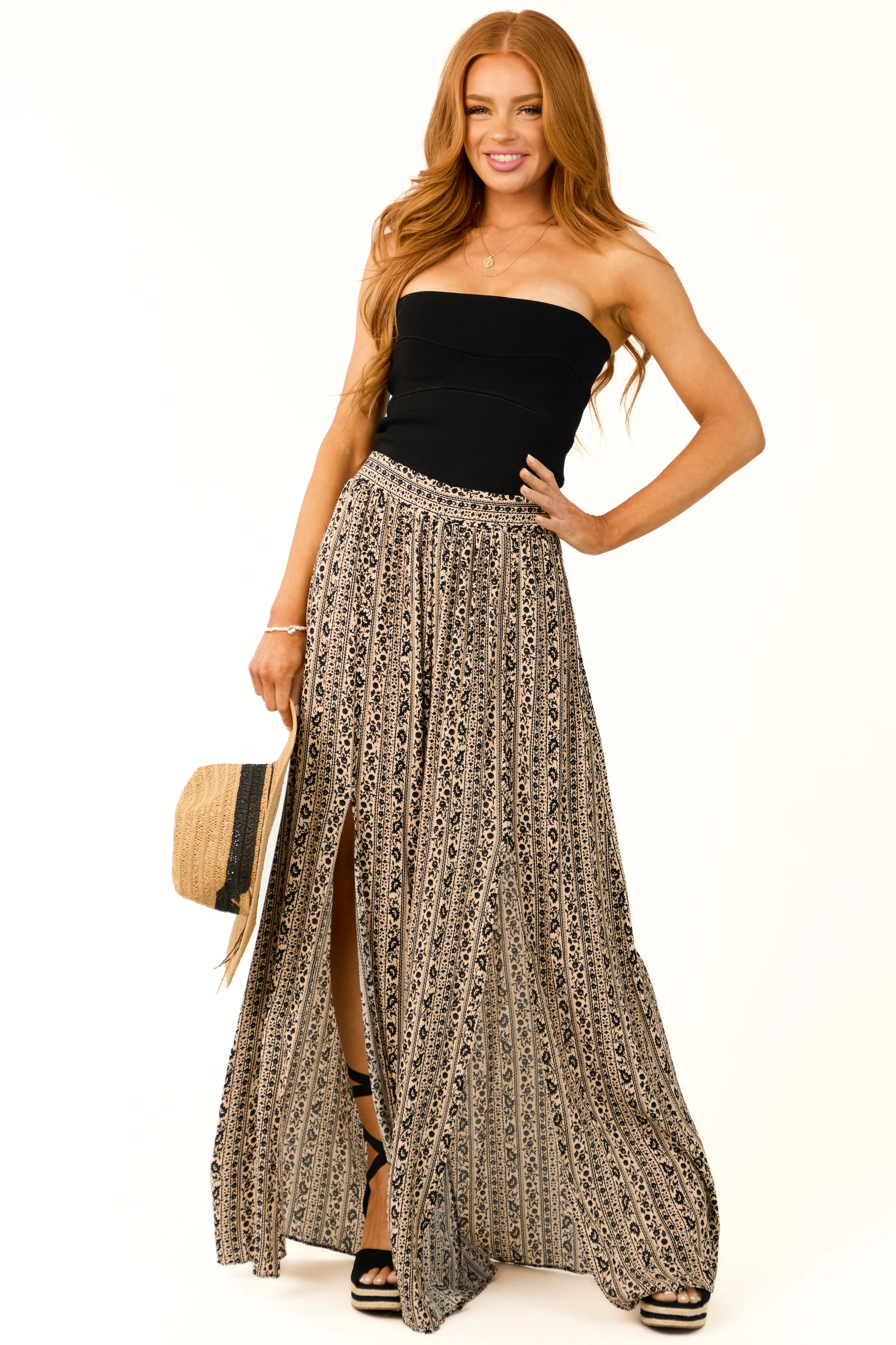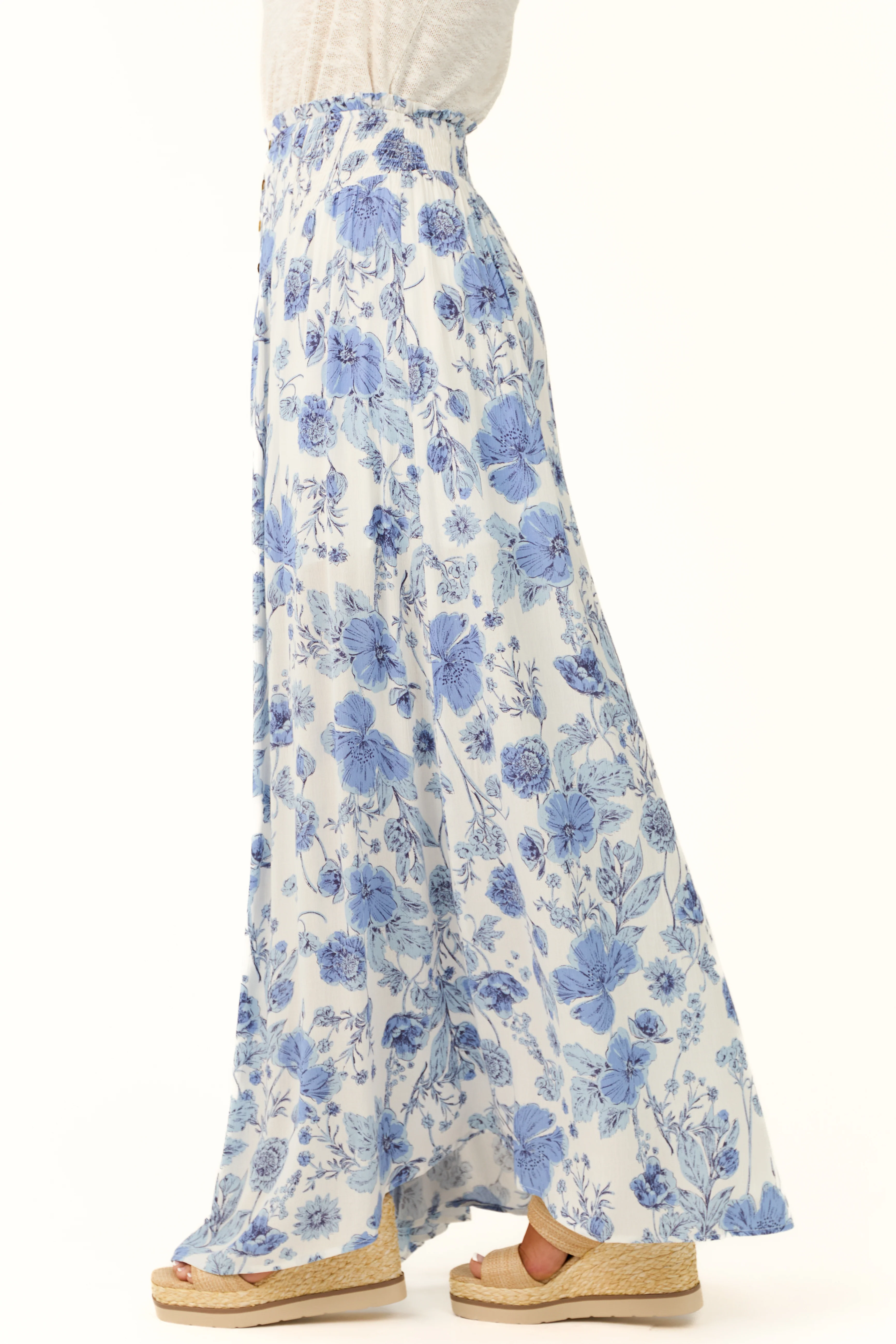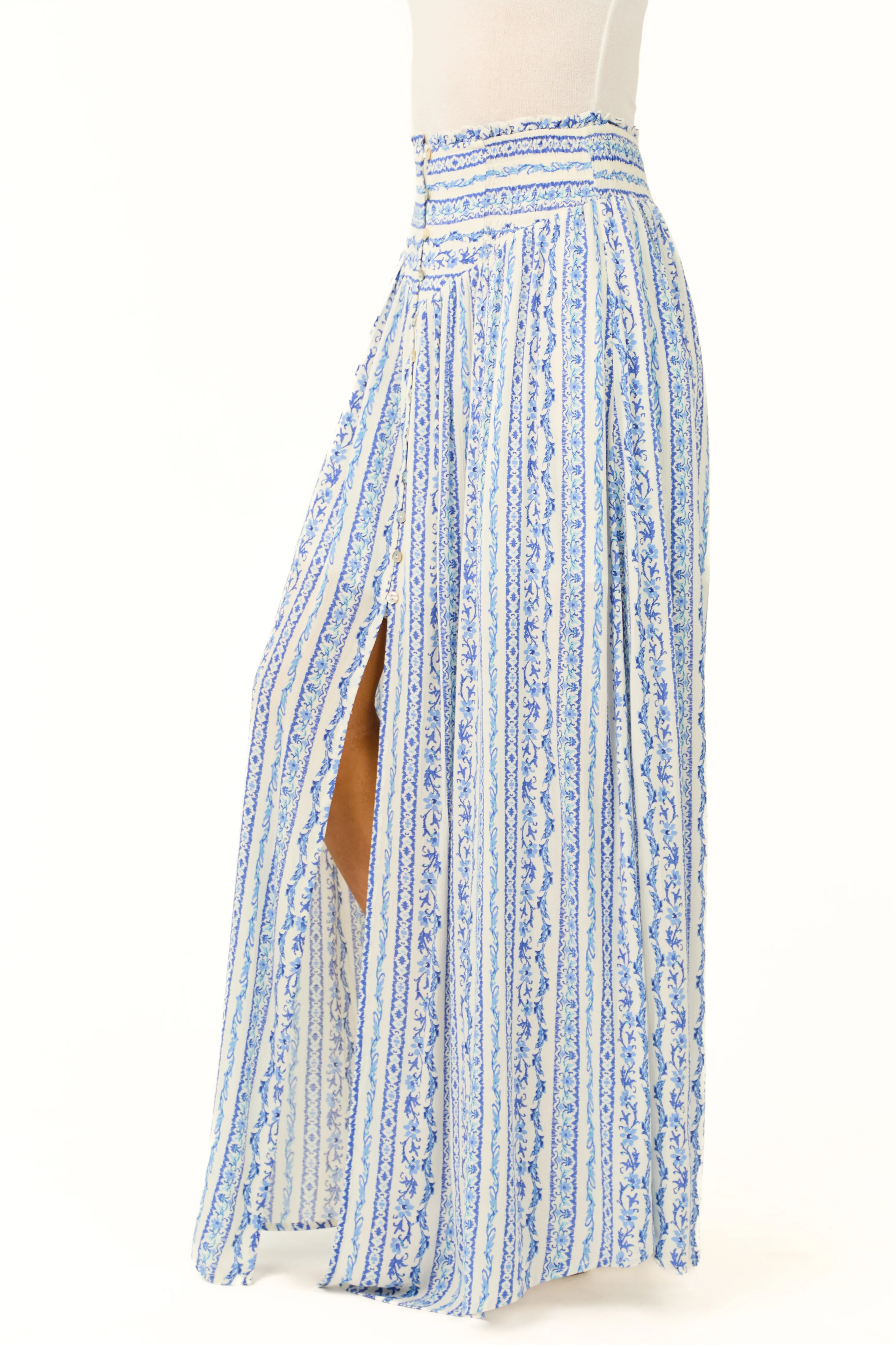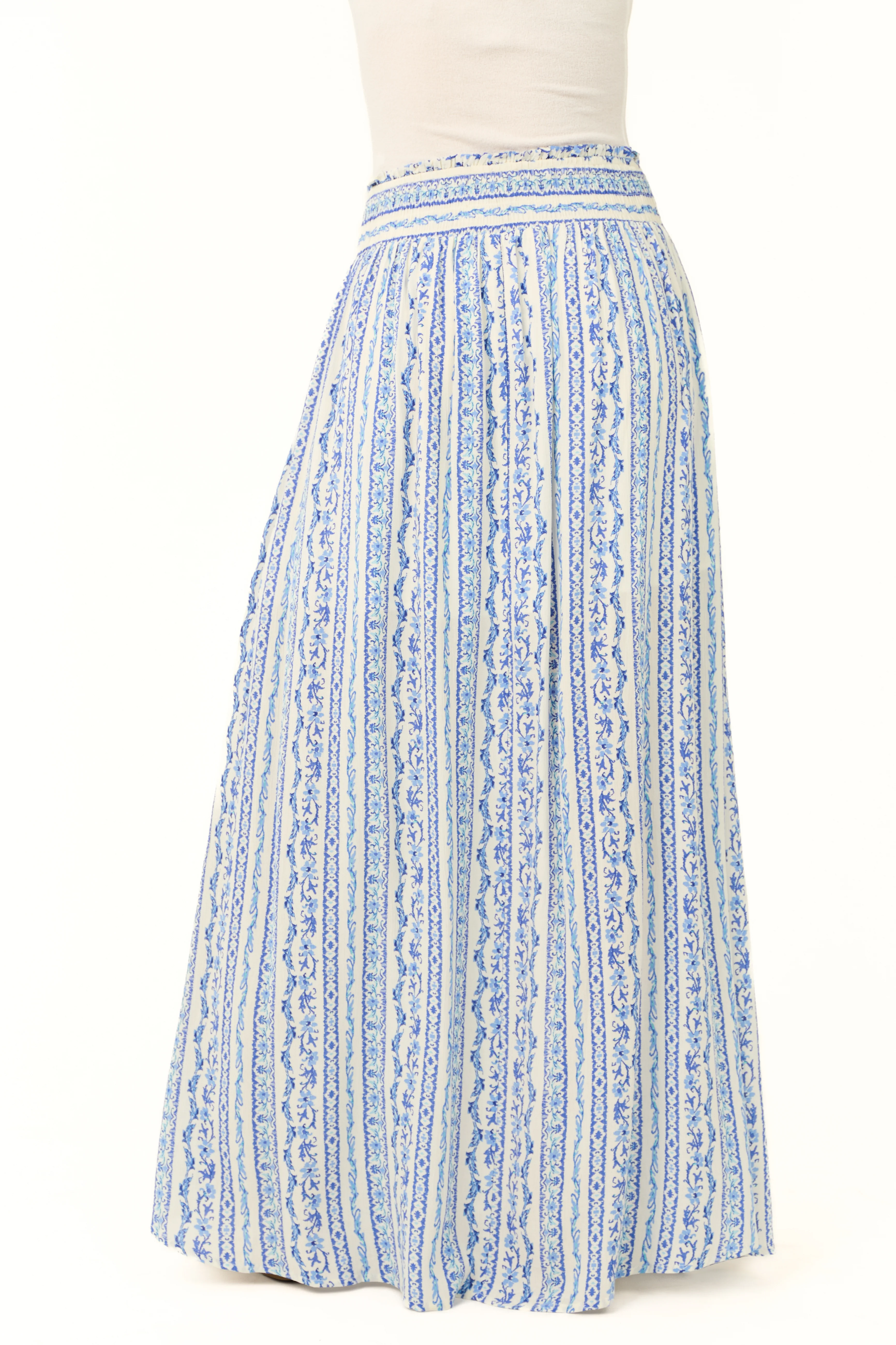 Ivory Floral Print Smocked Waist Maxi Skirt