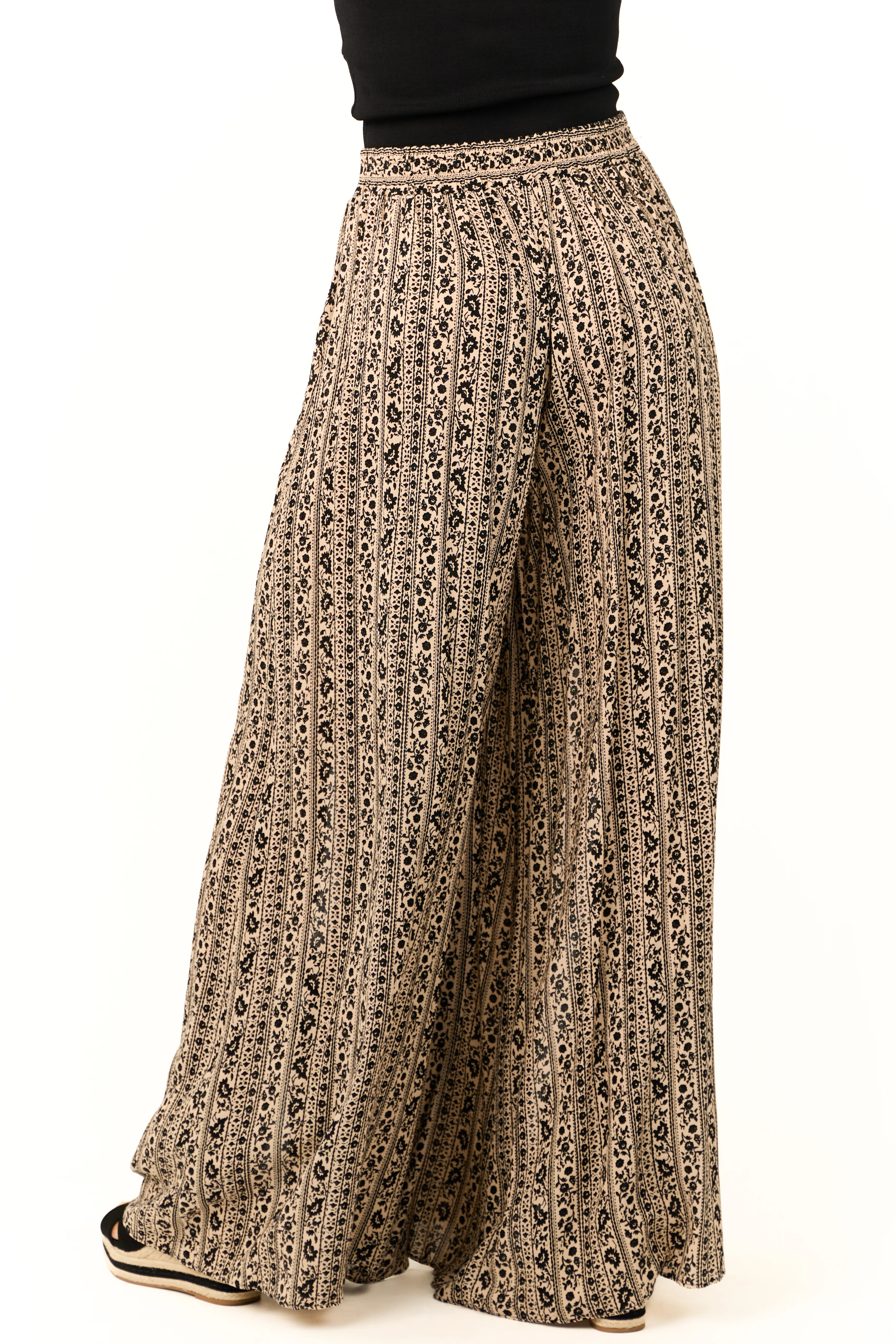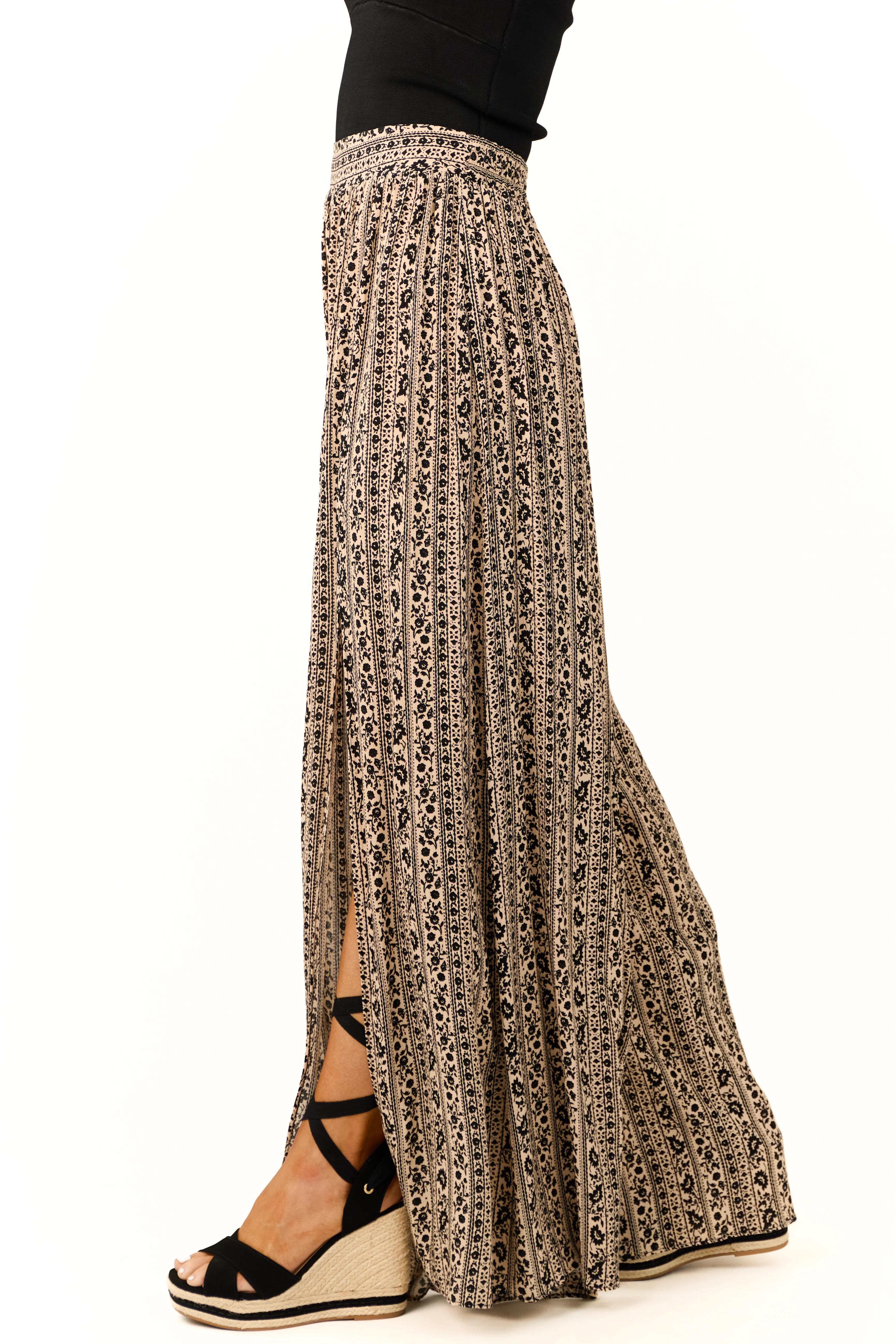 Camel and Black Abstract Print Side Slit Pants