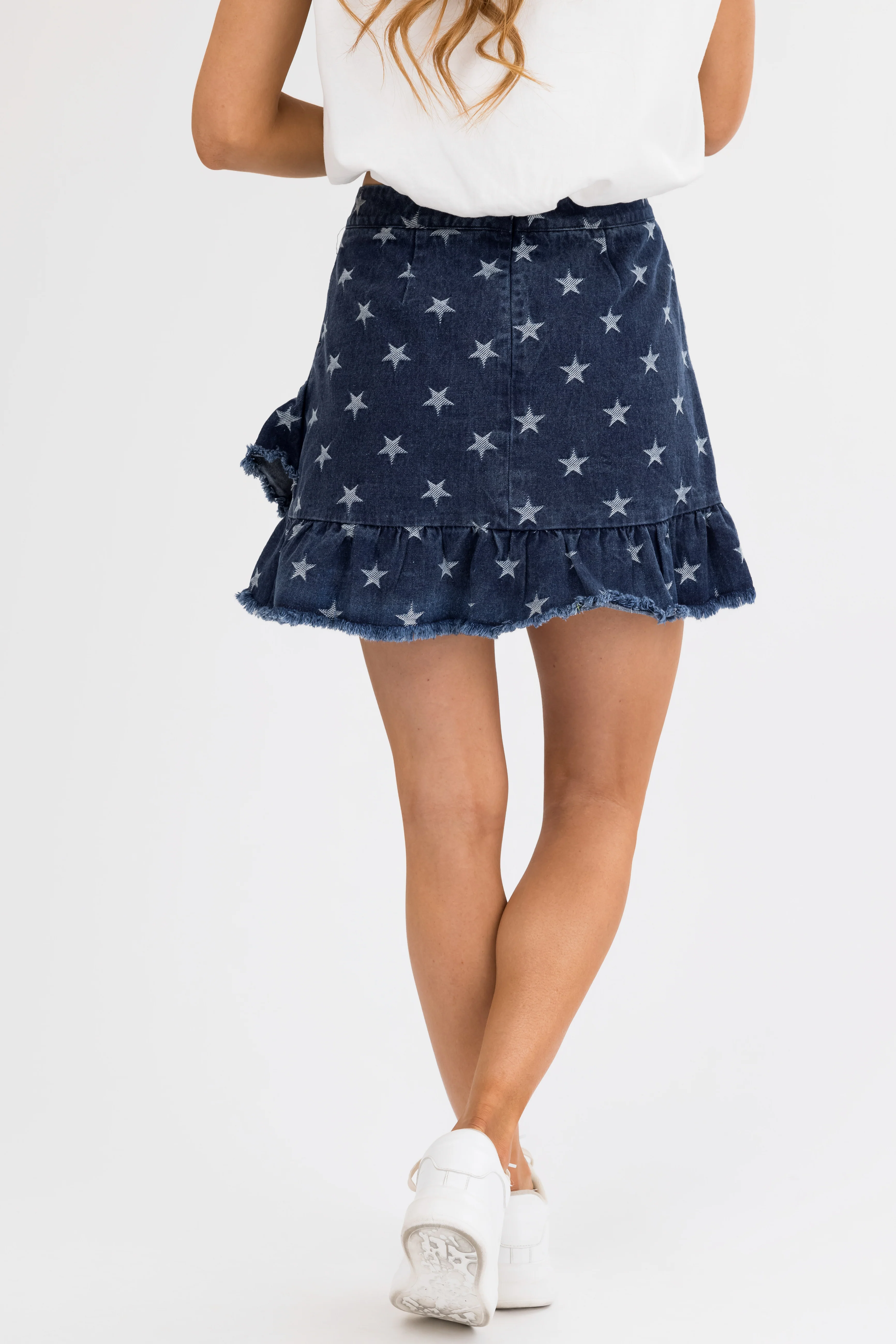 Mittoshop Dark Denim Star Print Frayed Hem Skirt