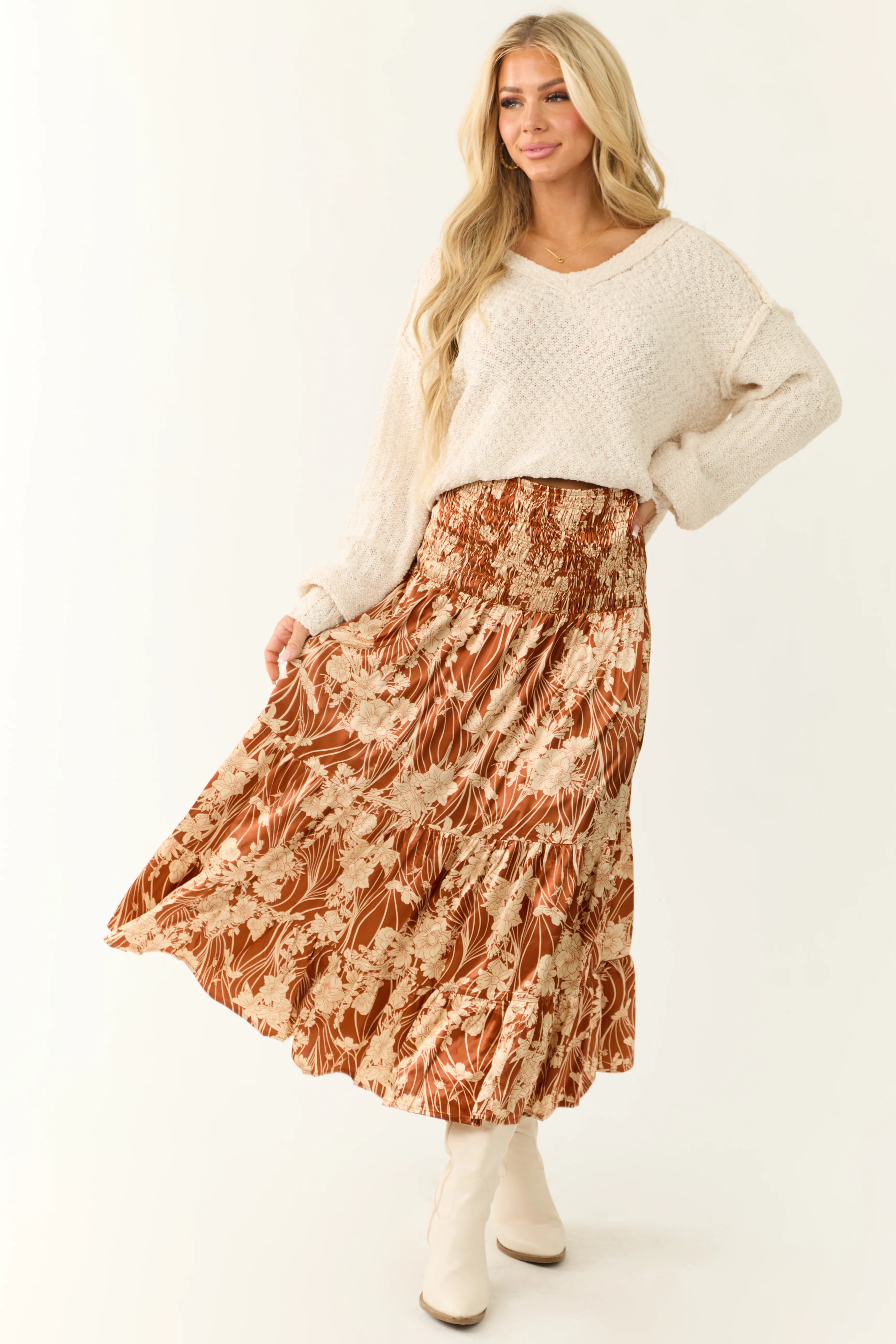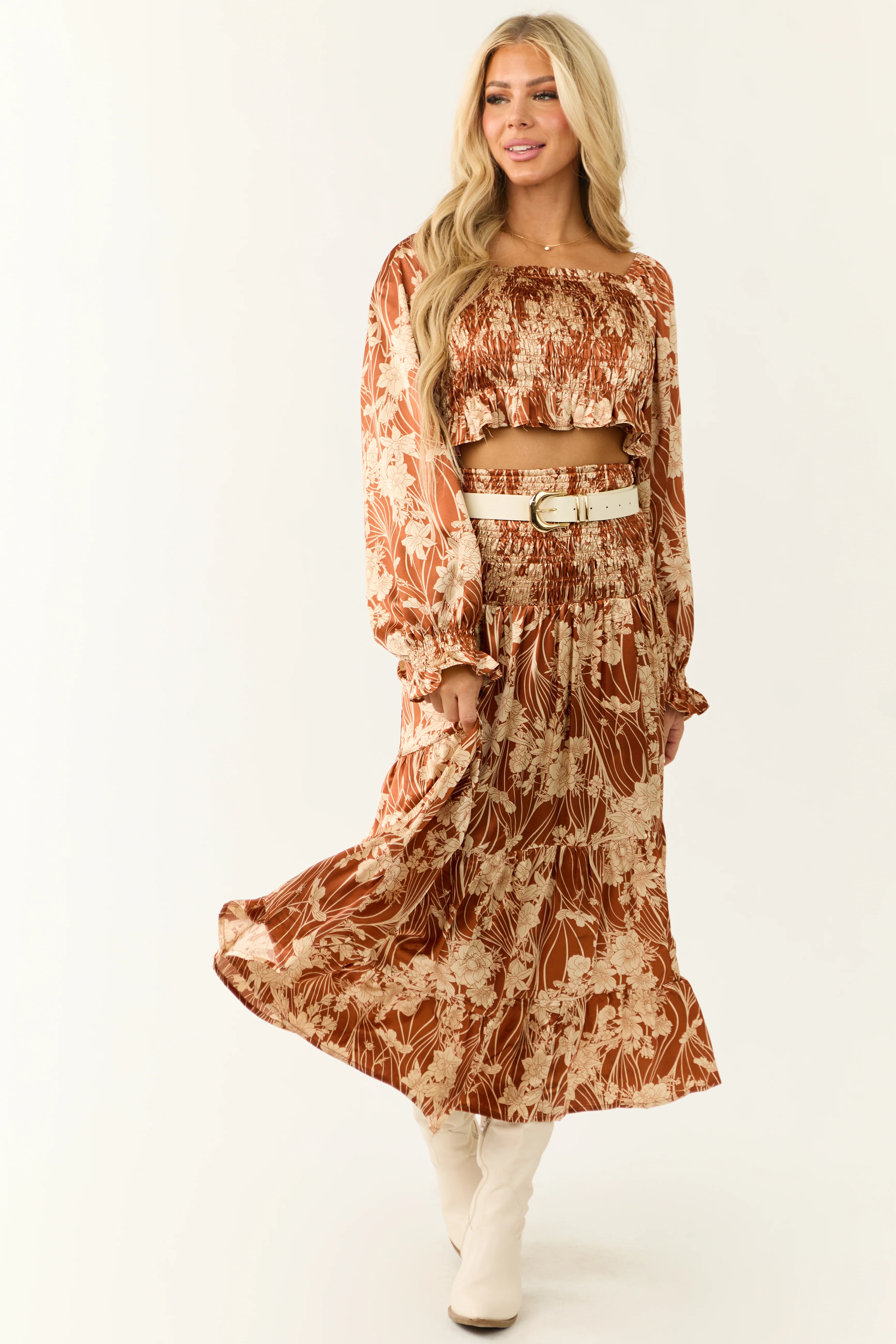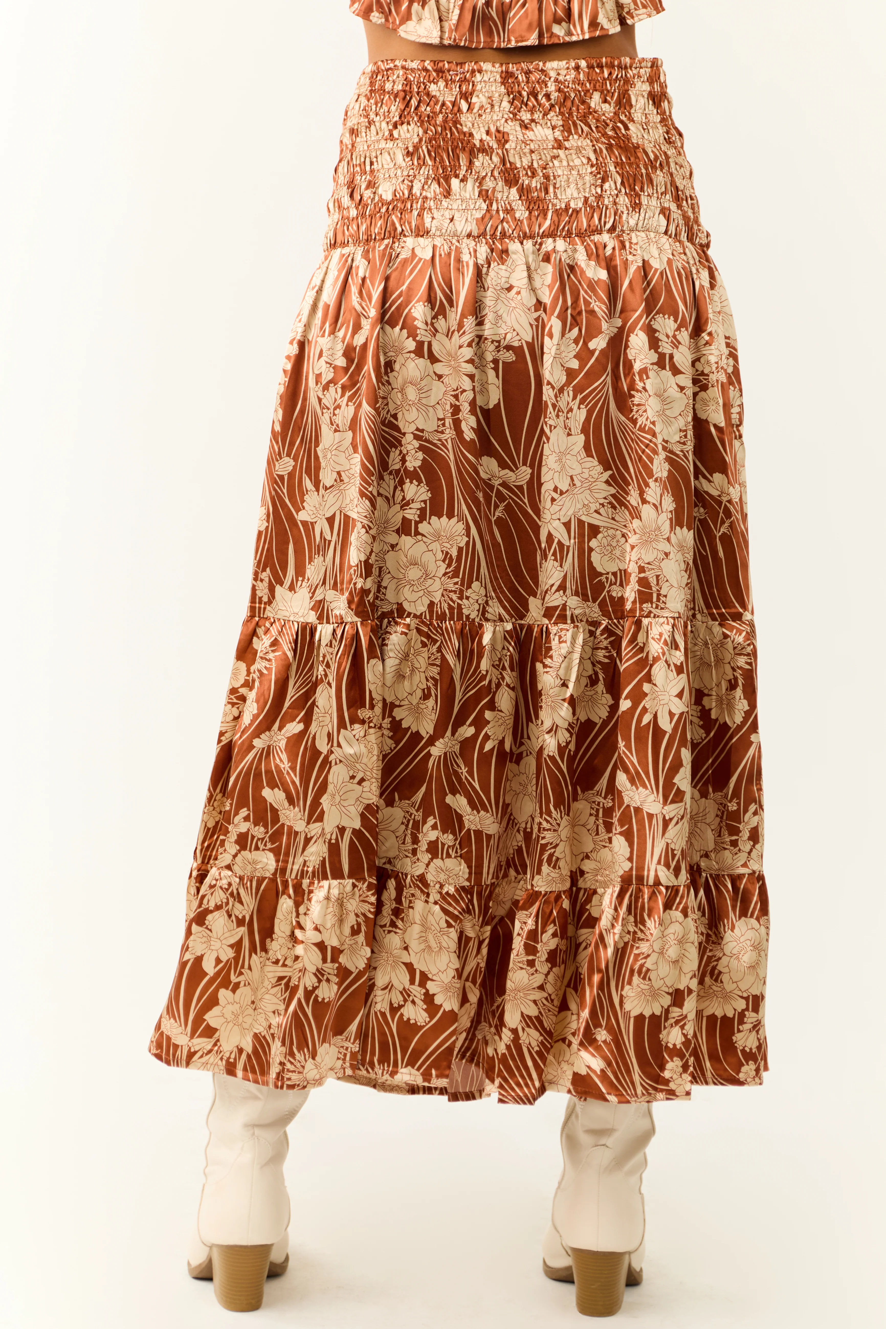 Burnt Orange Floral Print Satin Skirt