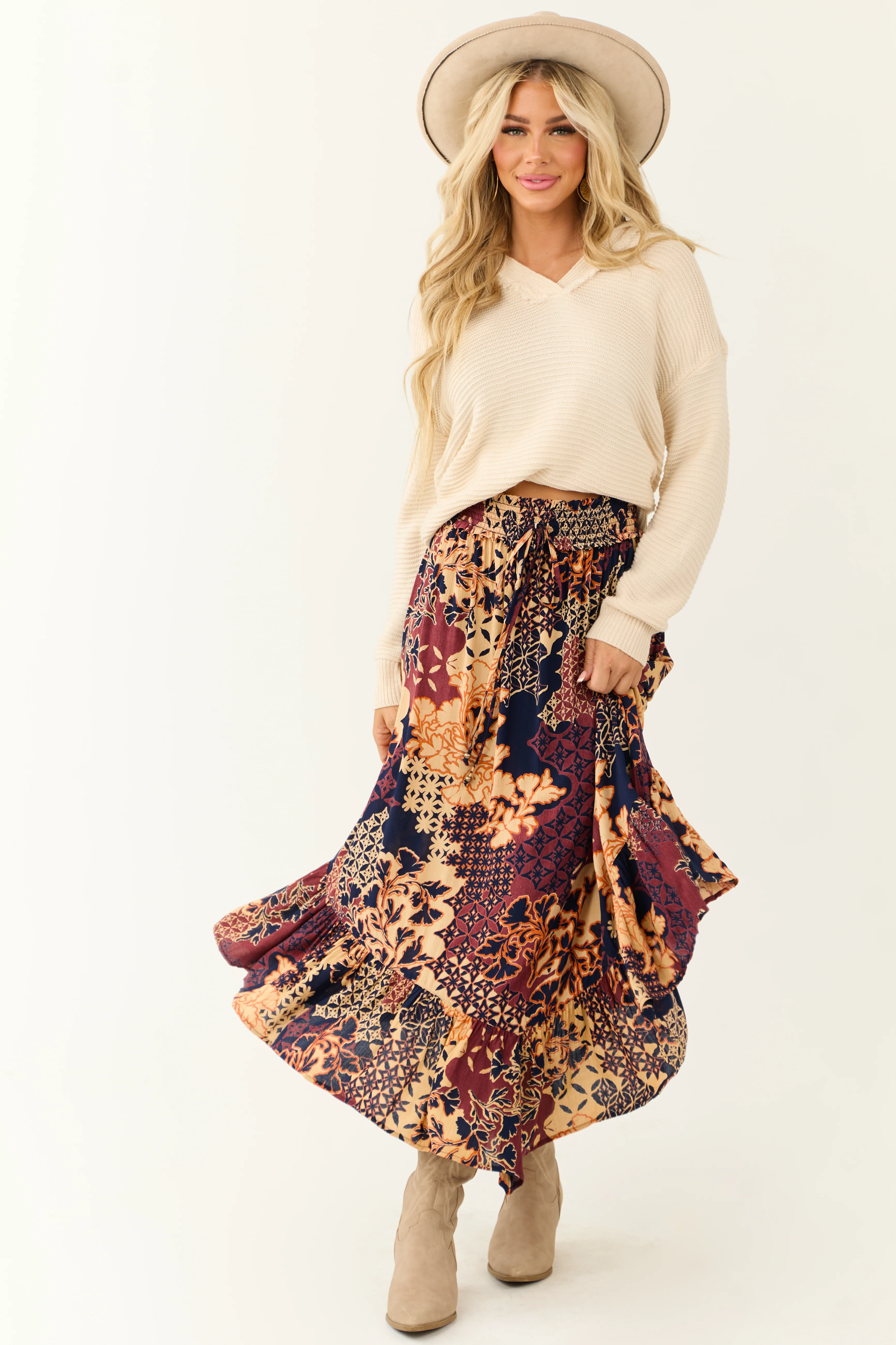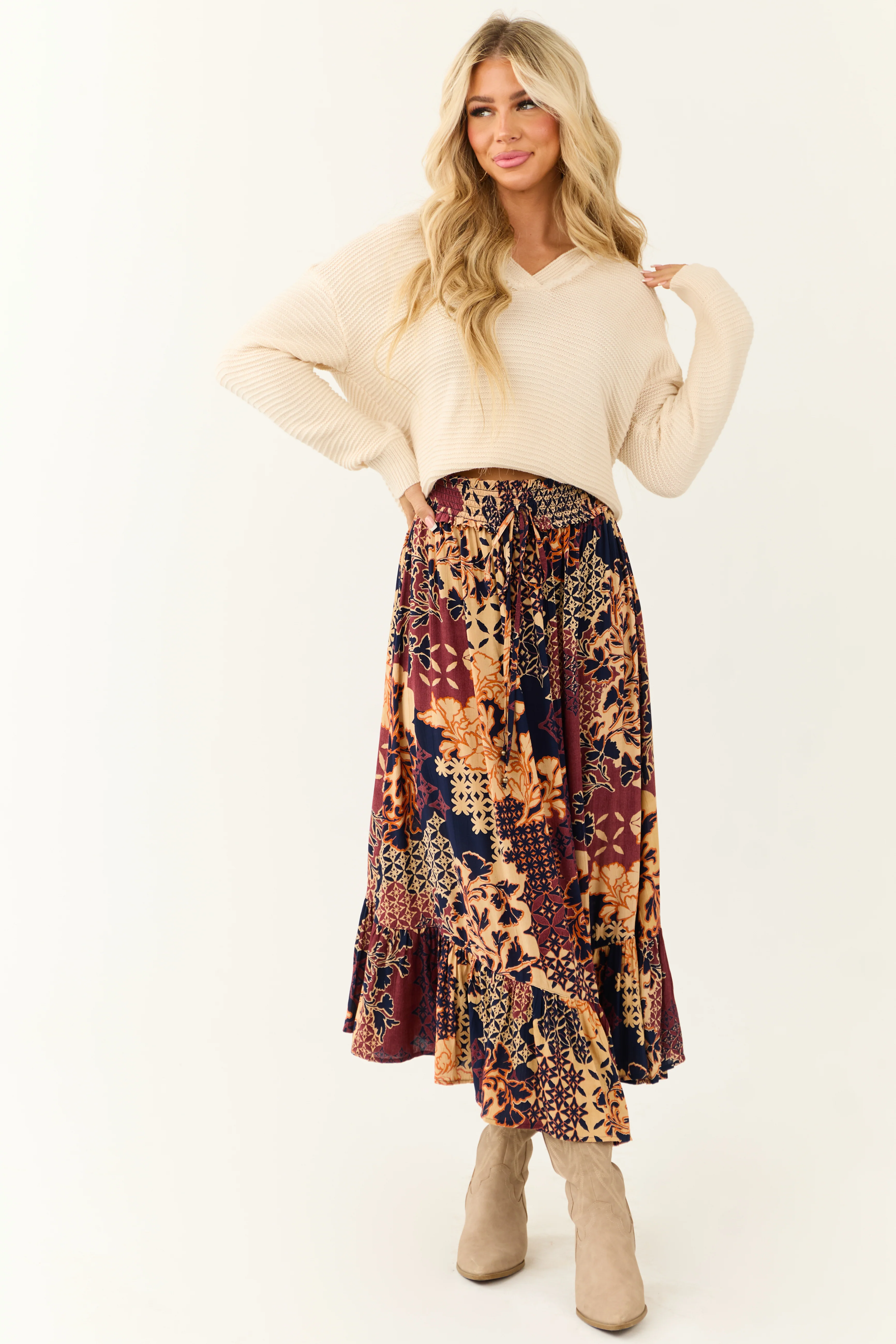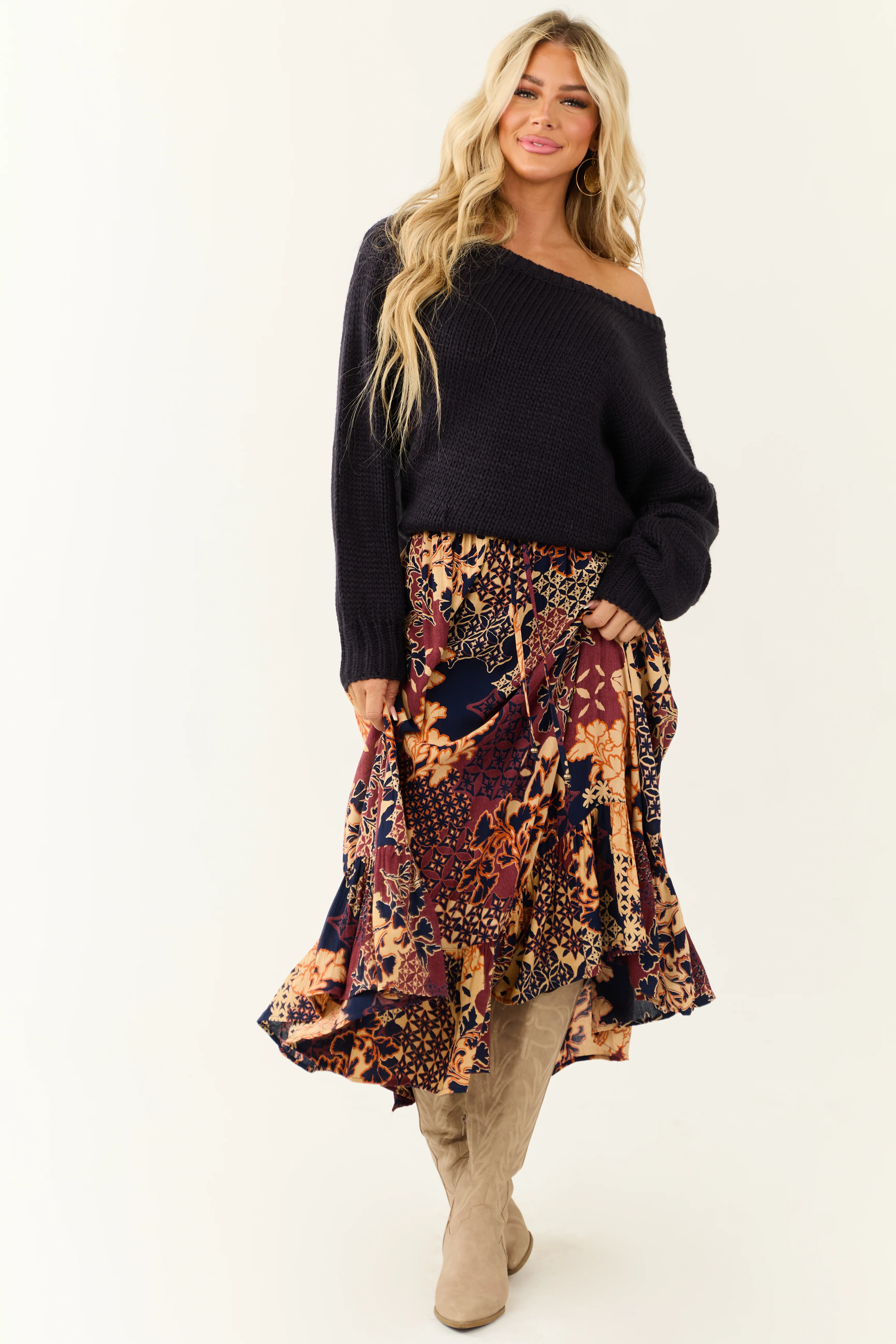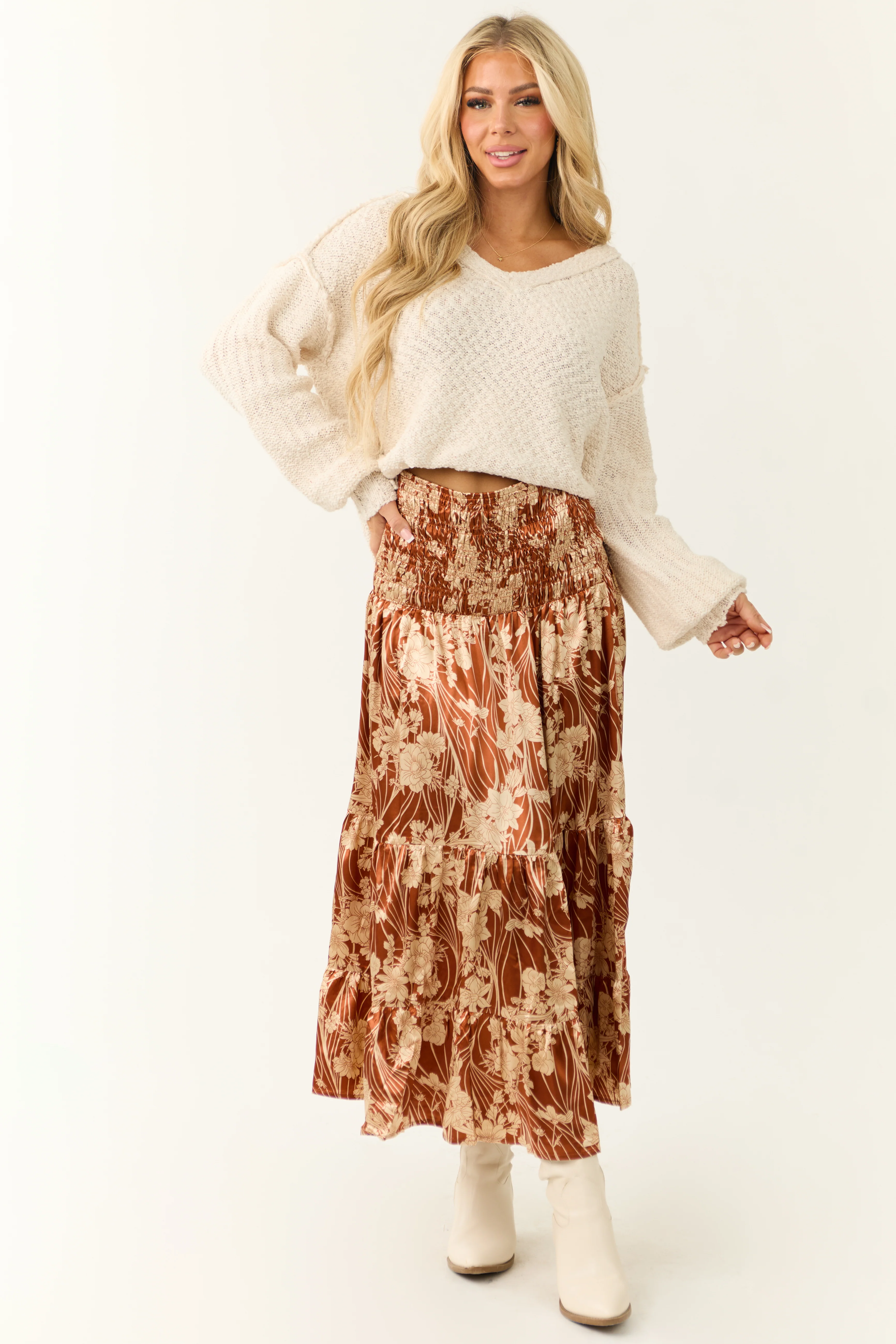 Cream Lace & Cocoa Velvet Tiered Midi Skirt with Bow Detail
