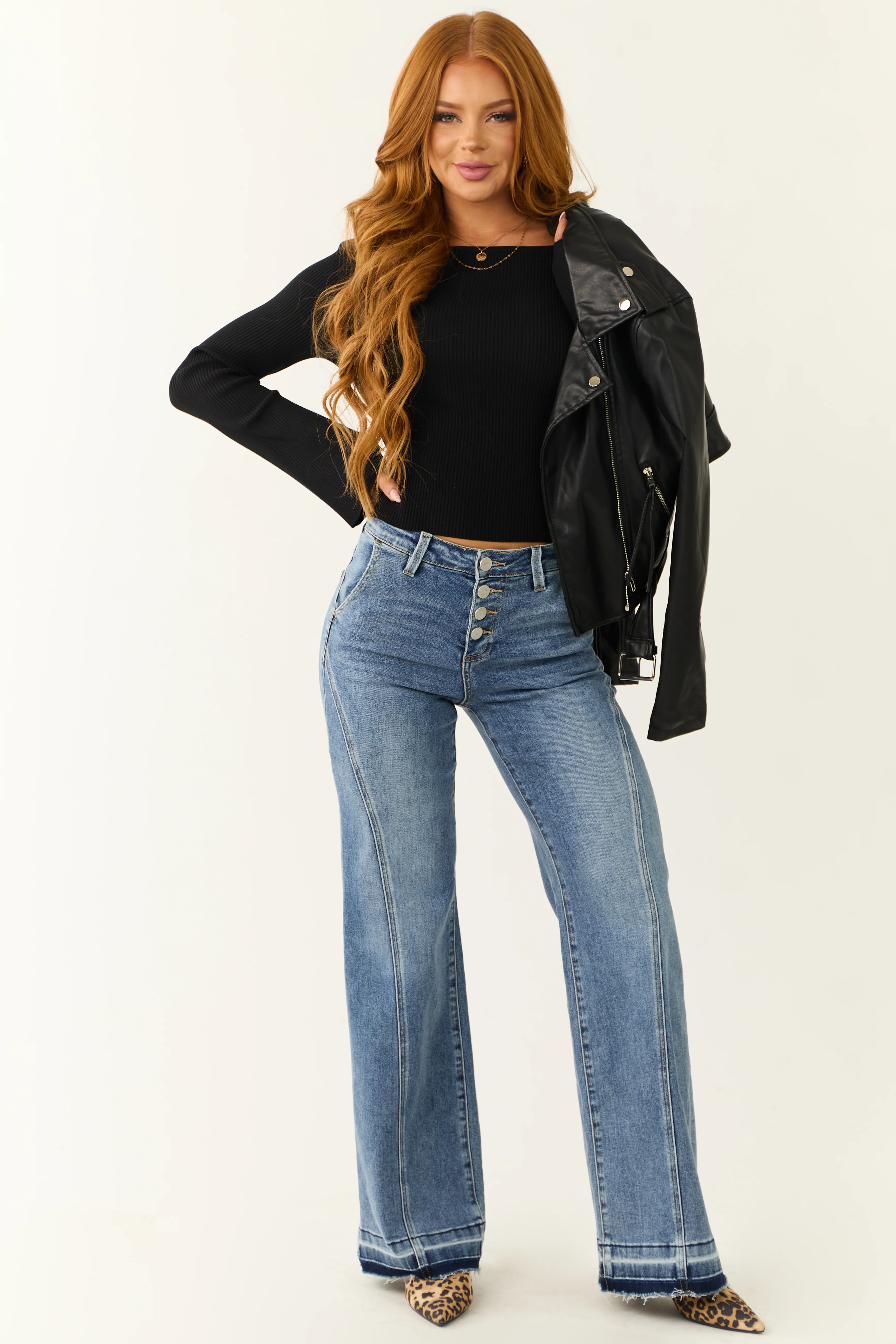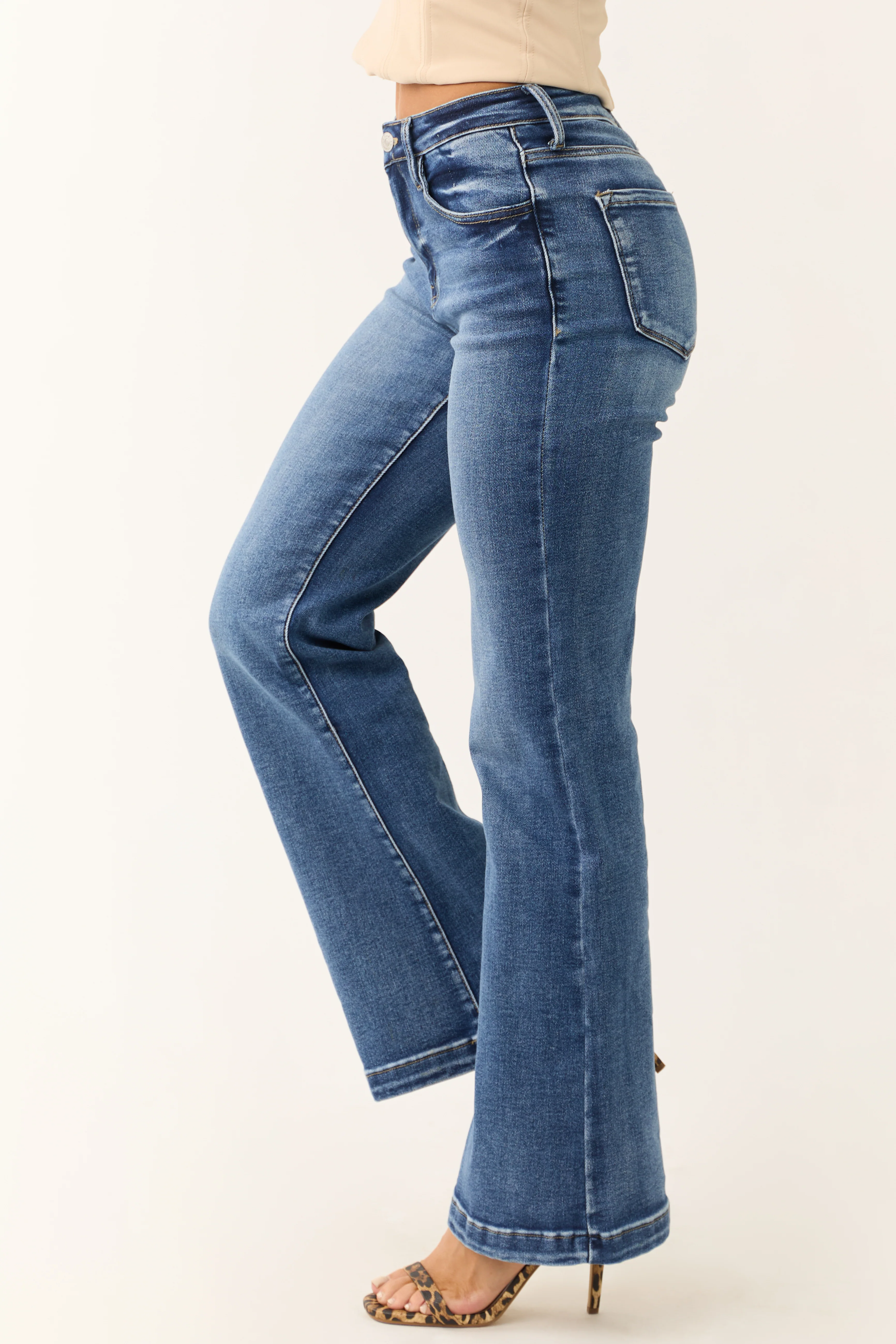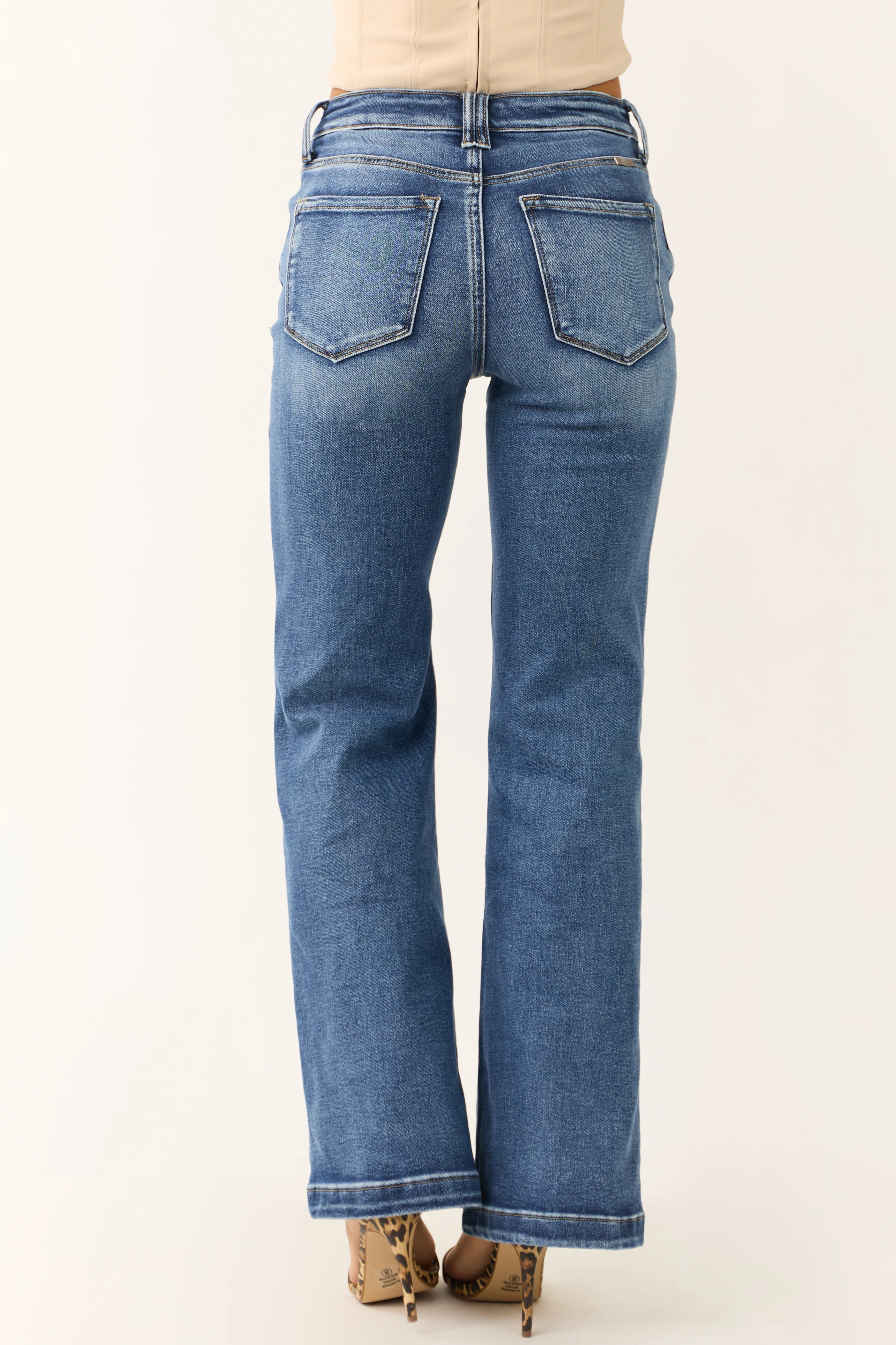 Risen Medium Wash Front Seam Wide Leg Jeans