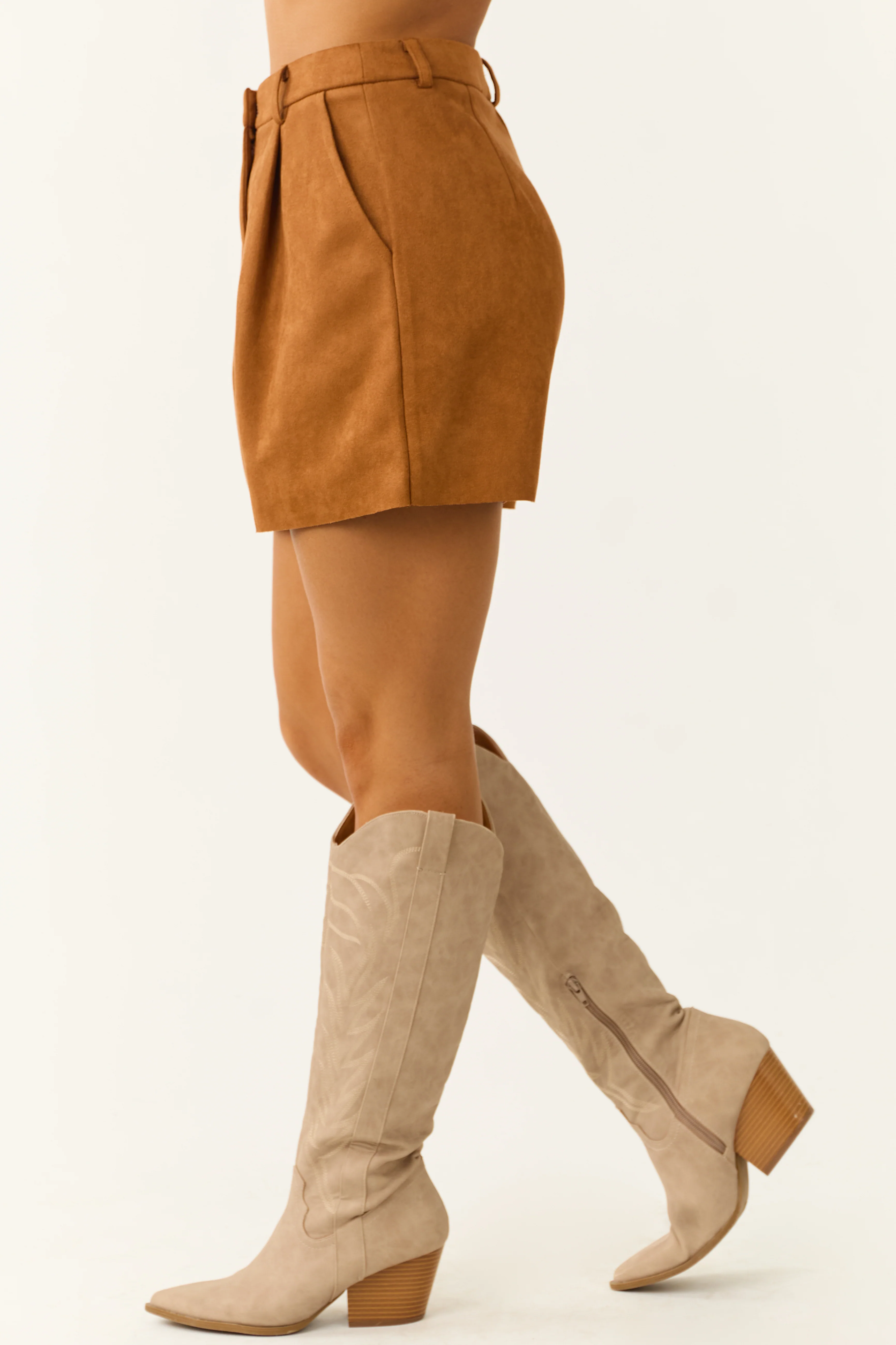 Caramel Faux Suede Raw Hem High Rise Shorts