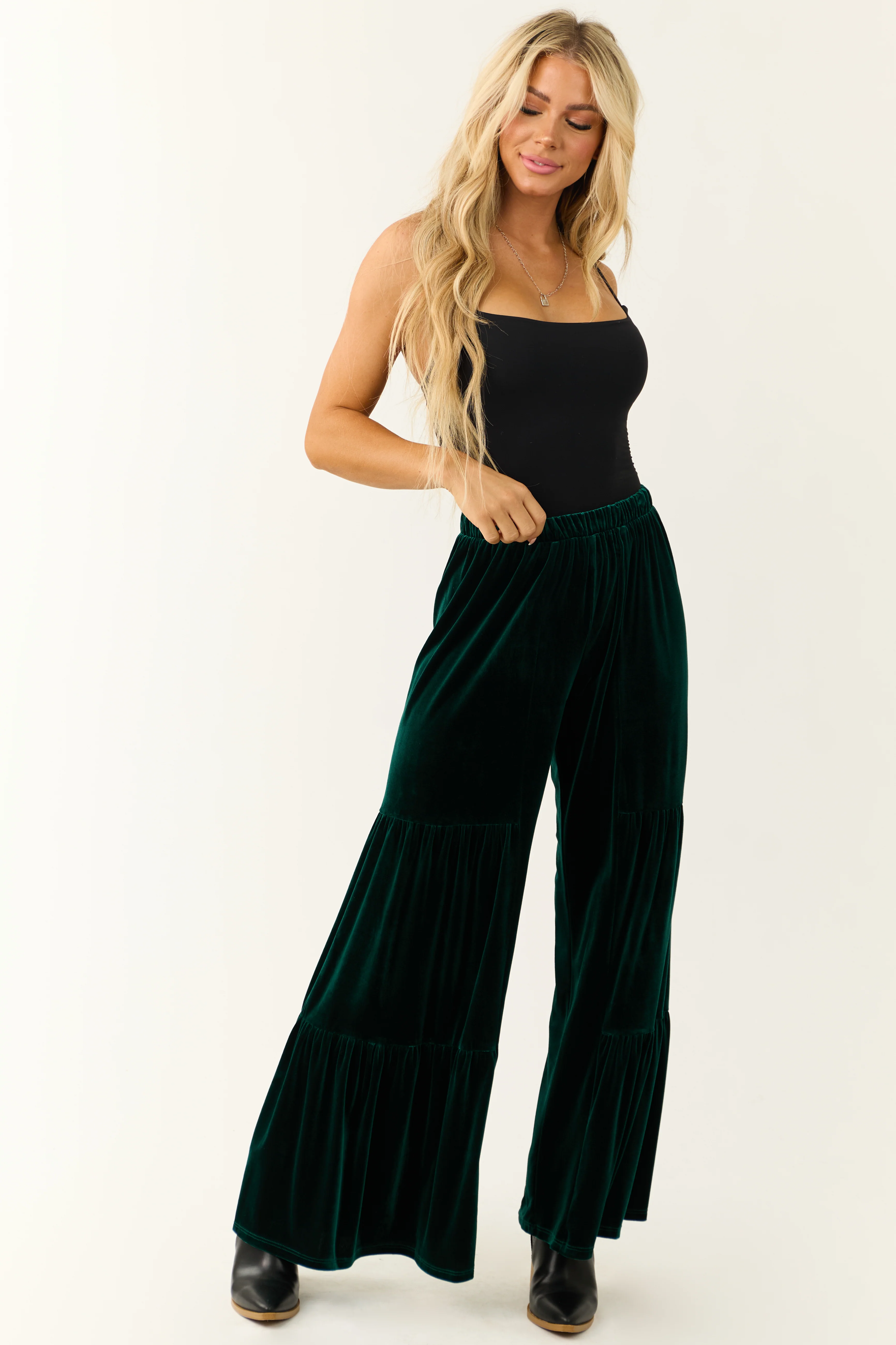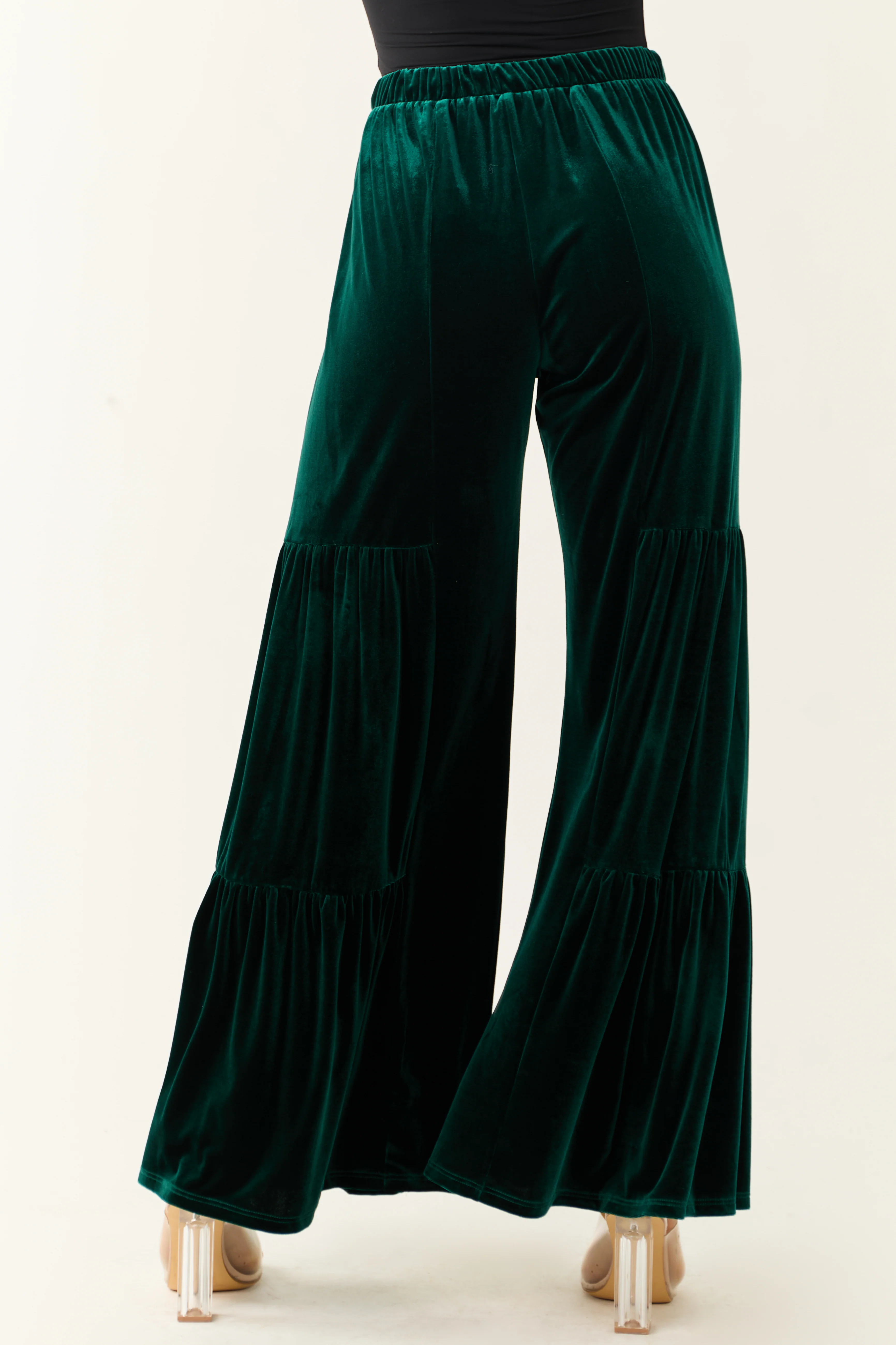Vibrant Forest Green Velvet Tiered Wide Leg Pants