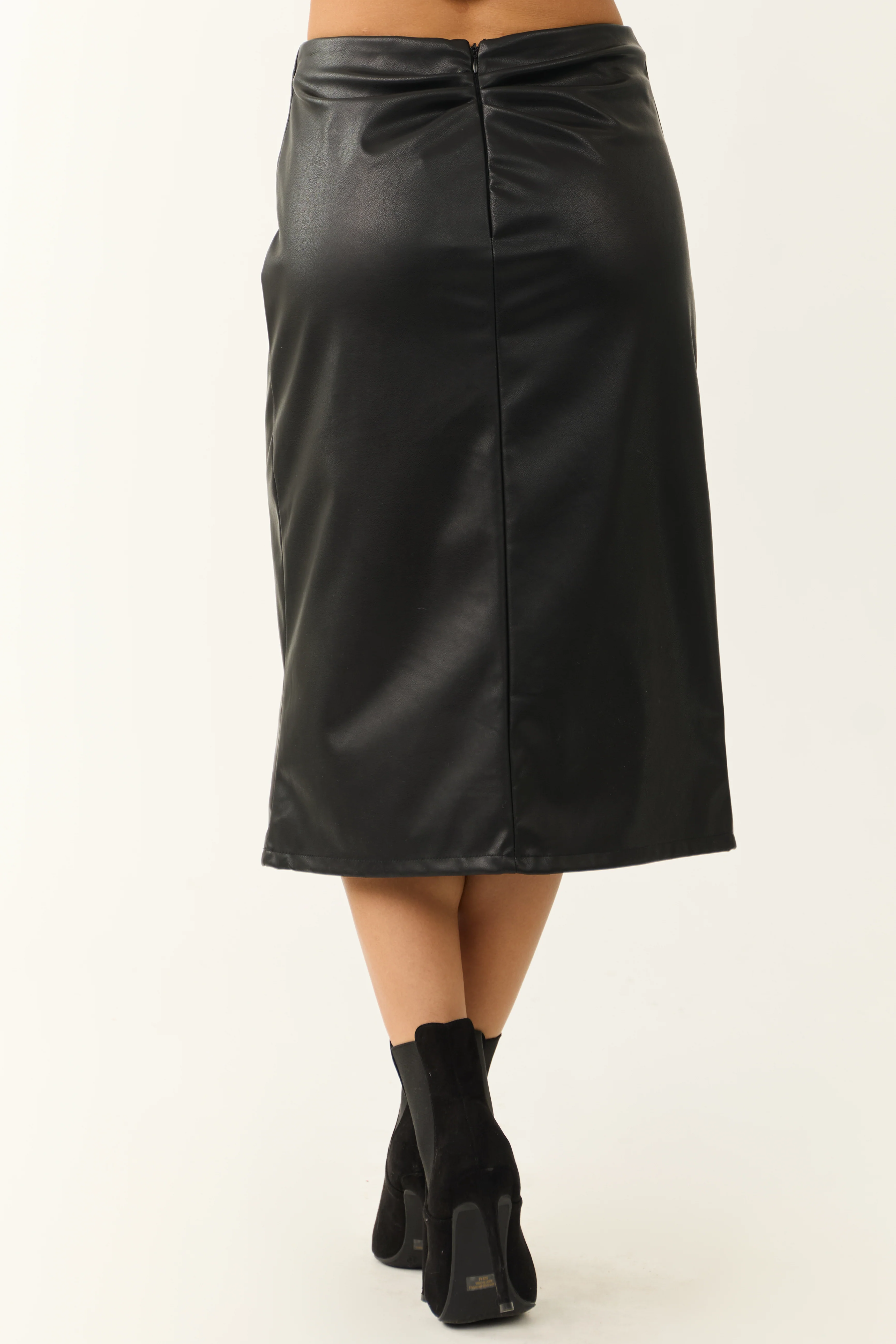 Black Faux Leather Pleating Detail Midi Skirt