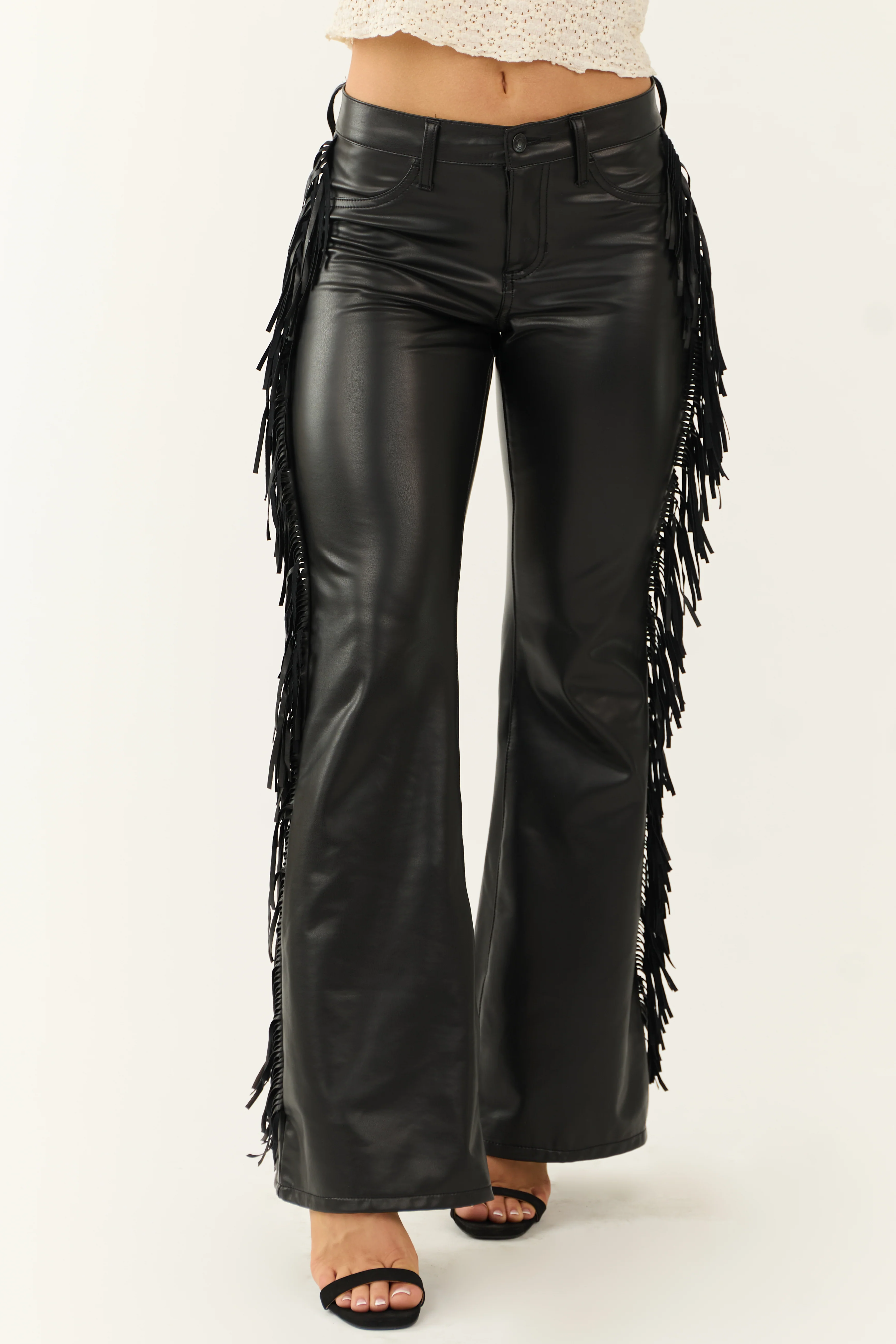 Cello Black Faux Leather Mid Rise Fringe Flare Pants