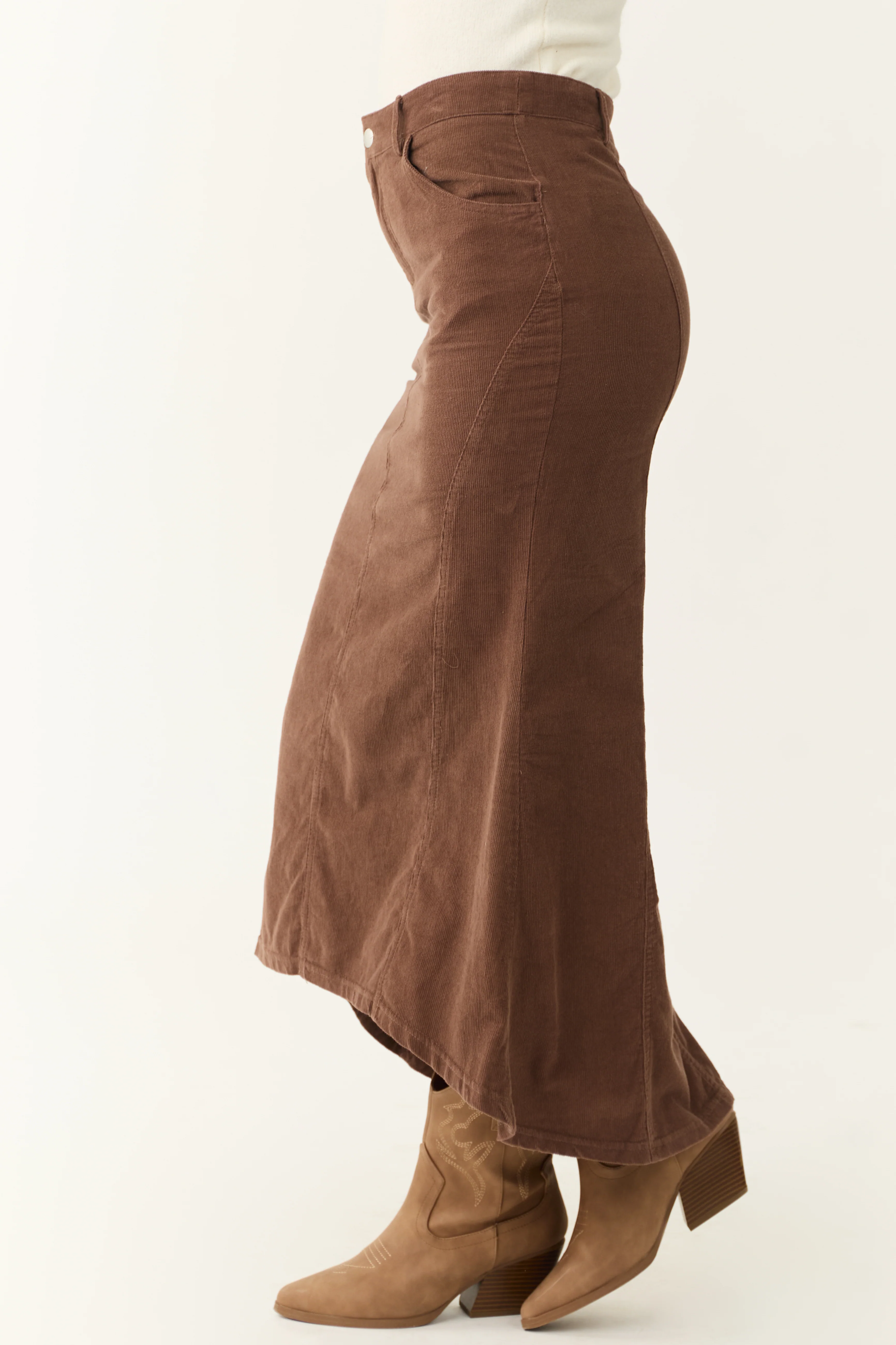 Walnut Corduroy Zip Up Flared Midi Skirt