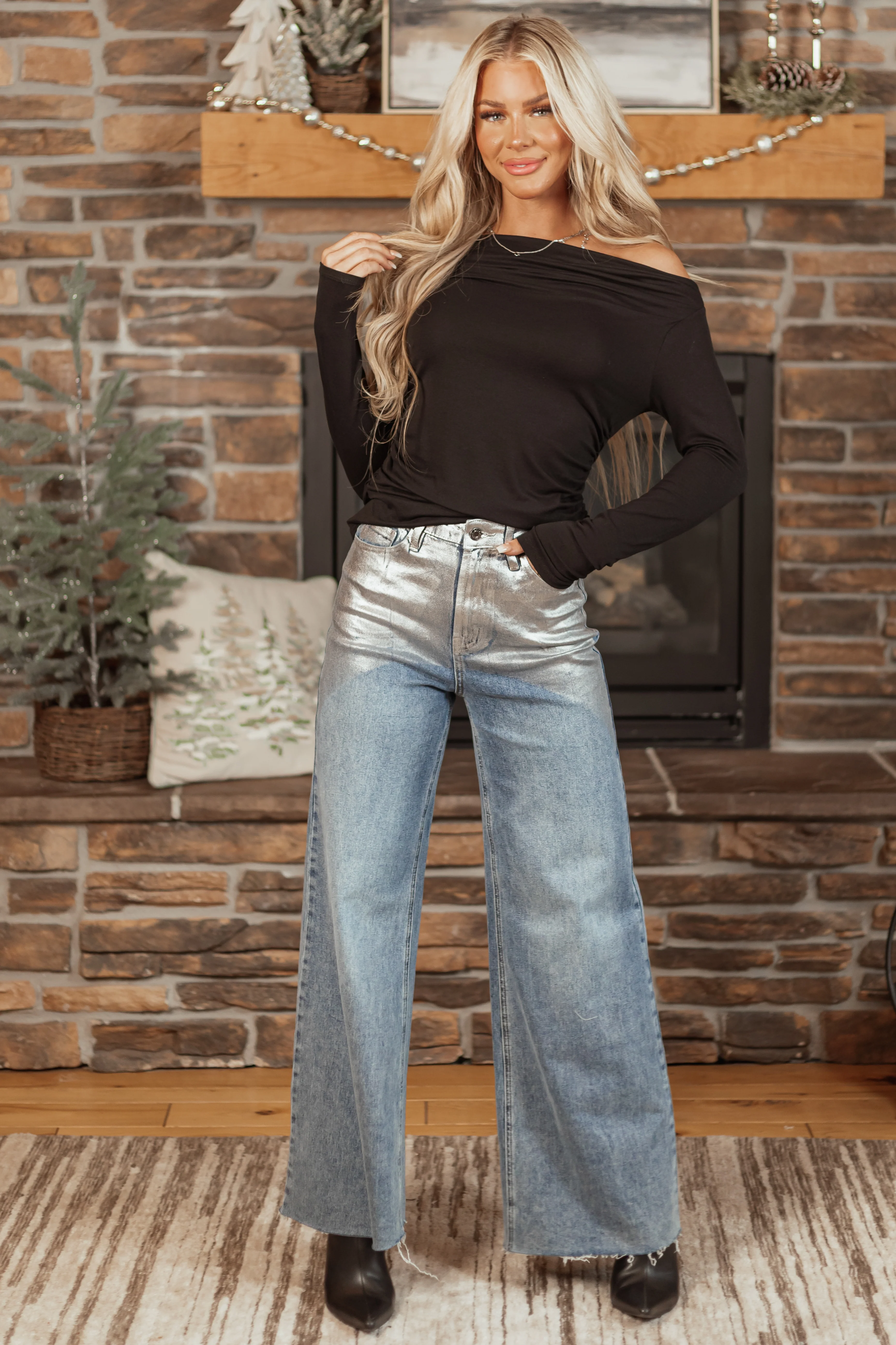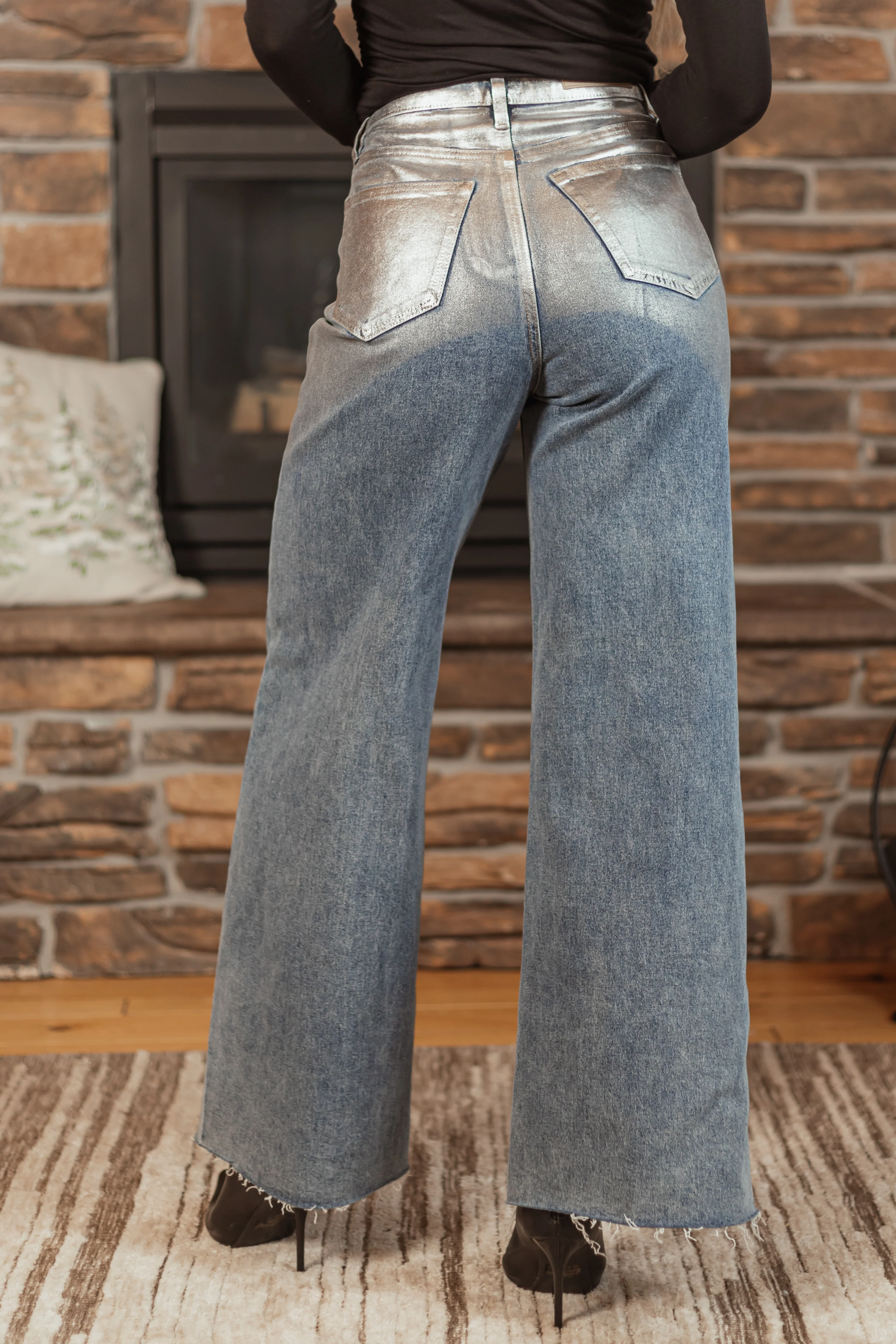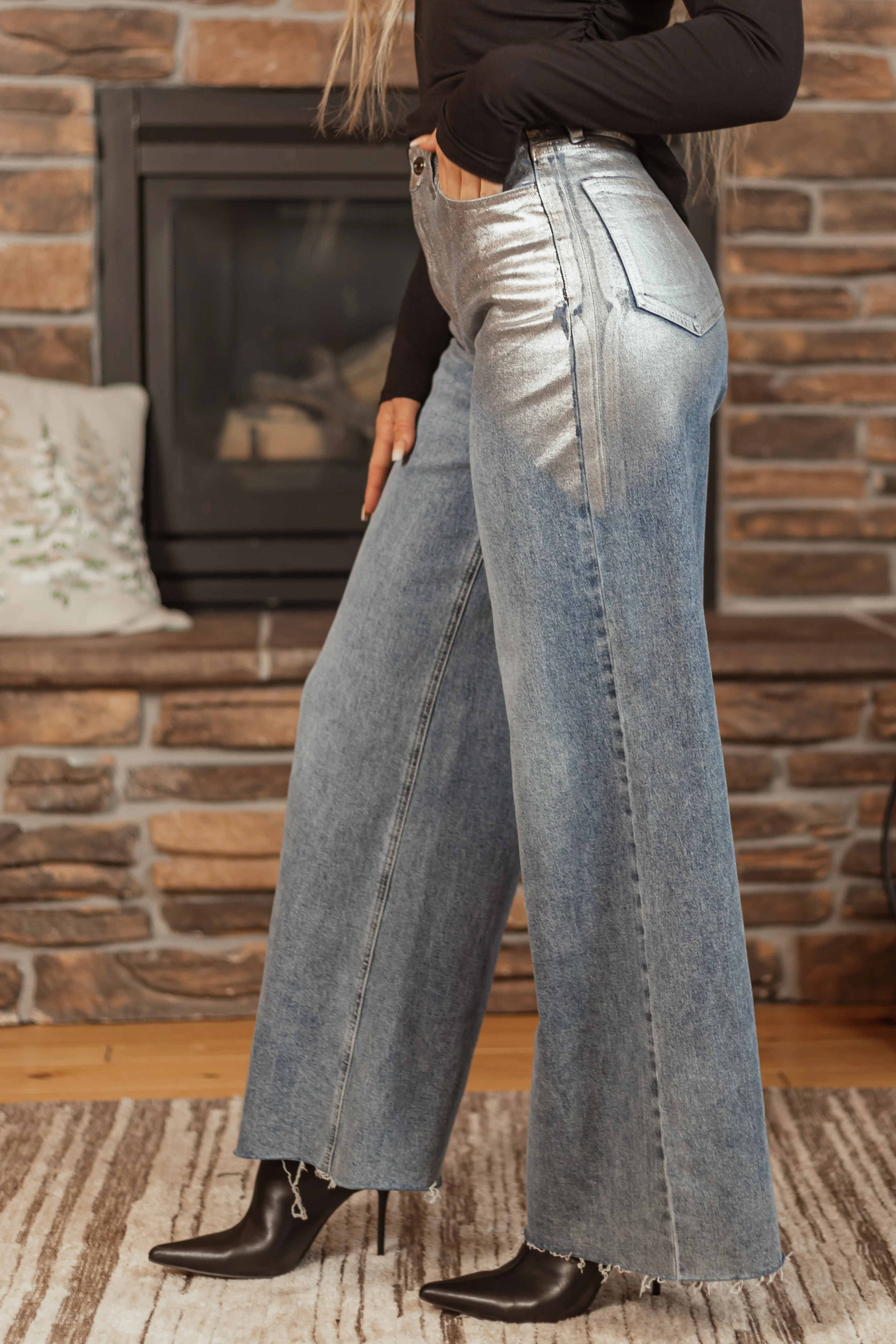 Cello Medium Wash Silver Foiled Wide Leg Jeans