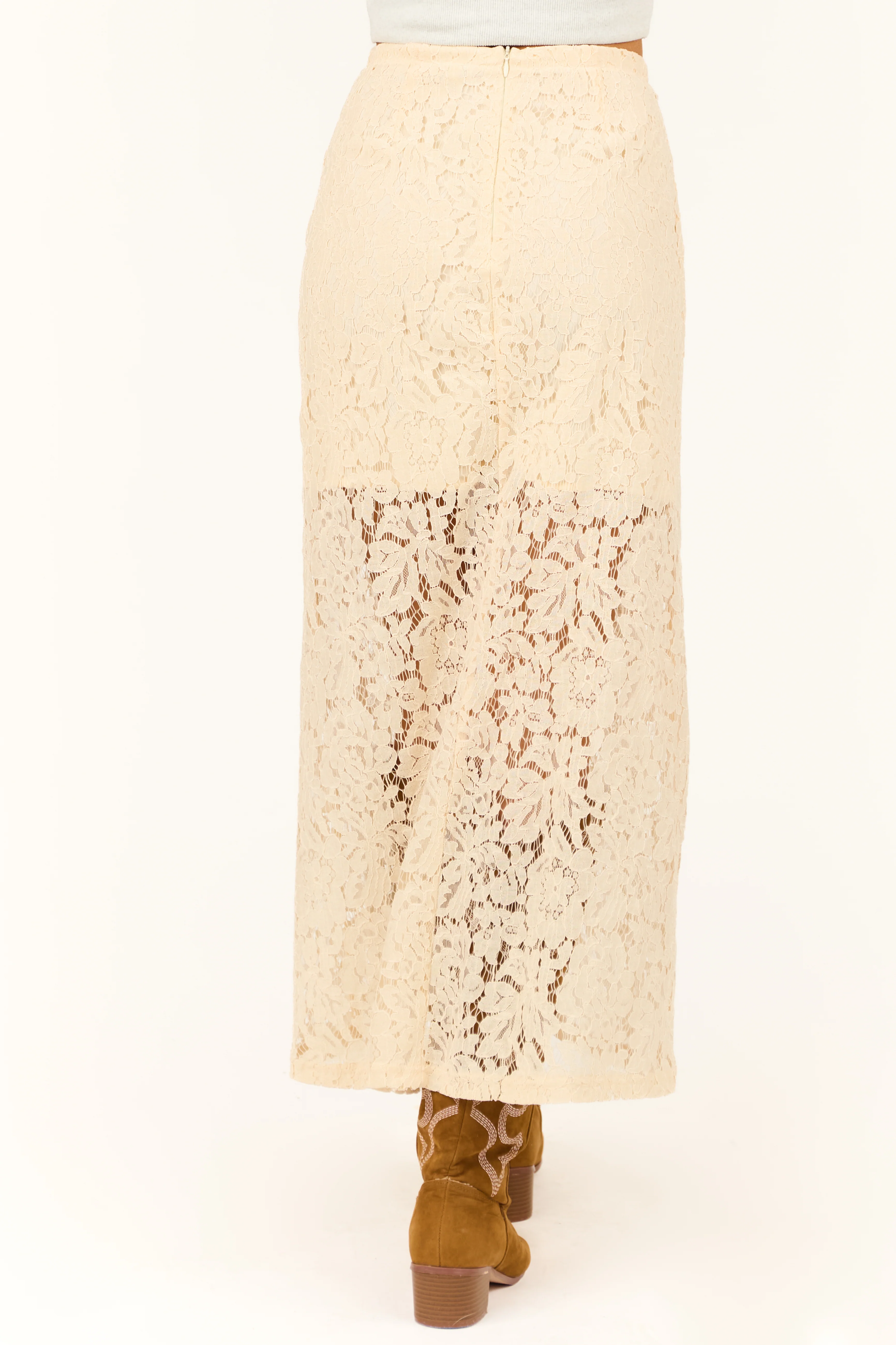 Off White Sheer Floral Lace Slight Flare Maxi Skirt