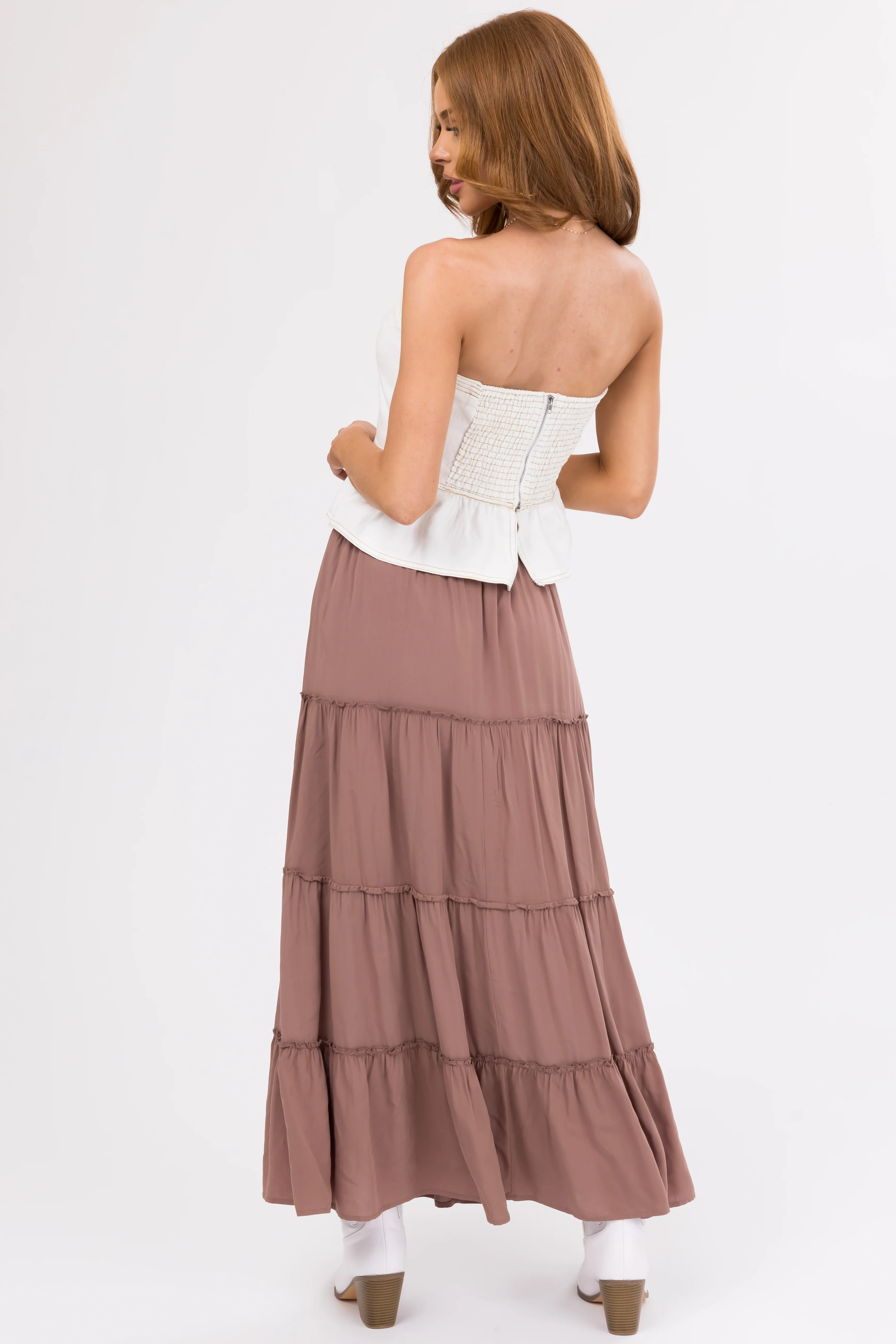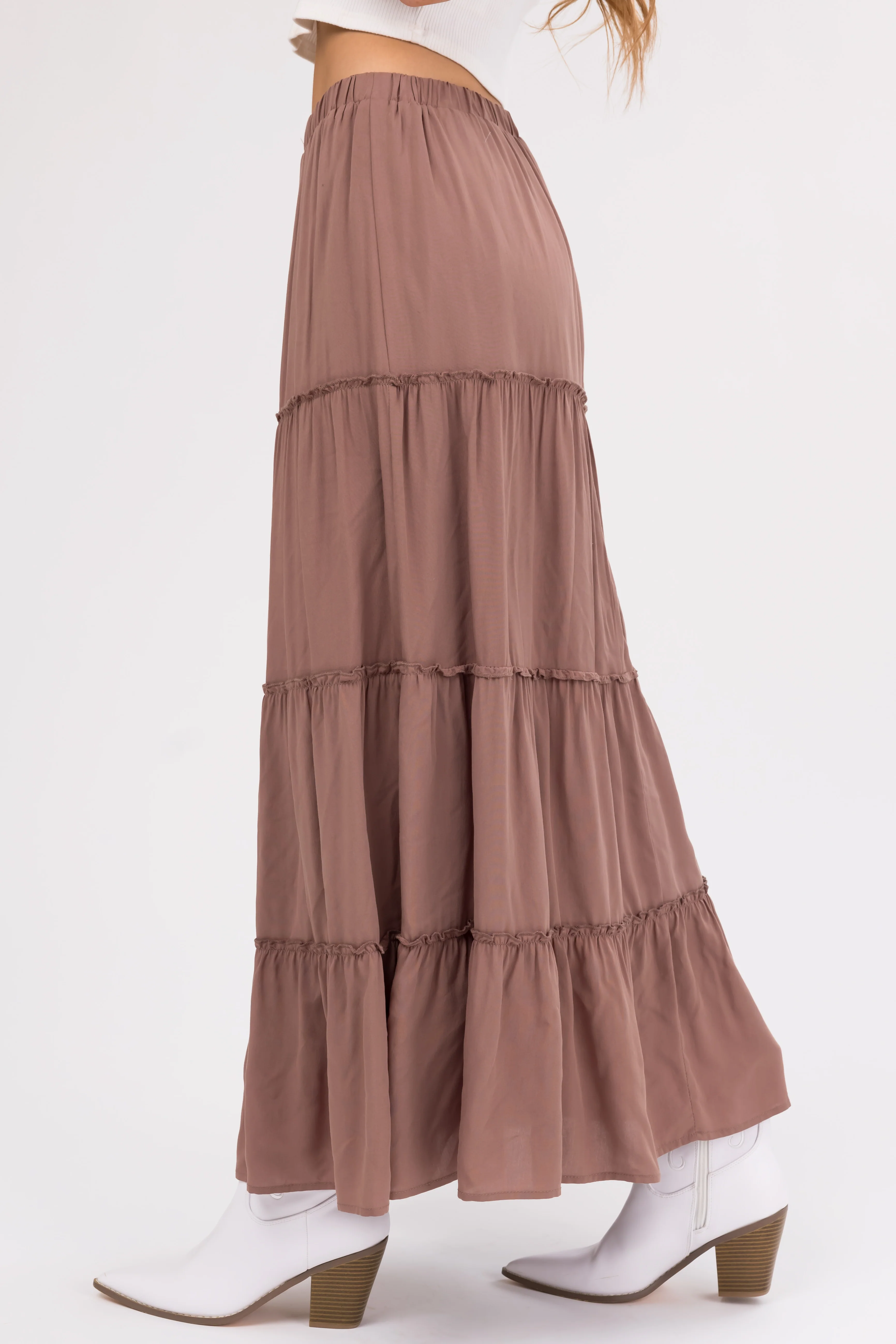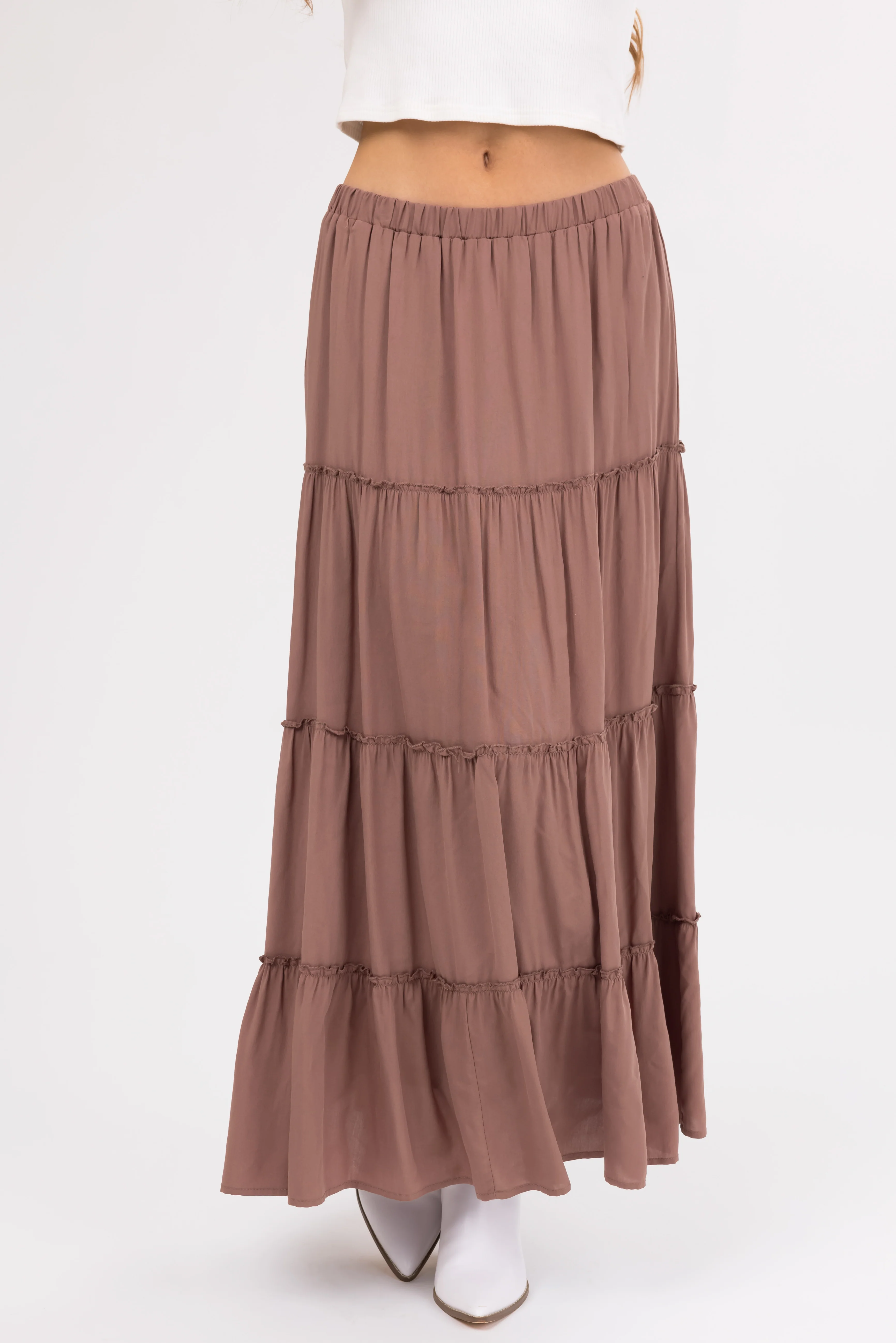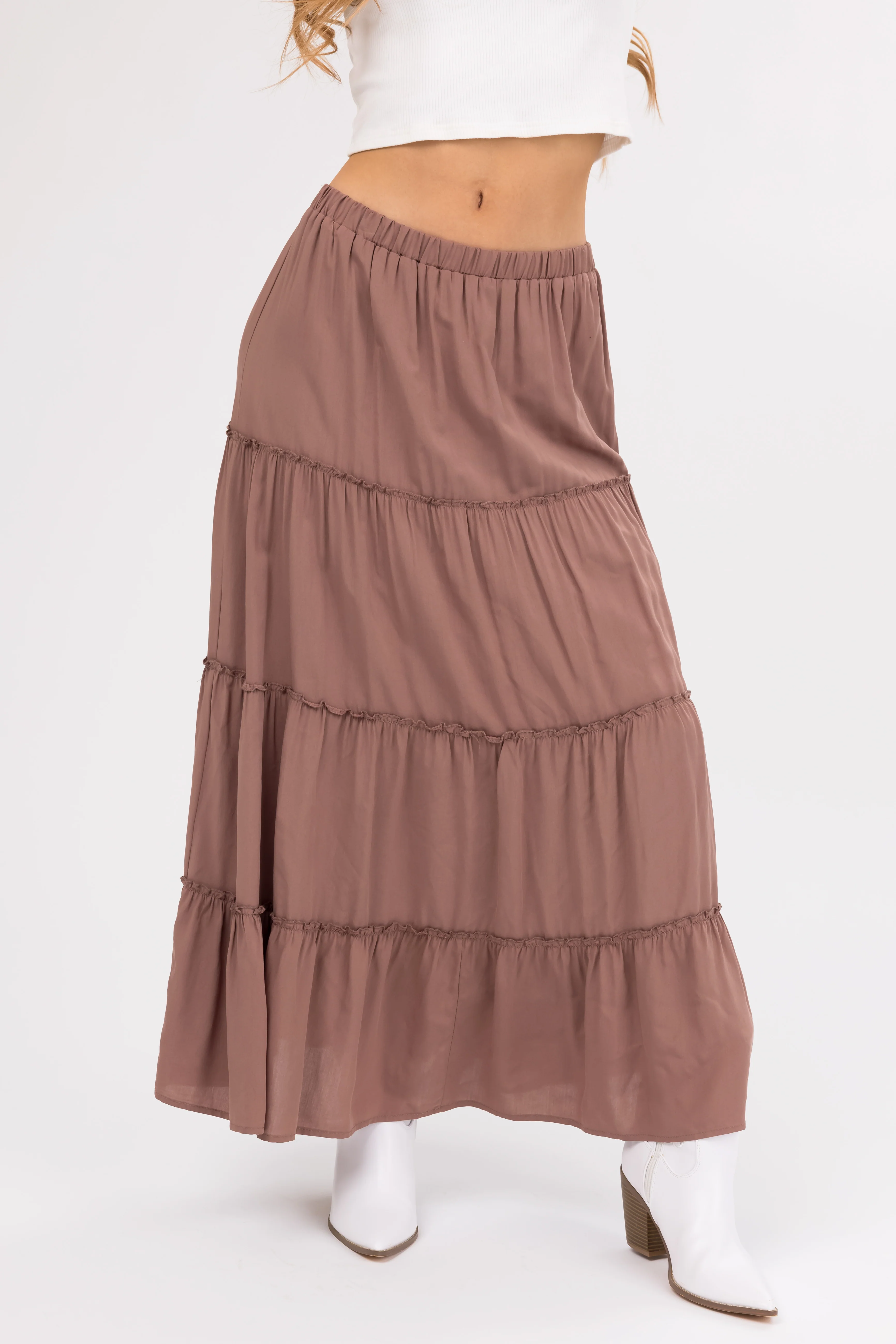 Coffee Tiered Elastic Waist Woven Maxi Skirt
