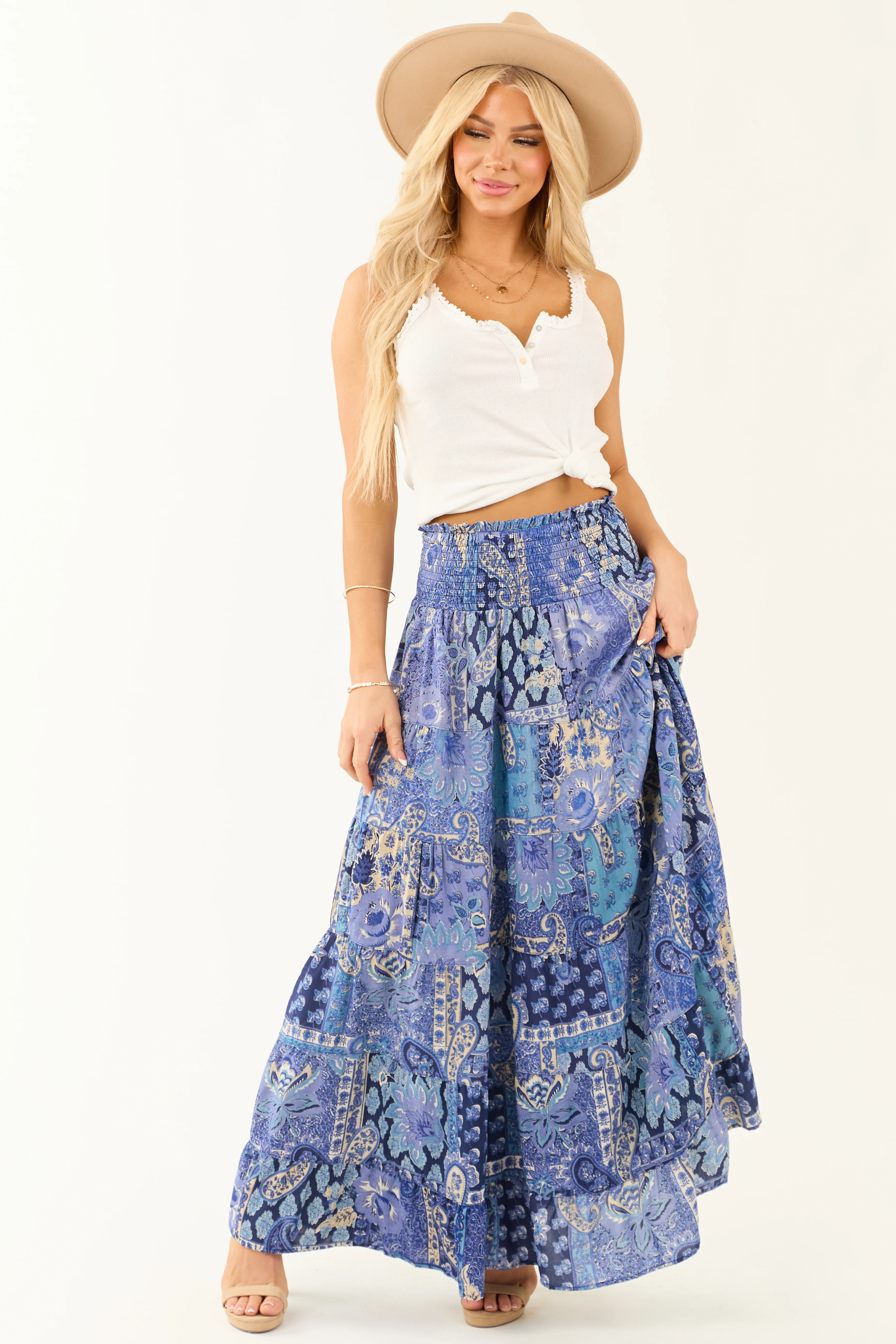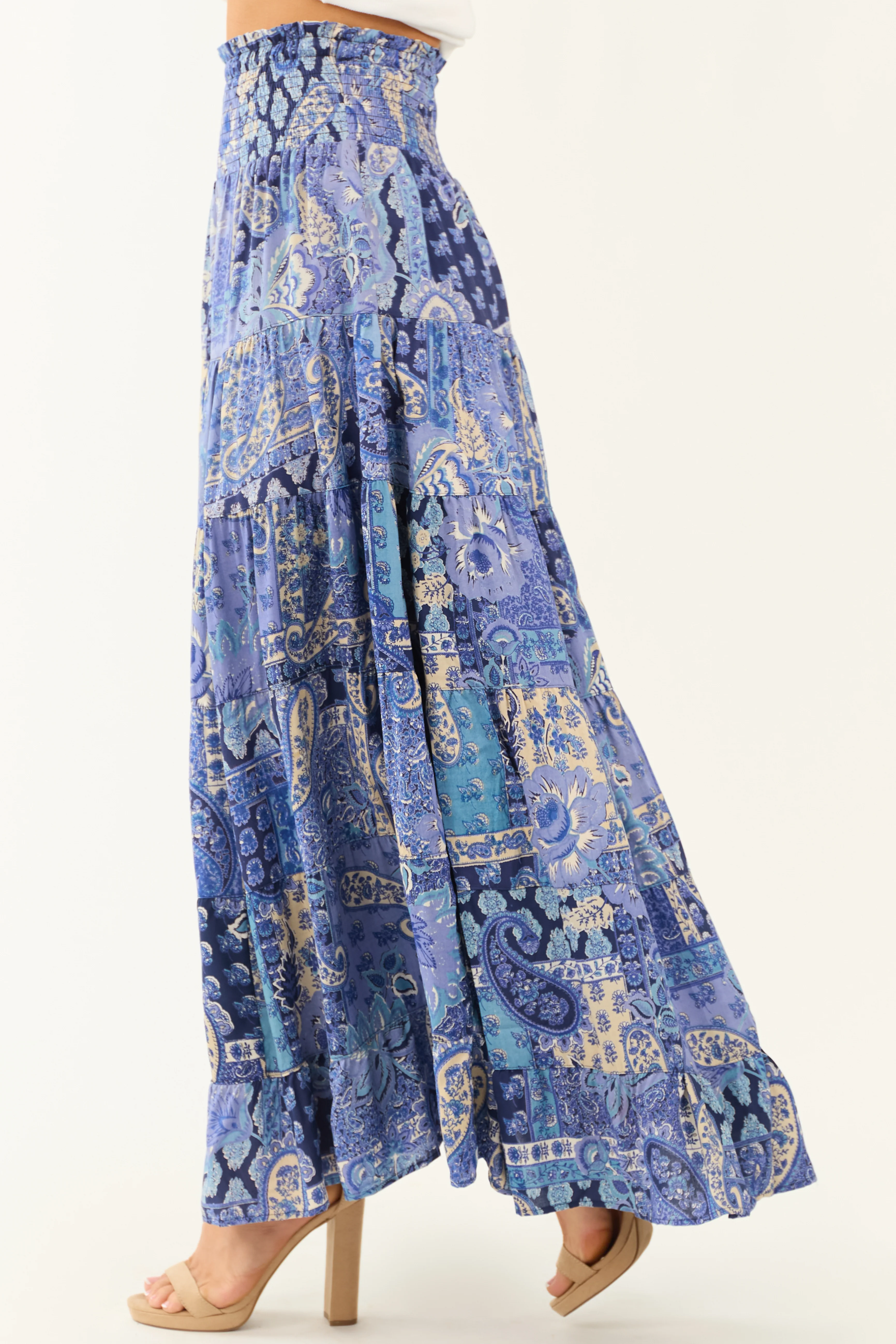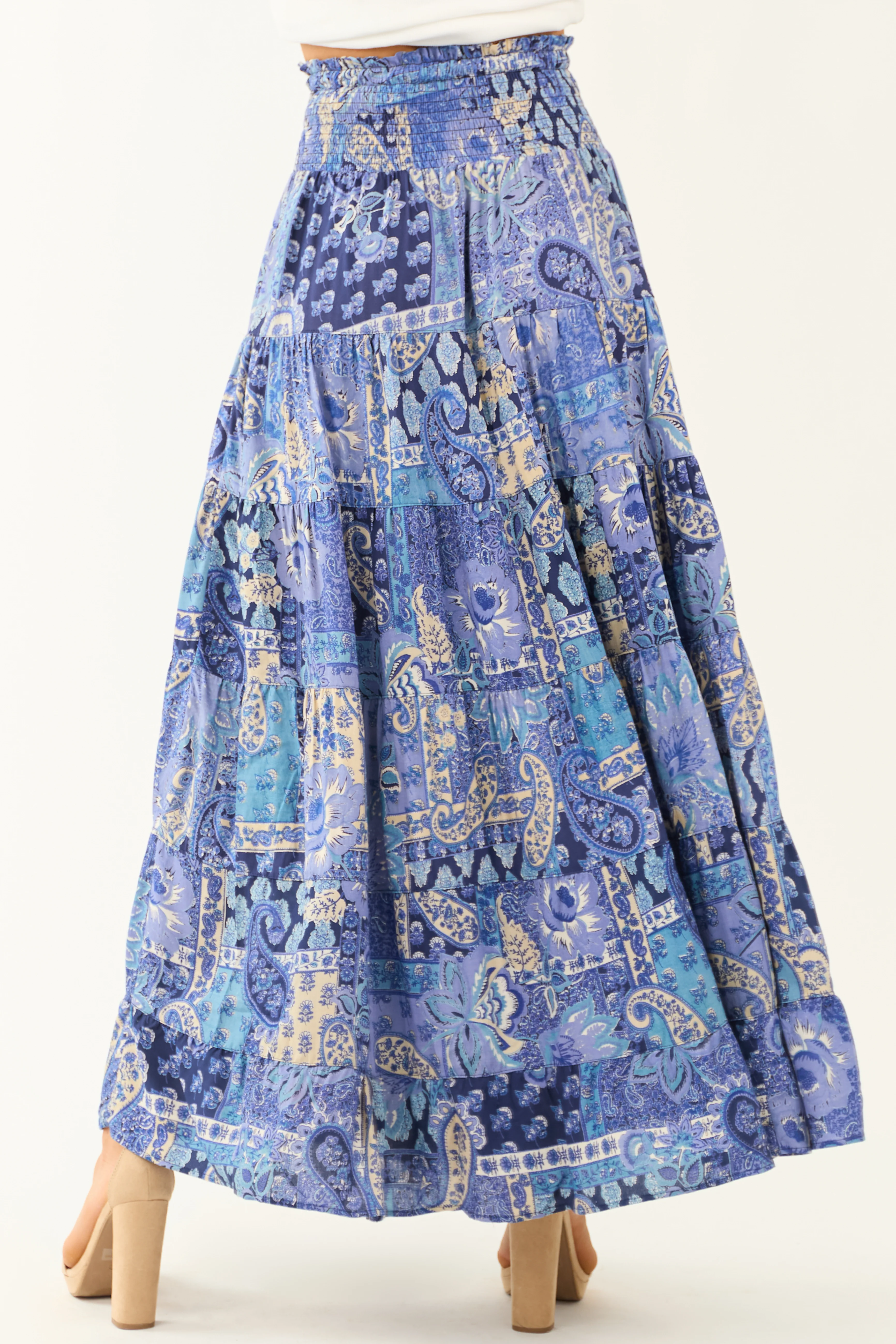 Dusty Blue Floral Print Smocked Tiered Maxi Skirt