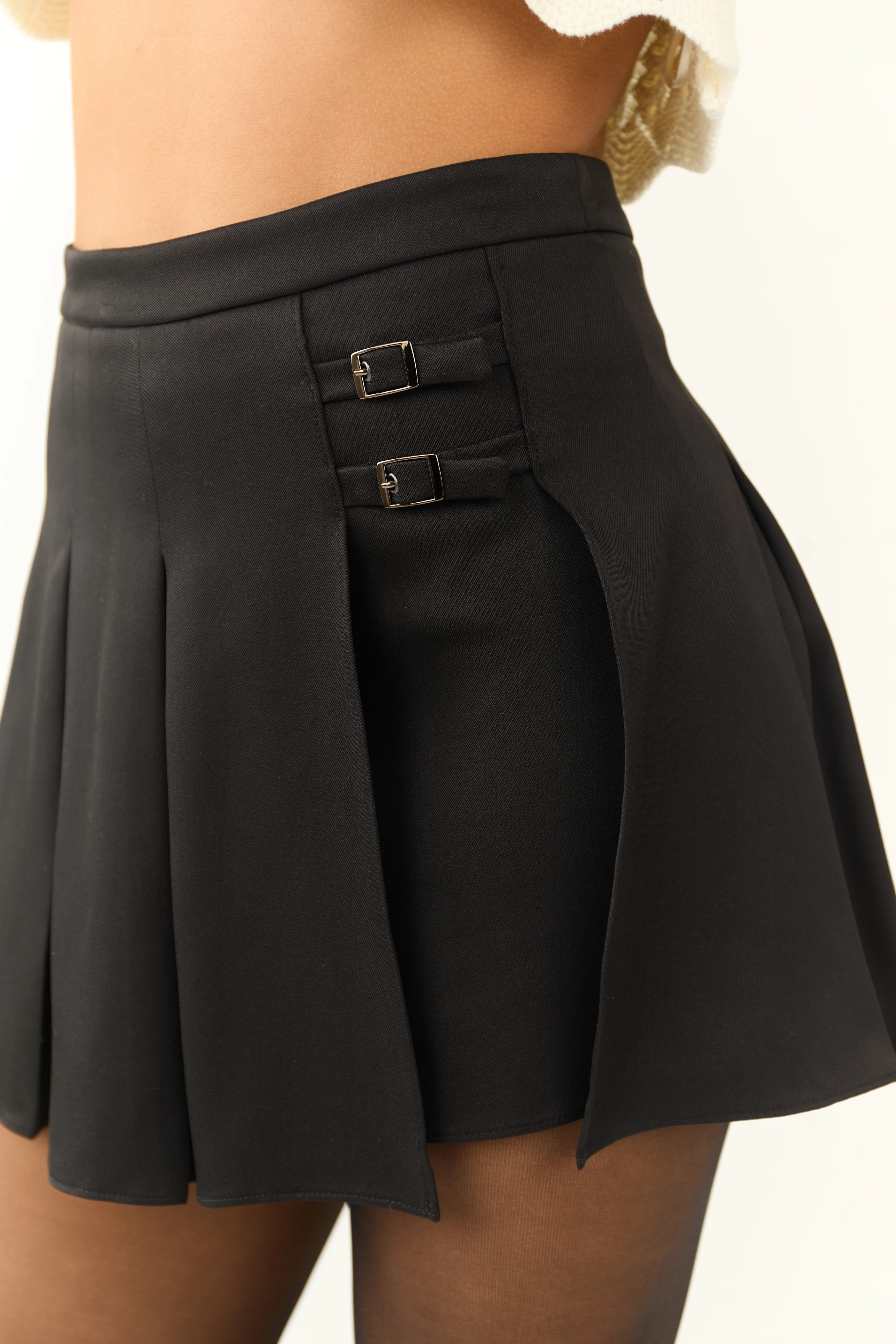 Black Pleated Double Buckle Mini Skort