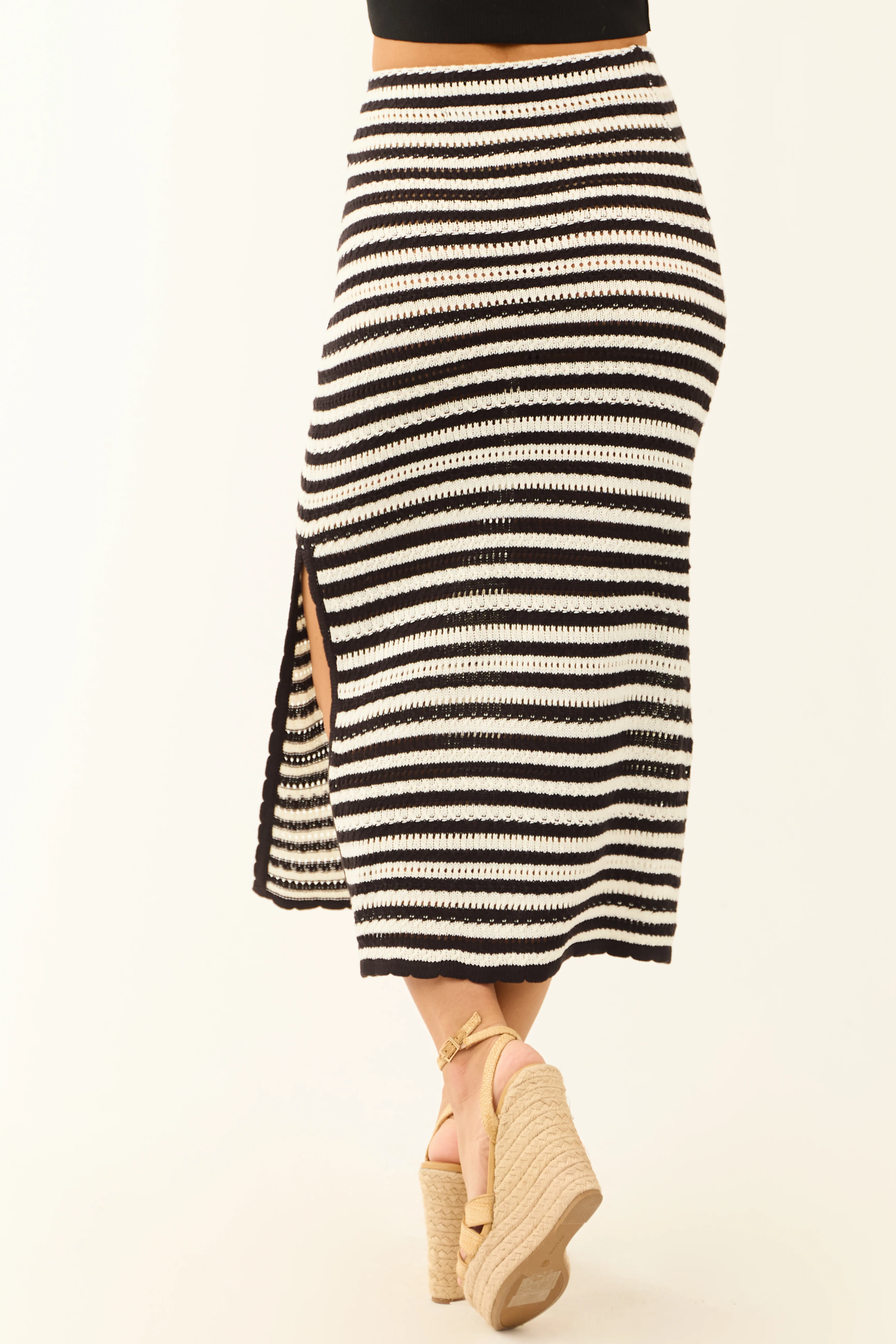 Black and White Striped Open Crochet Knit Midi Skirt