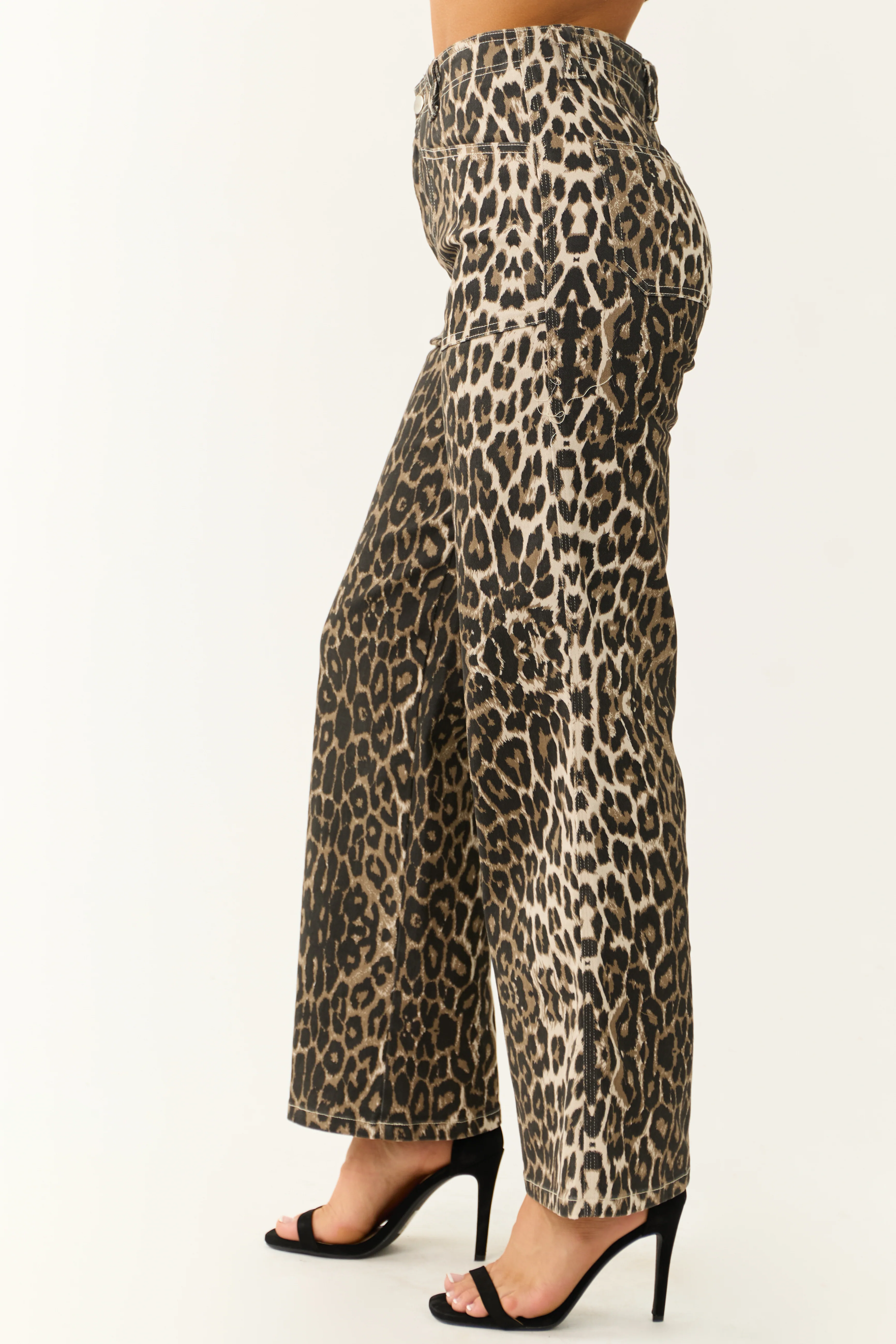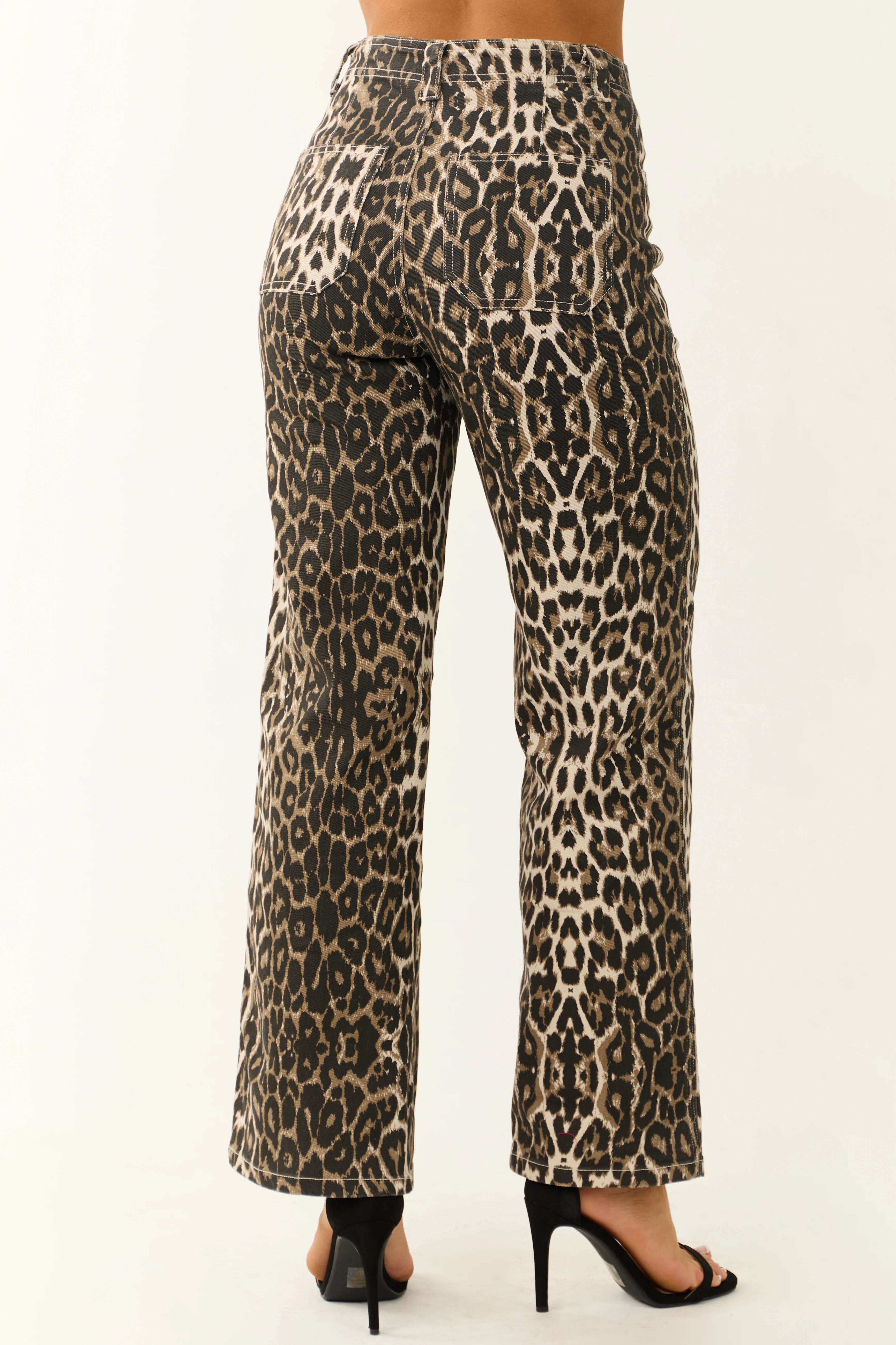 Camel Leopard Print Denim Wide Leg Pants