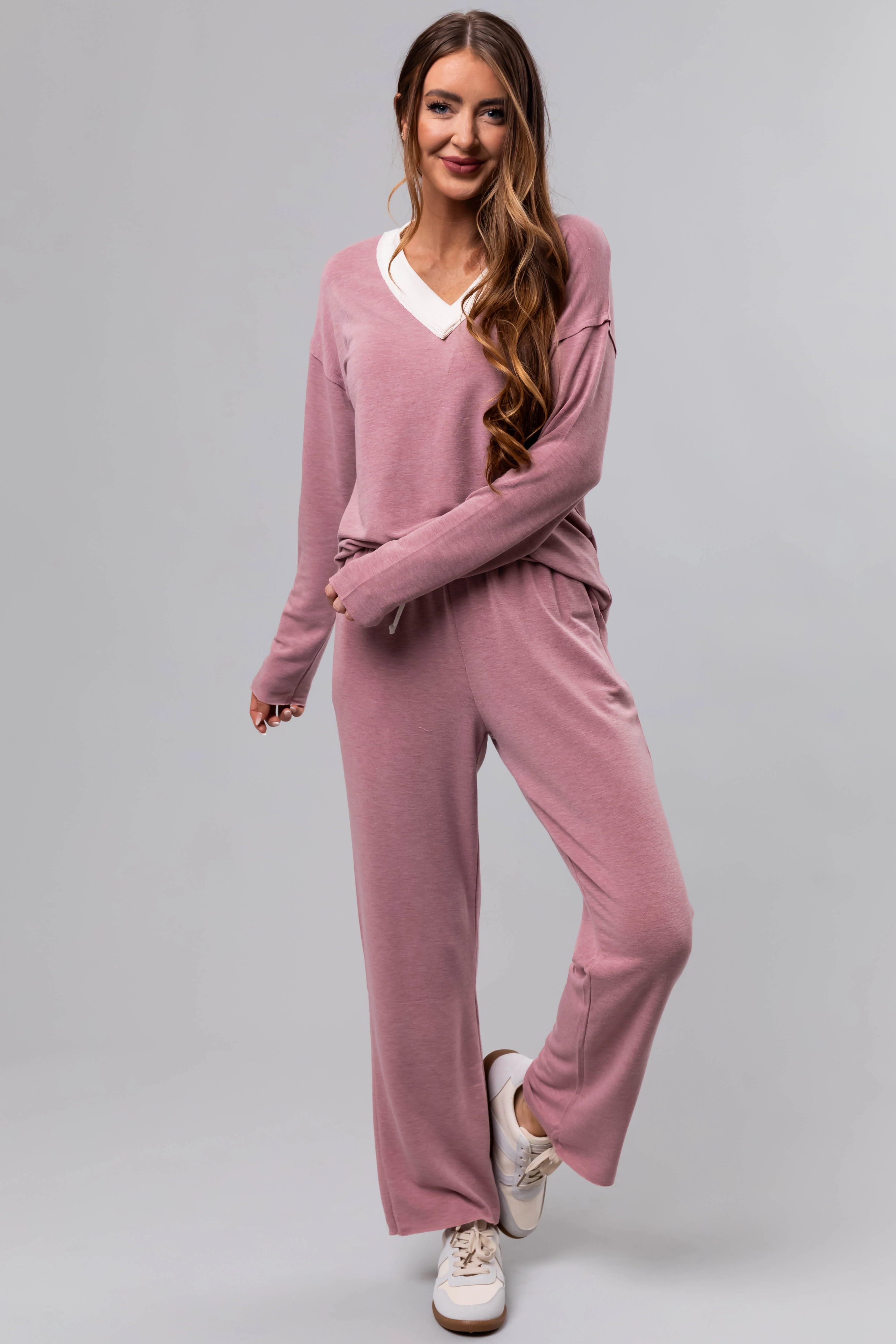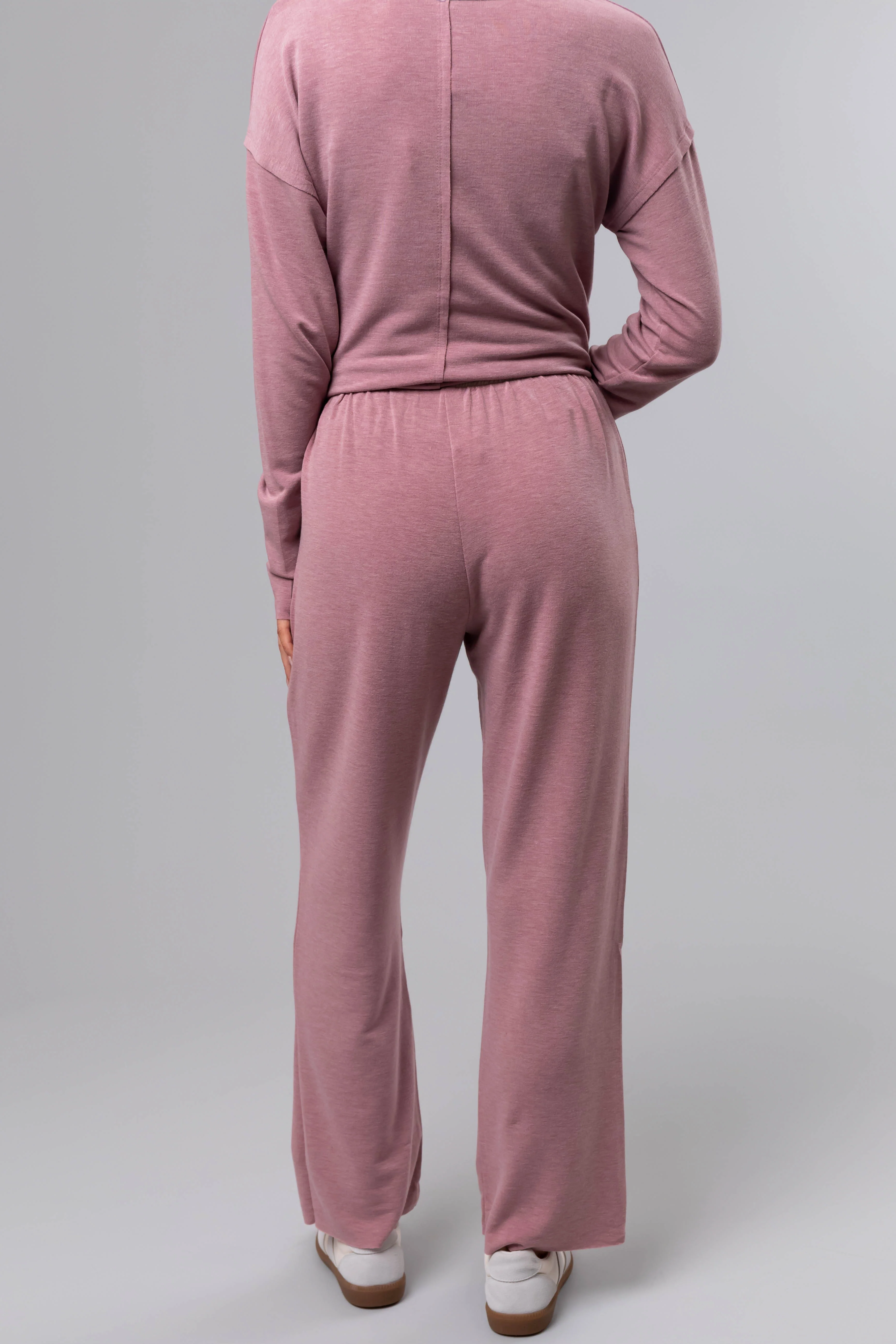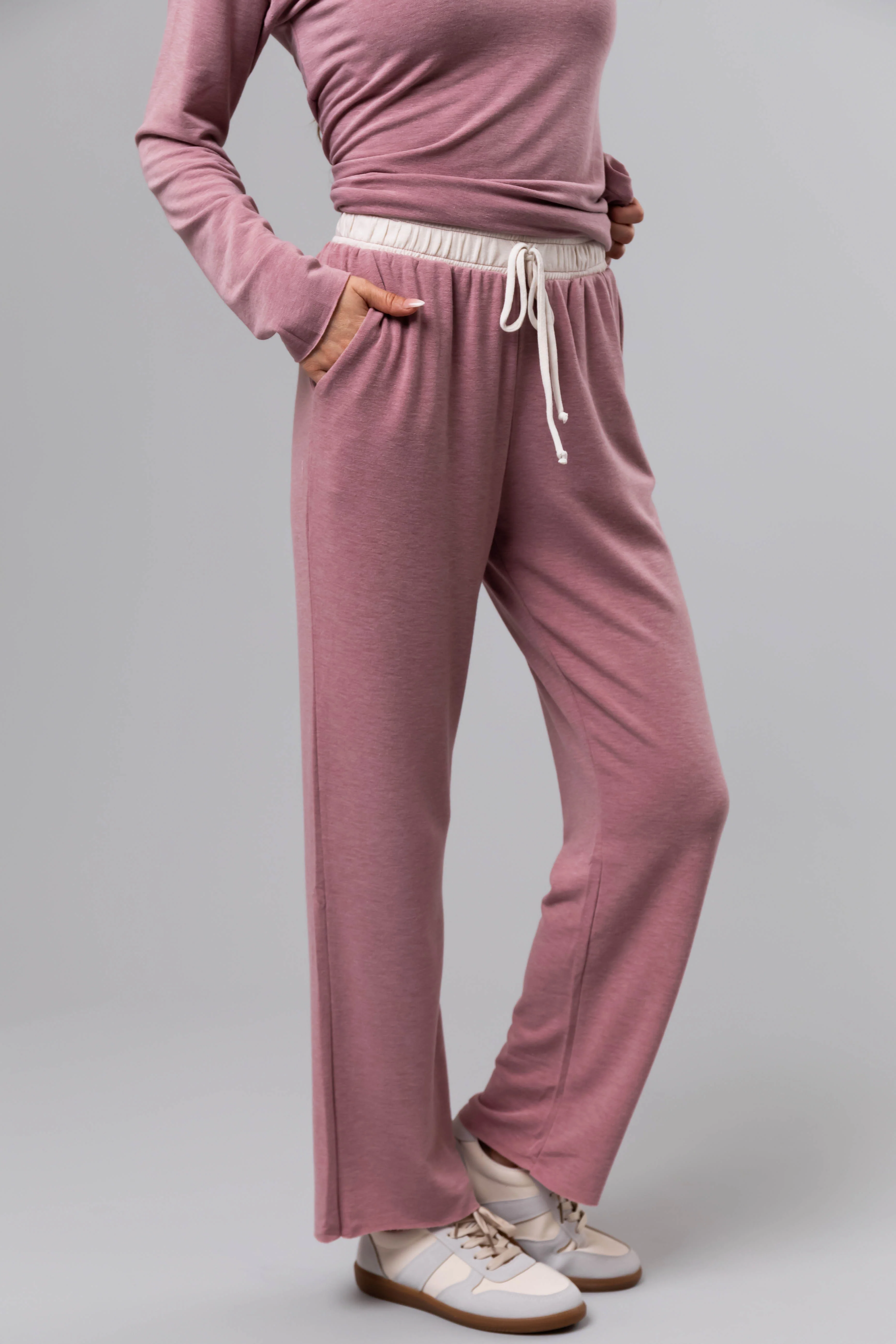 Heathered Rose Contrast Waist Raw Loose Pants