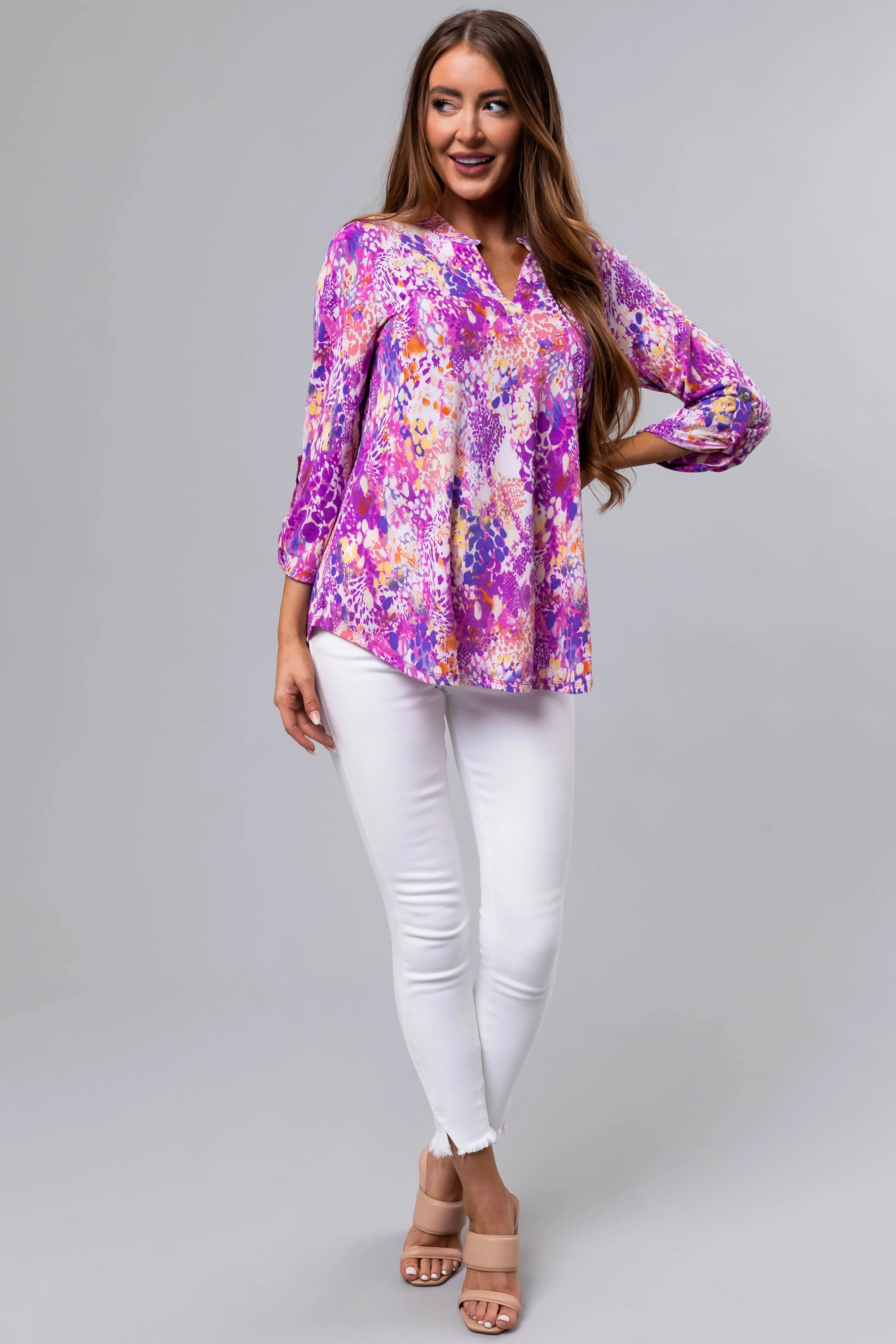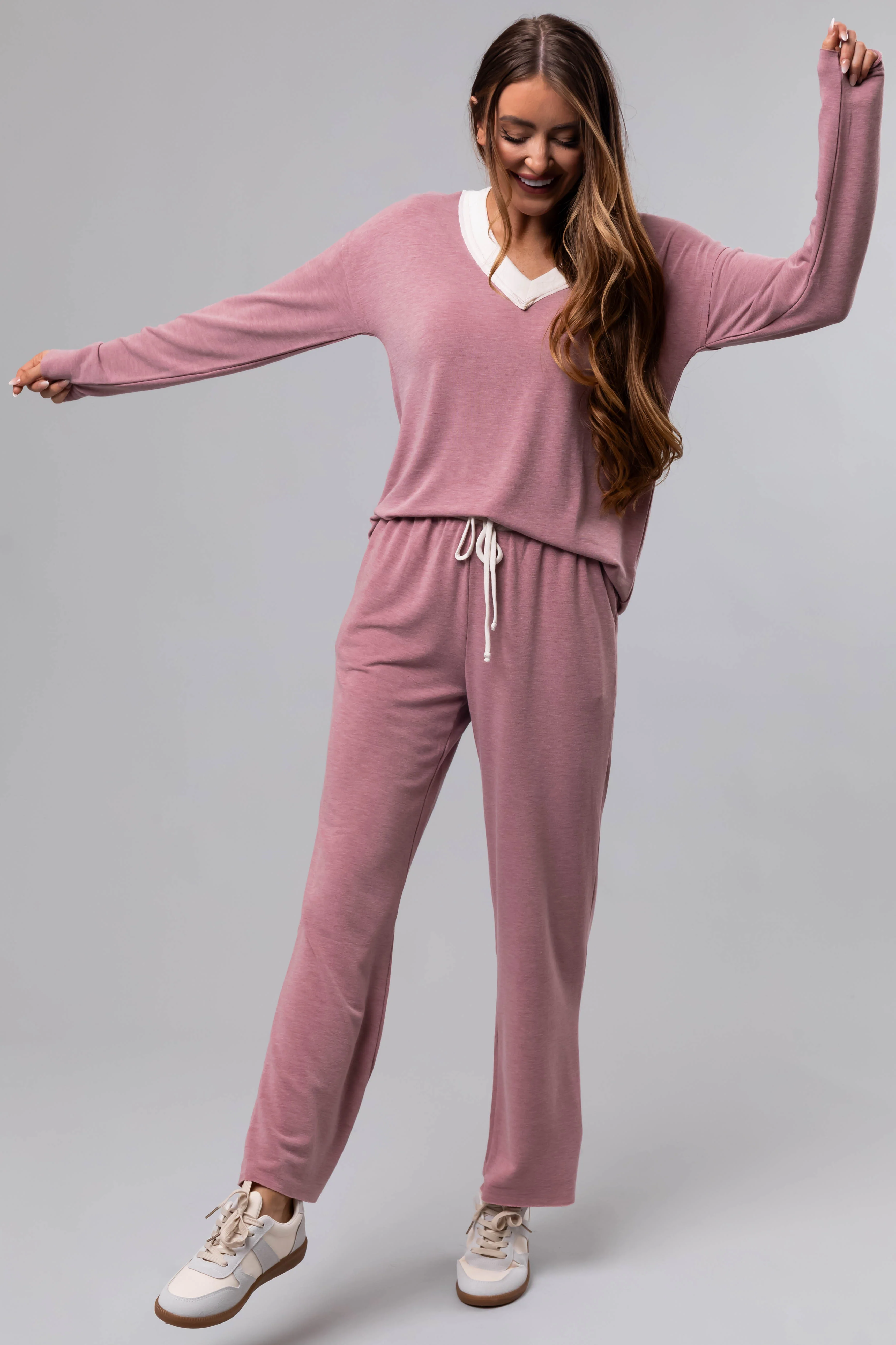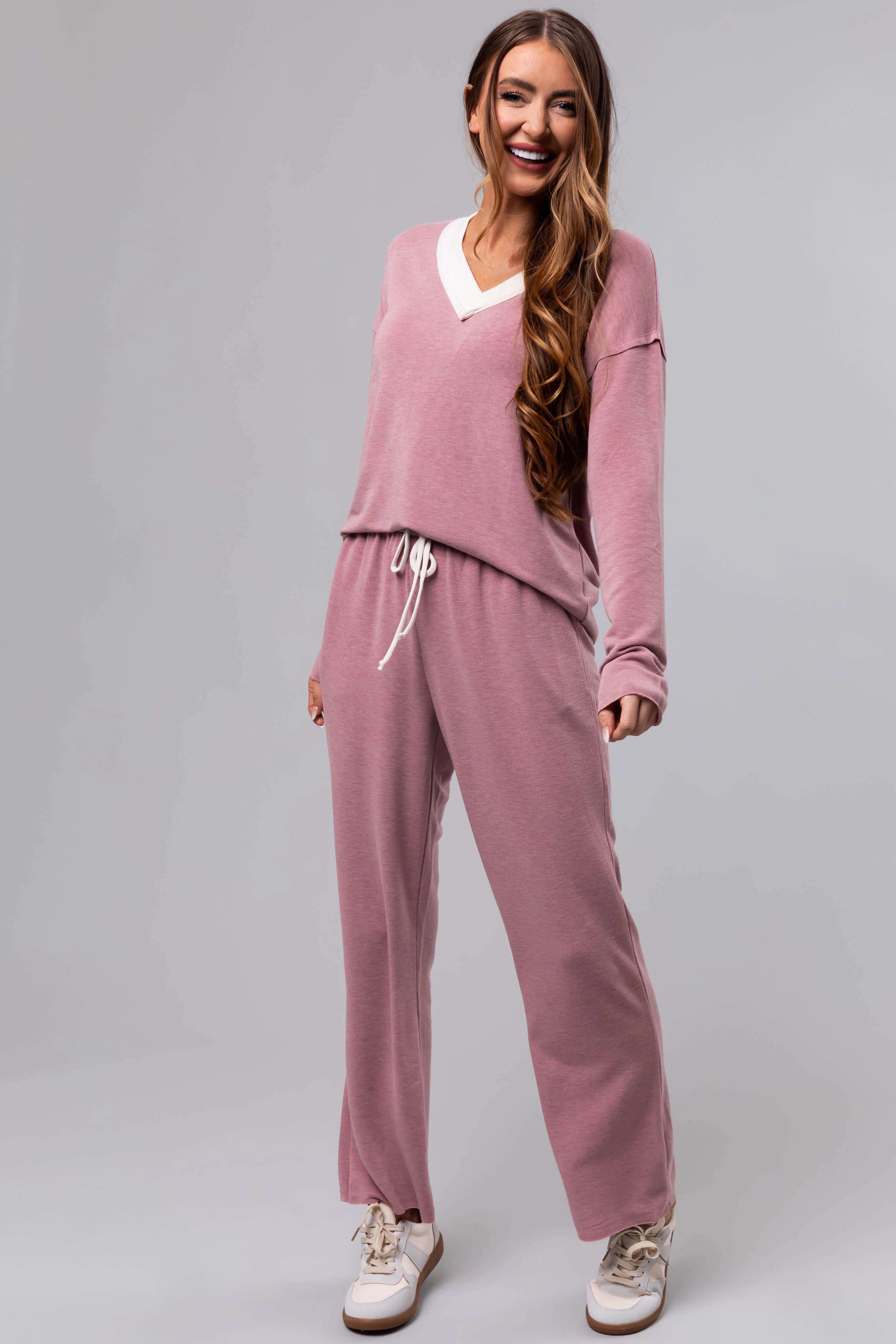 Heathered Rose Contrast Waist Raw Loose Pants