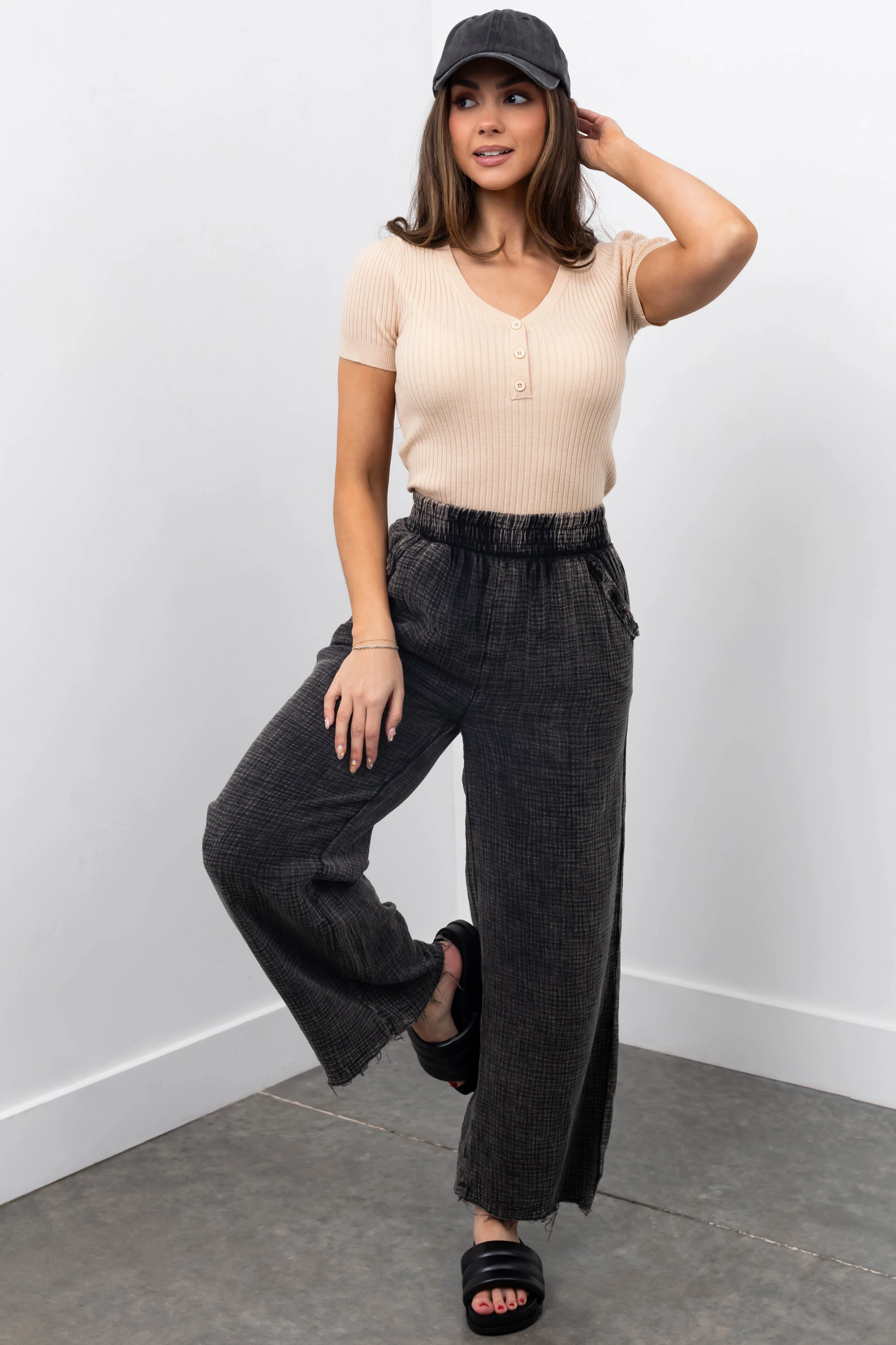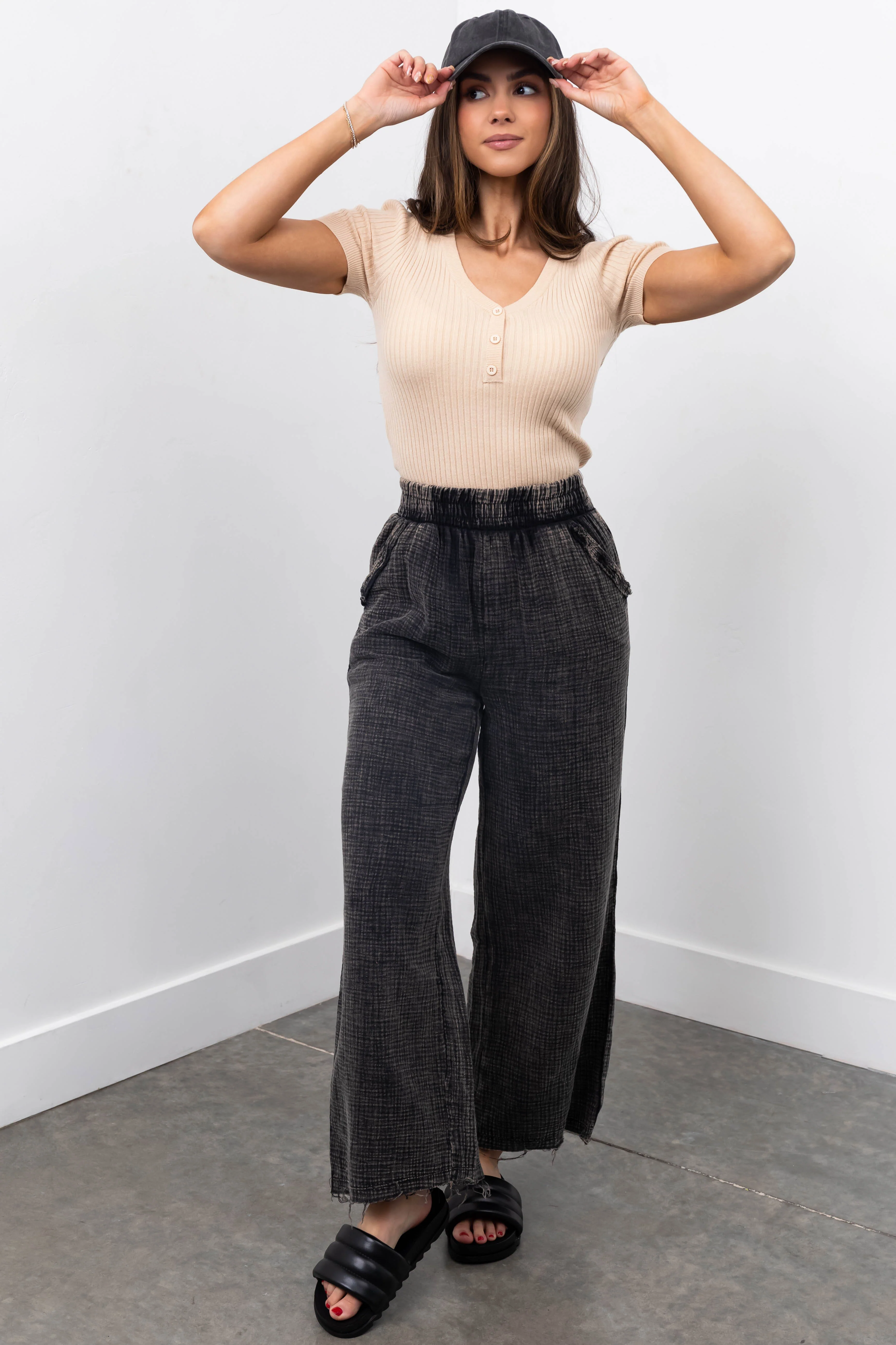 Charcoal Washed Elastic Waist Wide Leg Pants