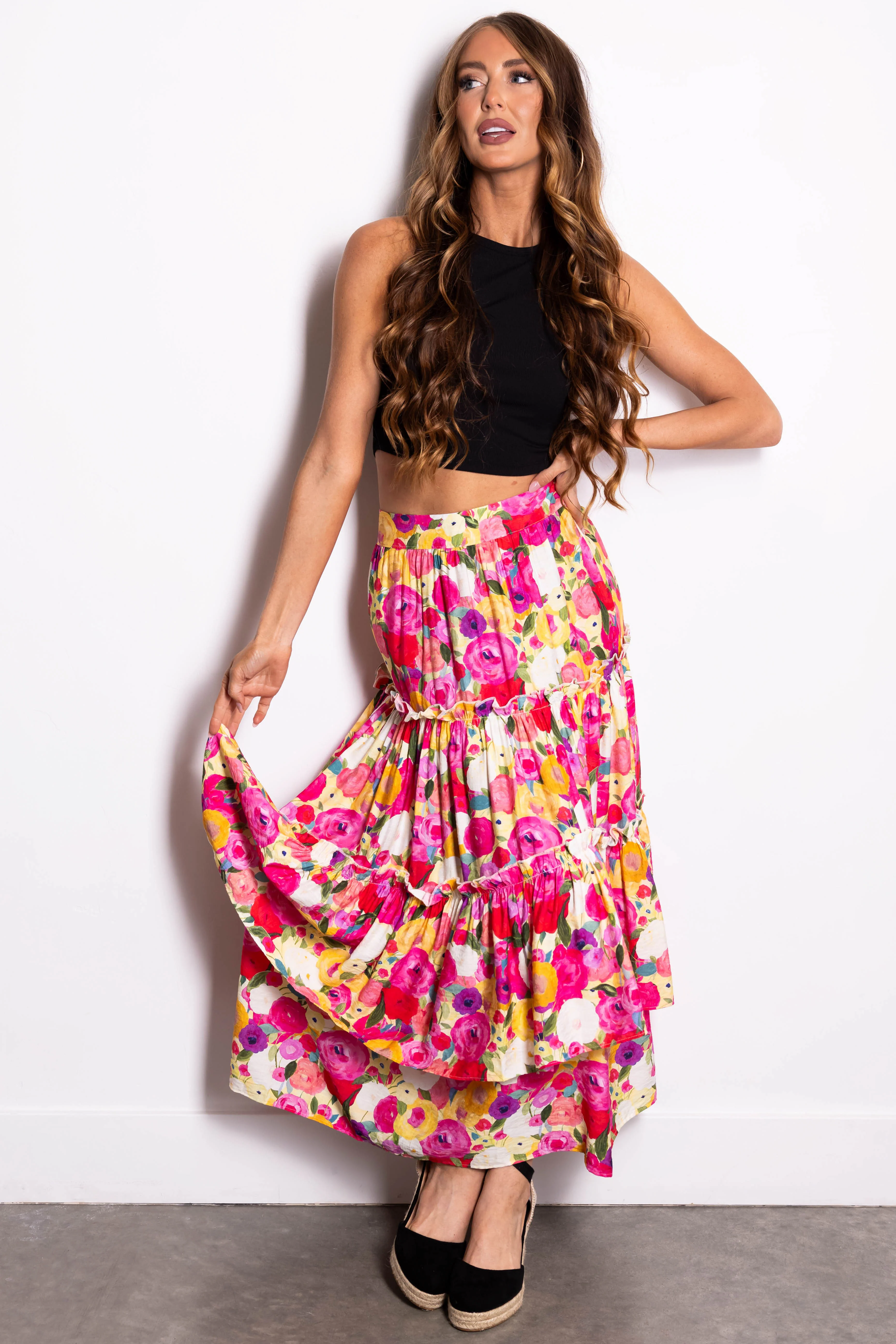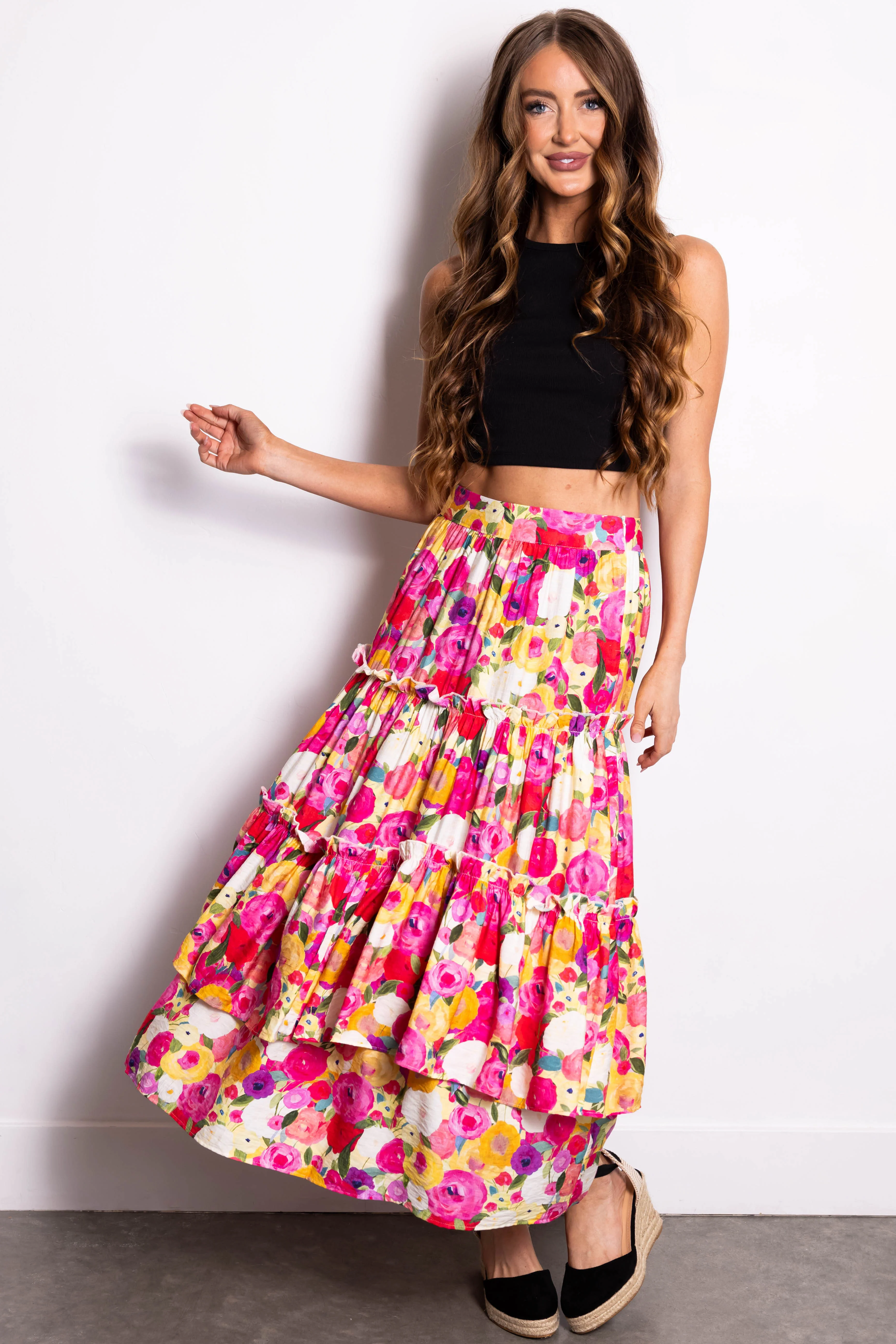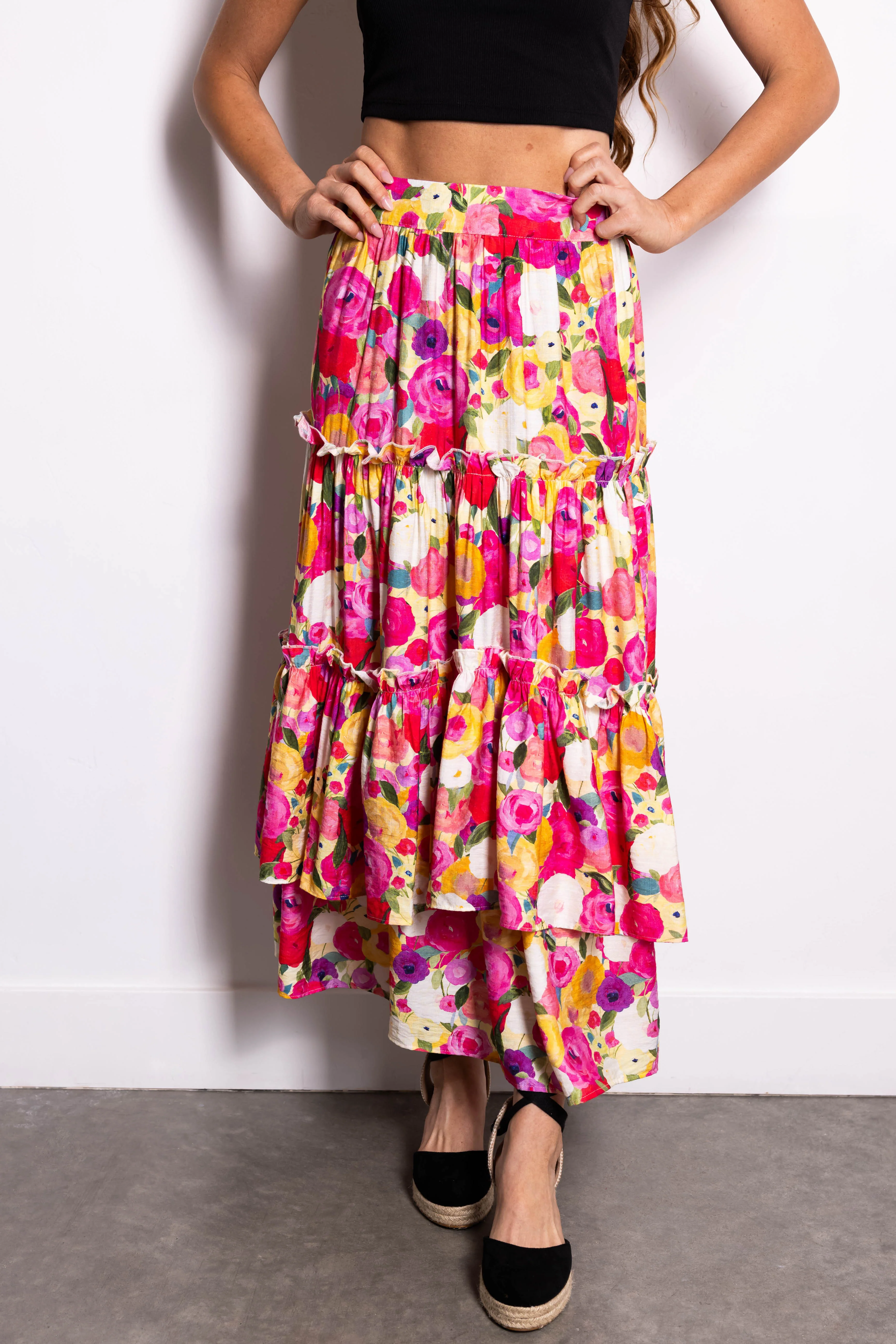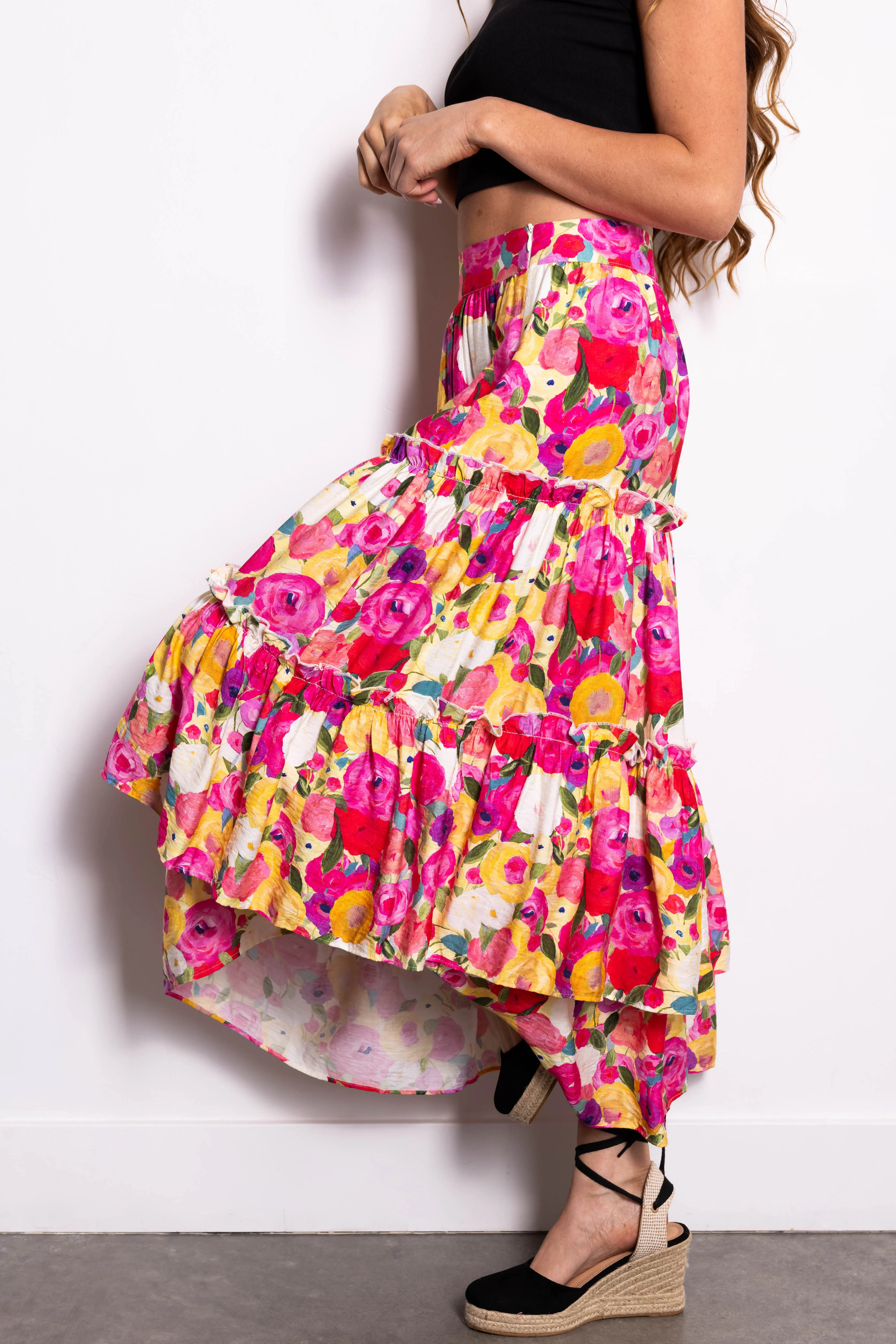 Raspberry Floral Print Tiered Maxi Skirt