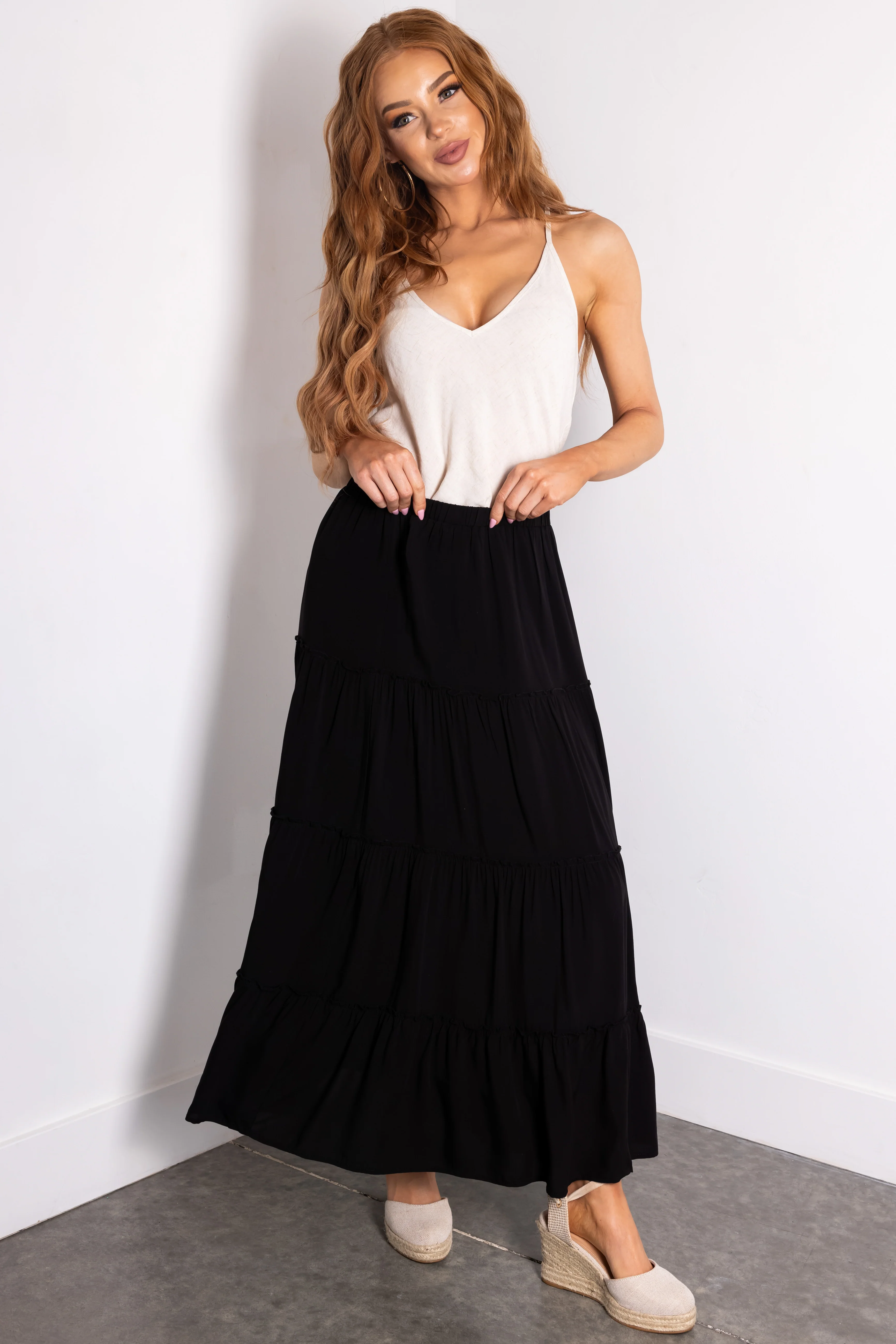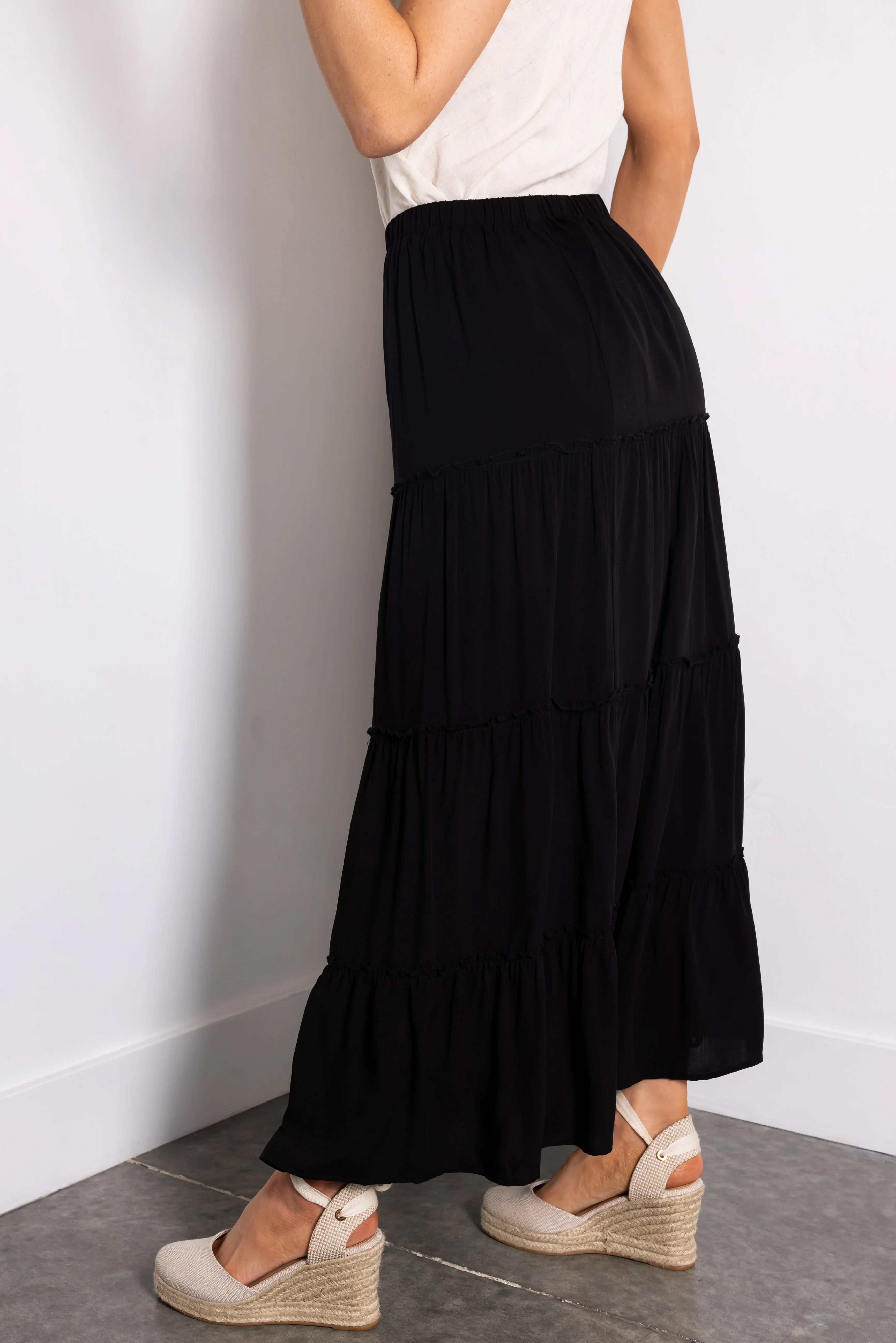 Black Tiered Elastic Waist Woven Maxi Skirt