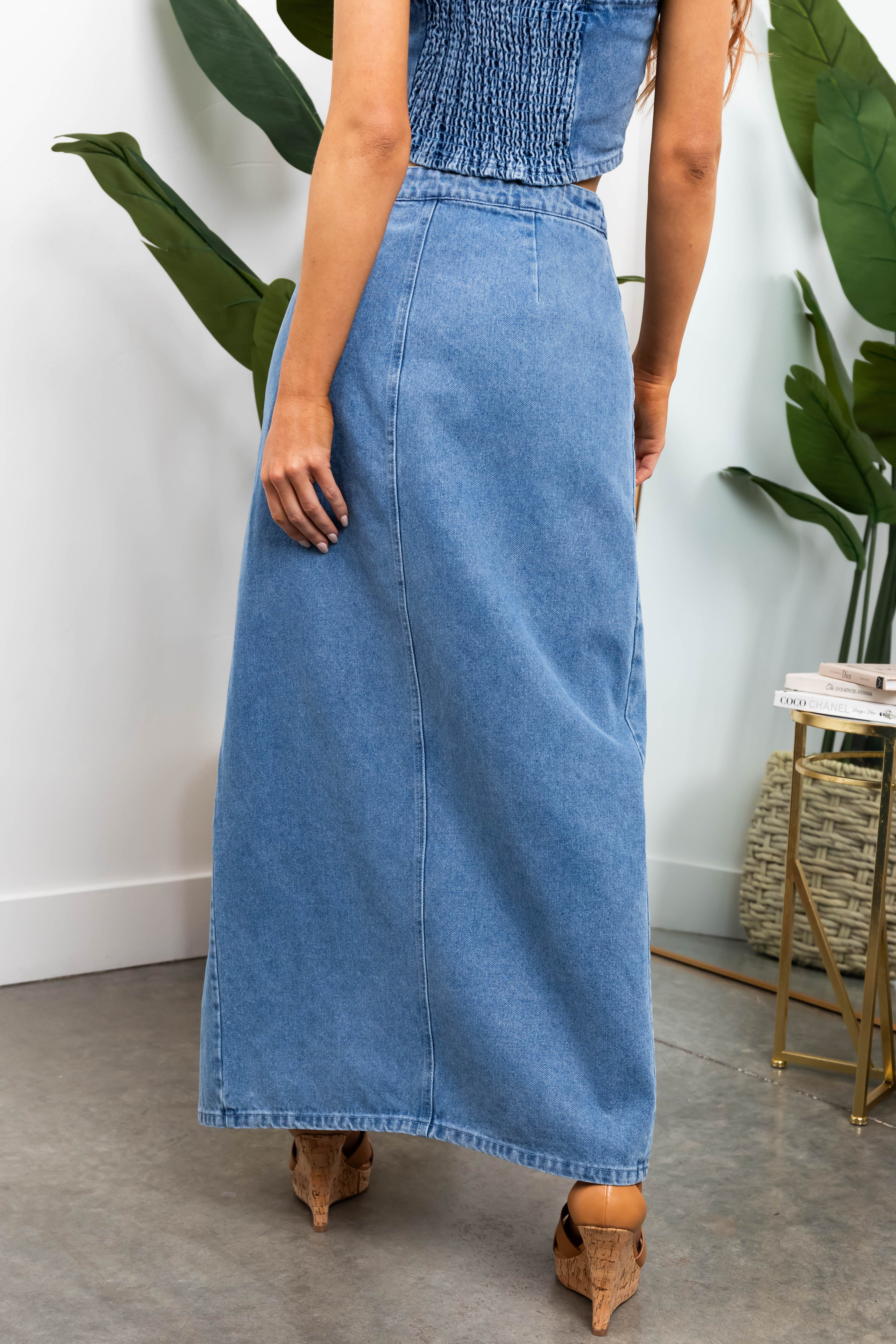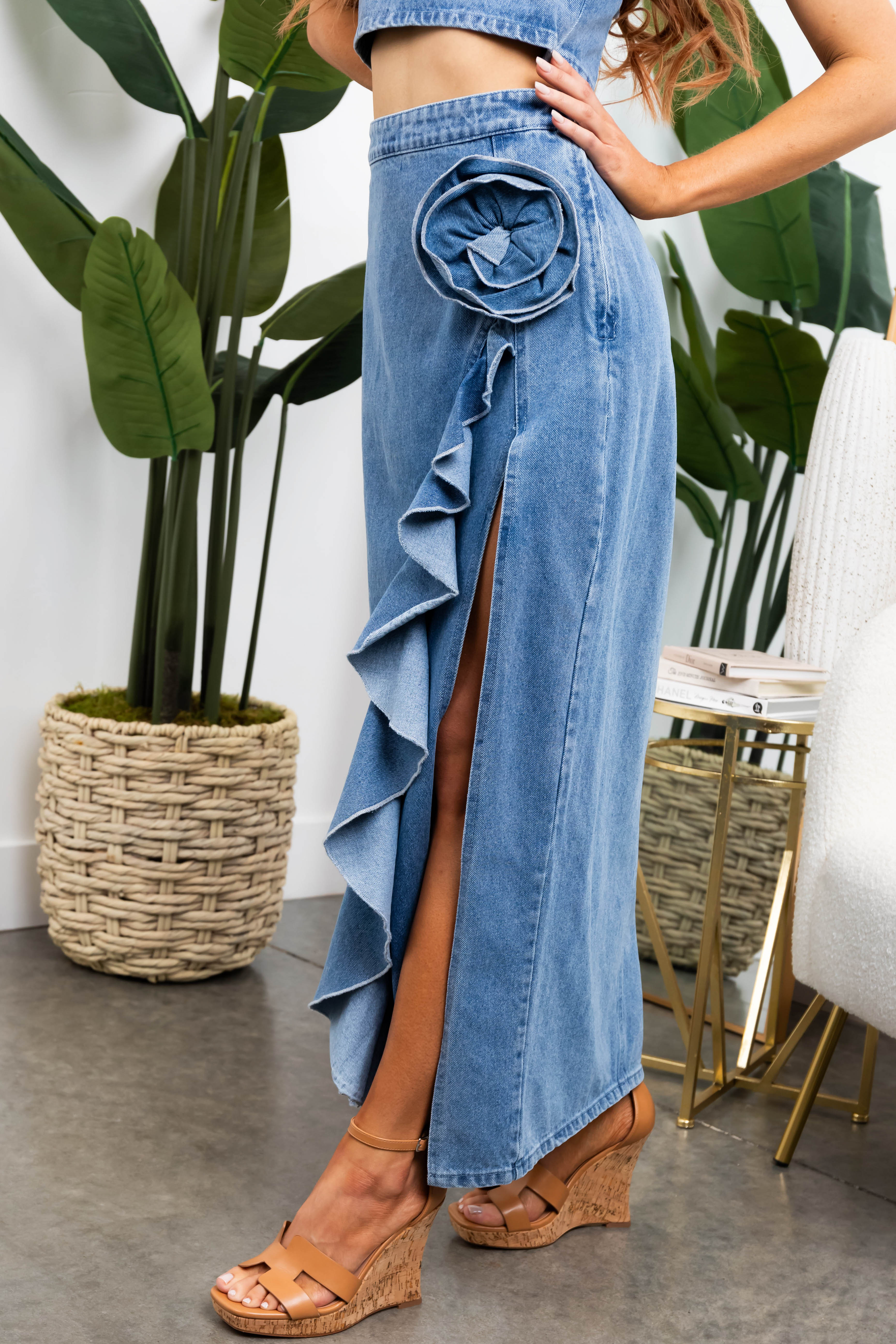 Light Wash Denim Front Slit Ruffle Maxi Skirt