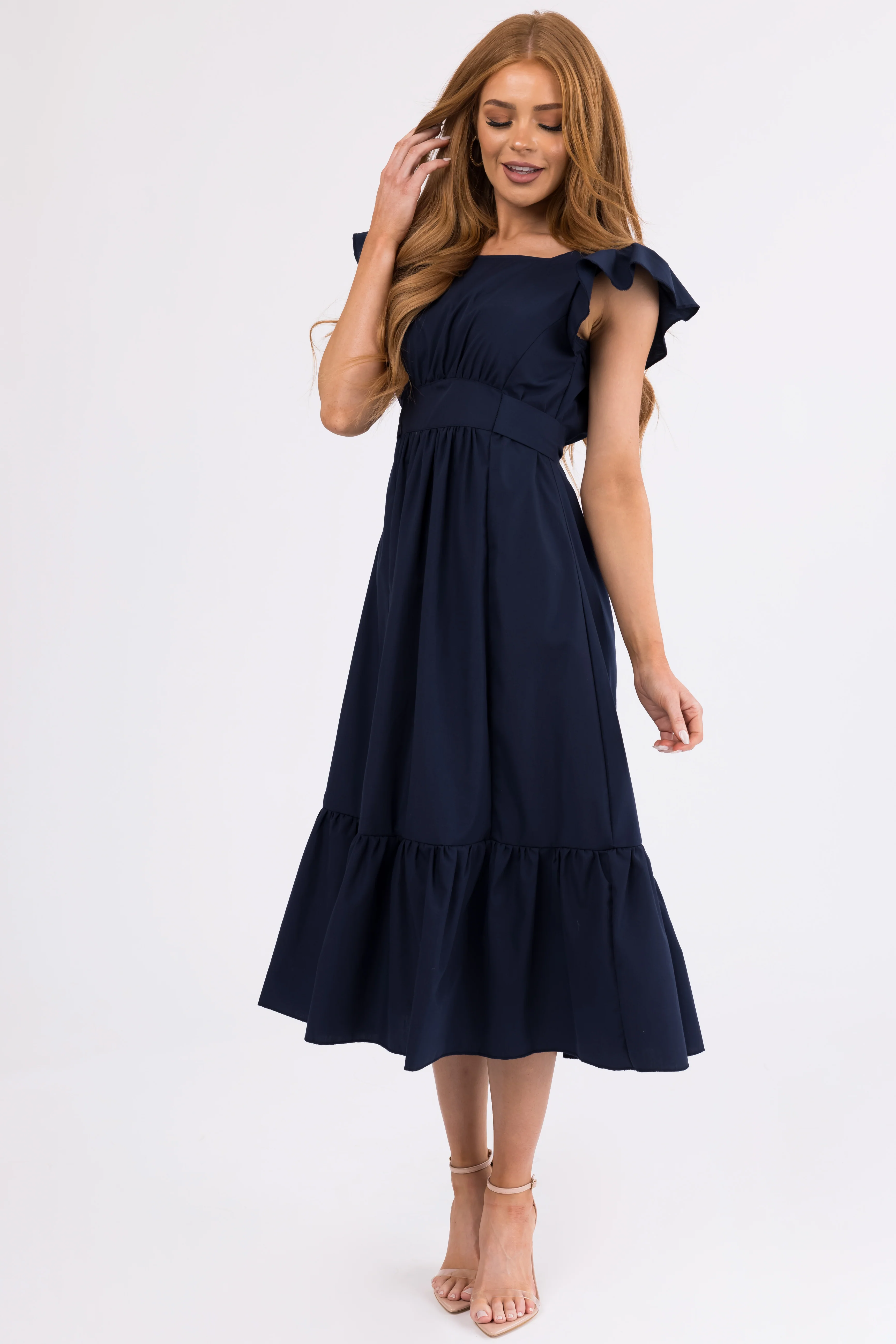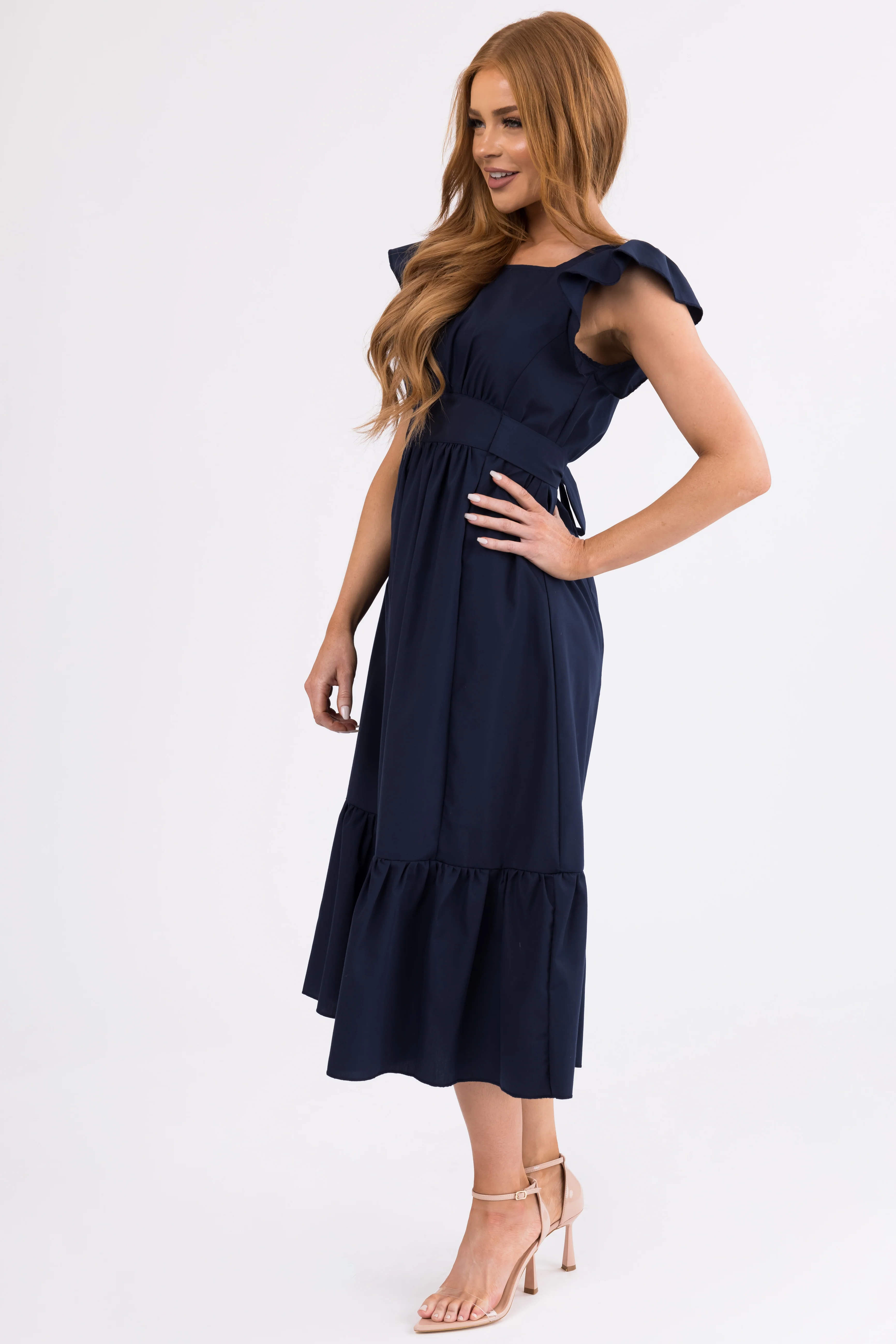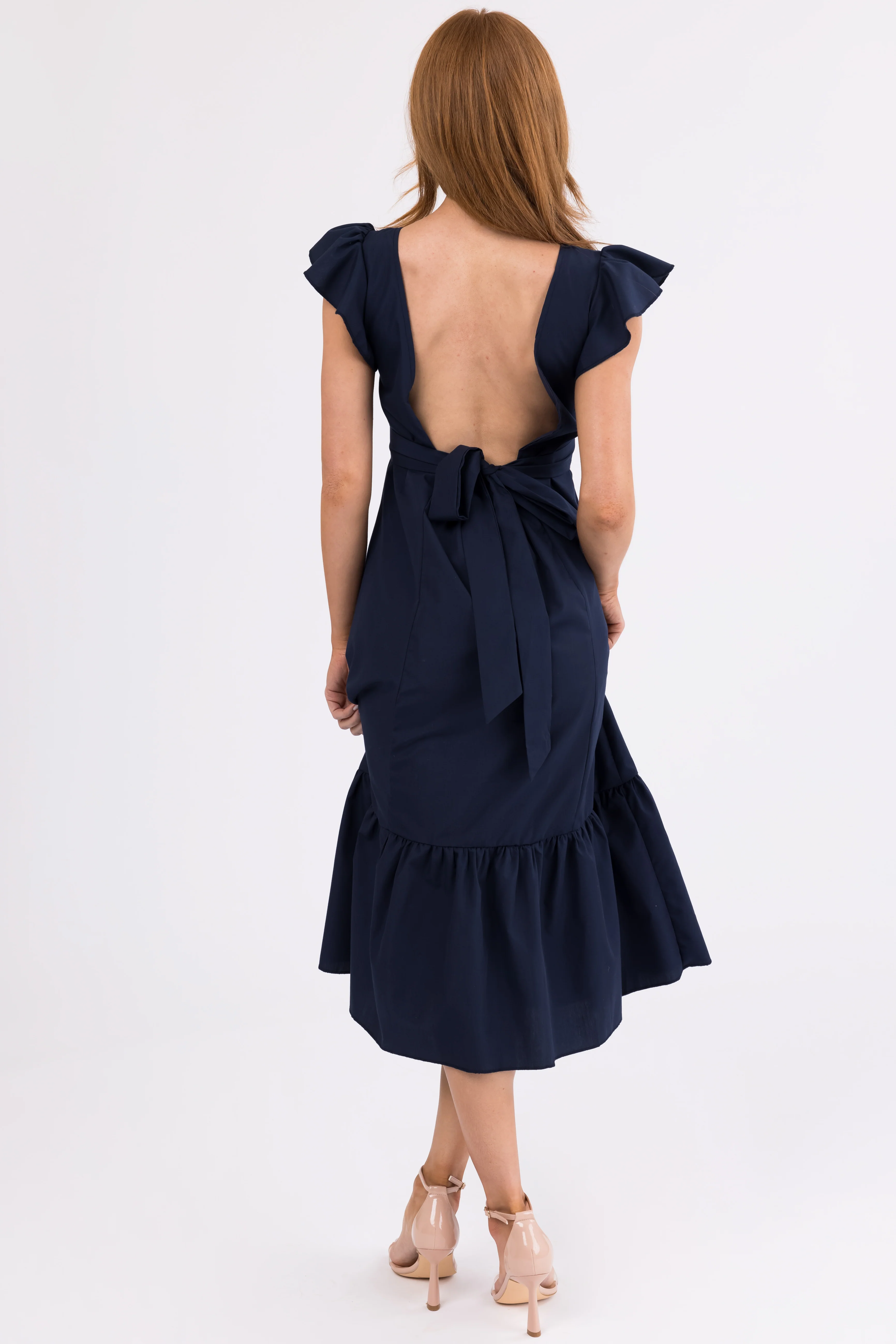 Navy Open Back Ruffle Short Sleeve Midi Dress