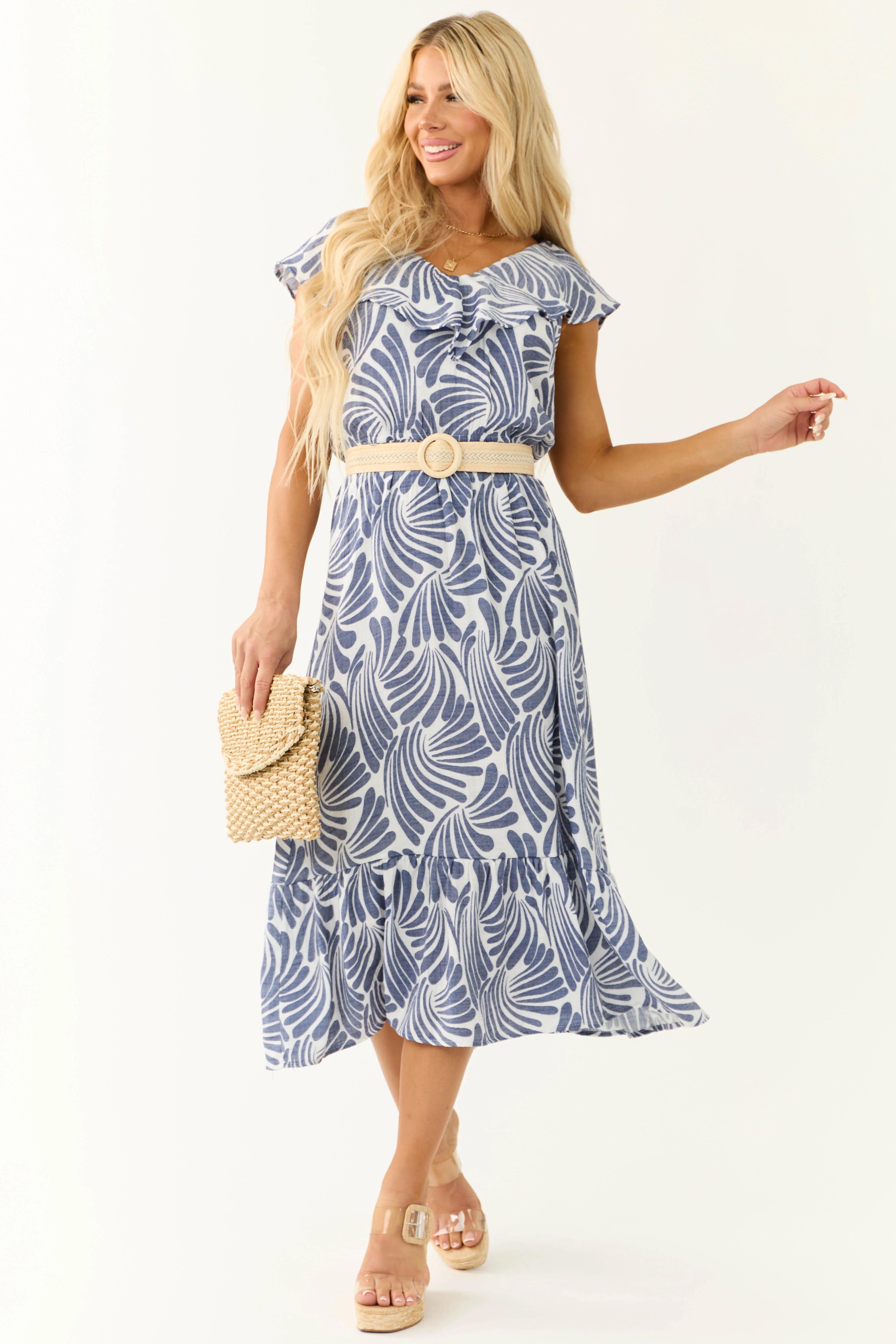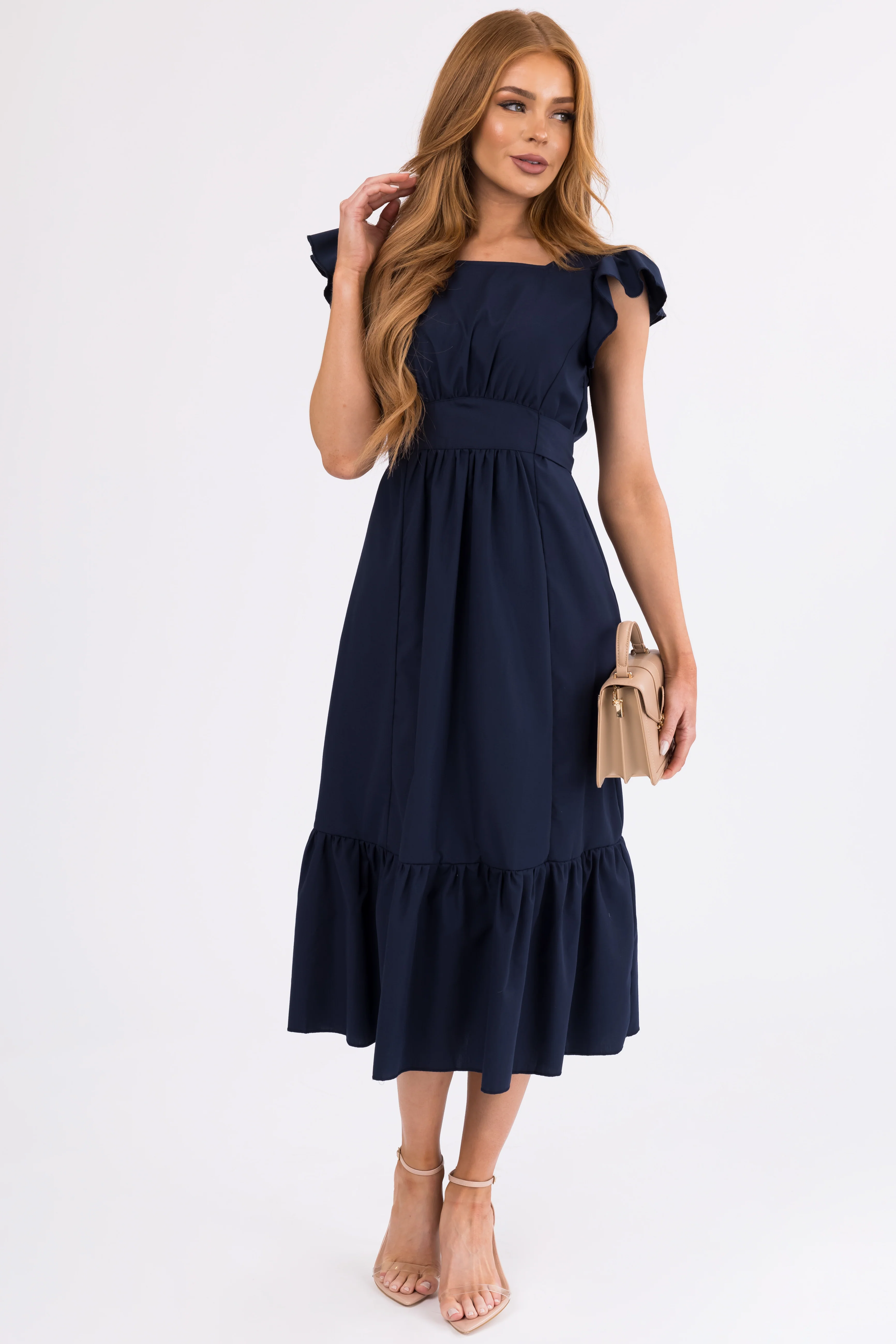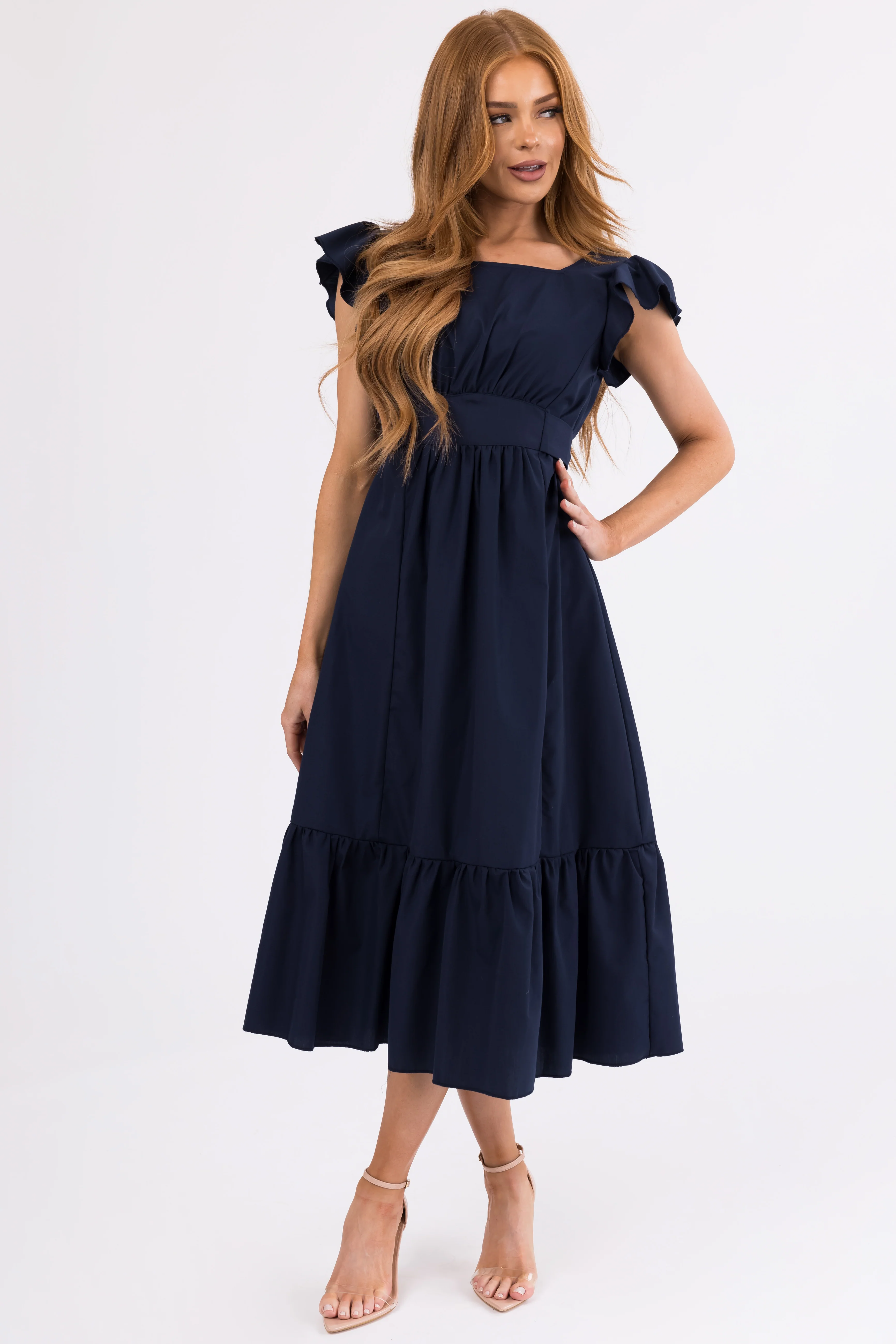 Navy Open Back Ruffle Short Sleeve Midi Dress