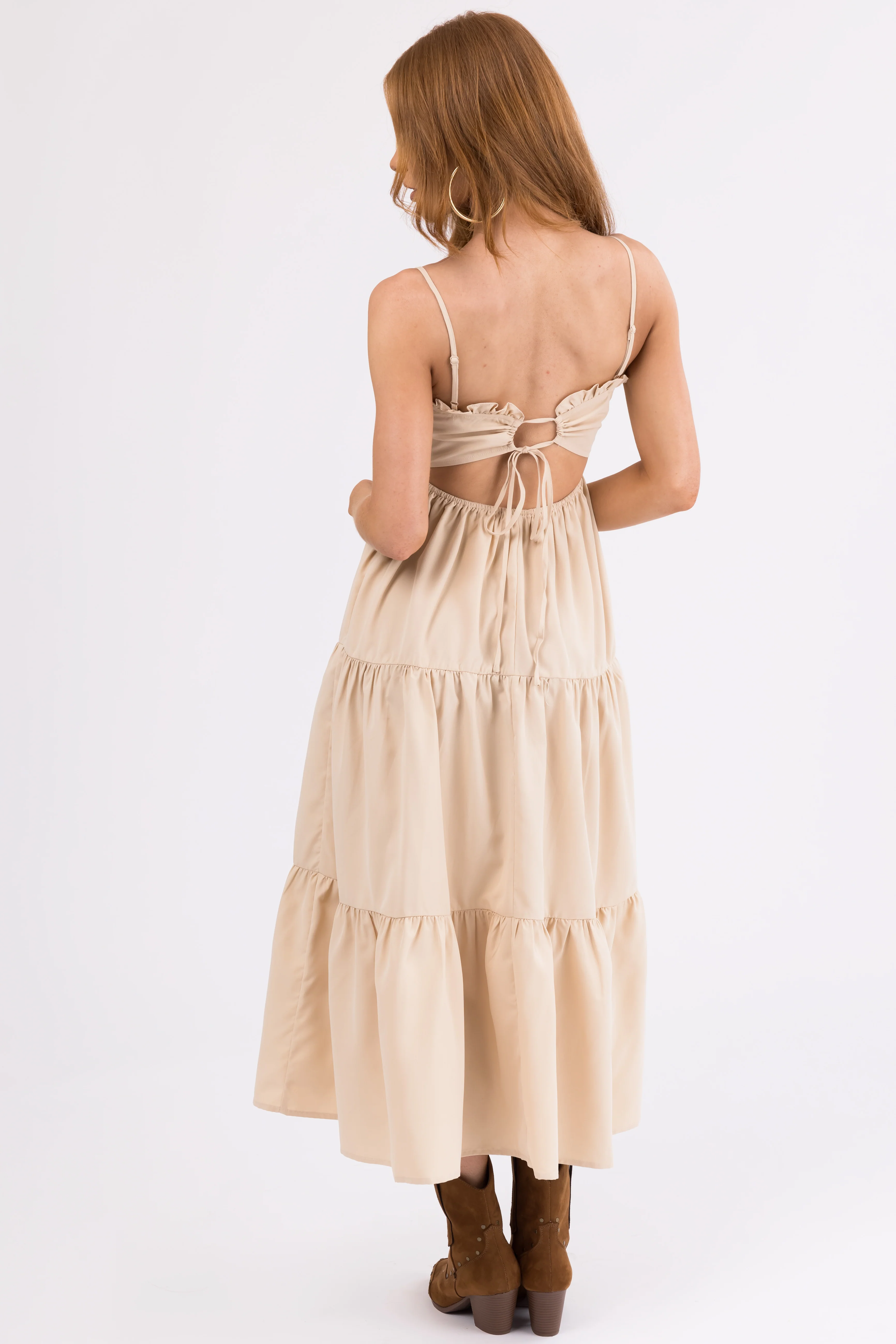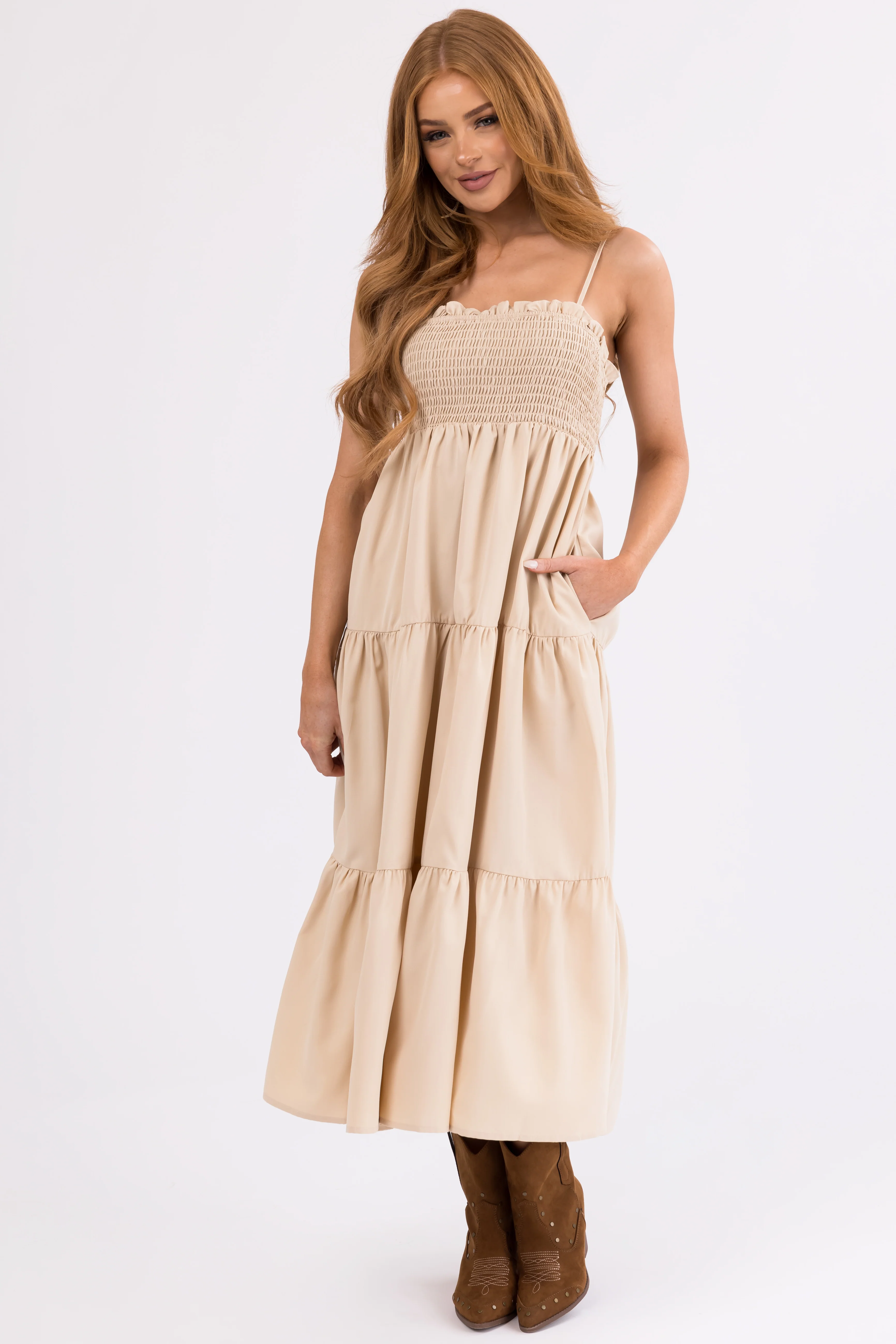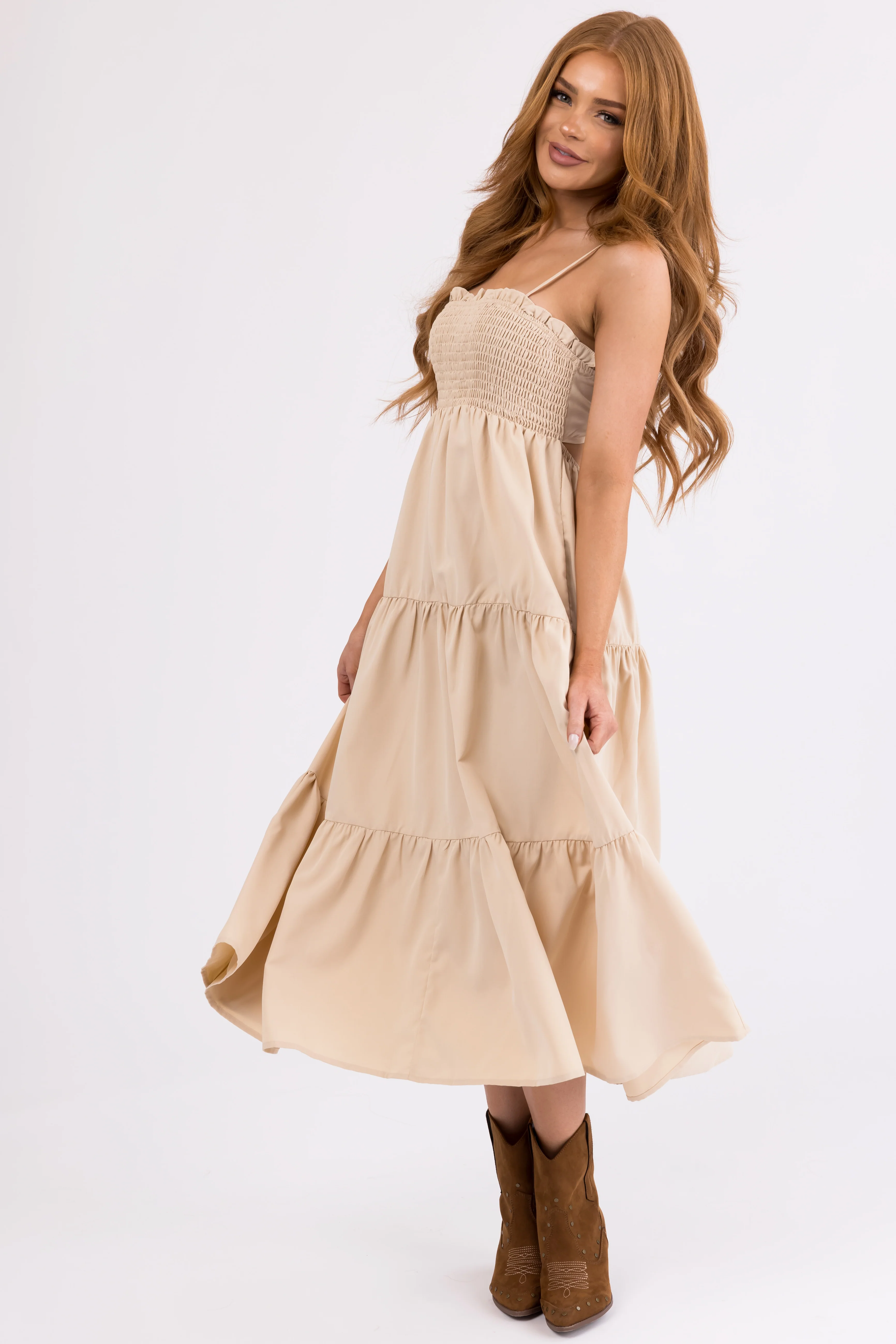Beige Smocked Tiered Sleeveless Midi Dress