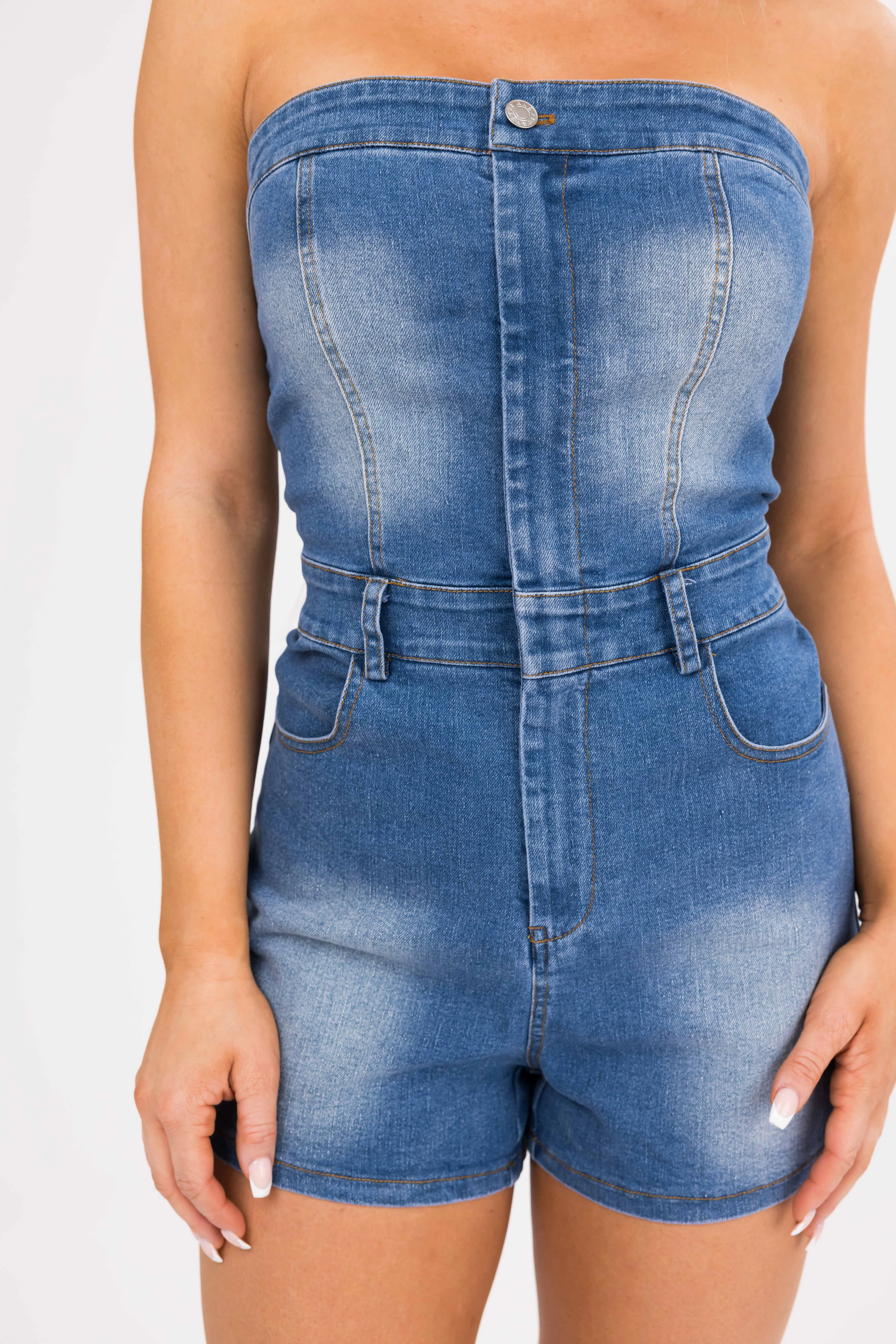 Medium Wash Denim Strapless Zip Up Romper