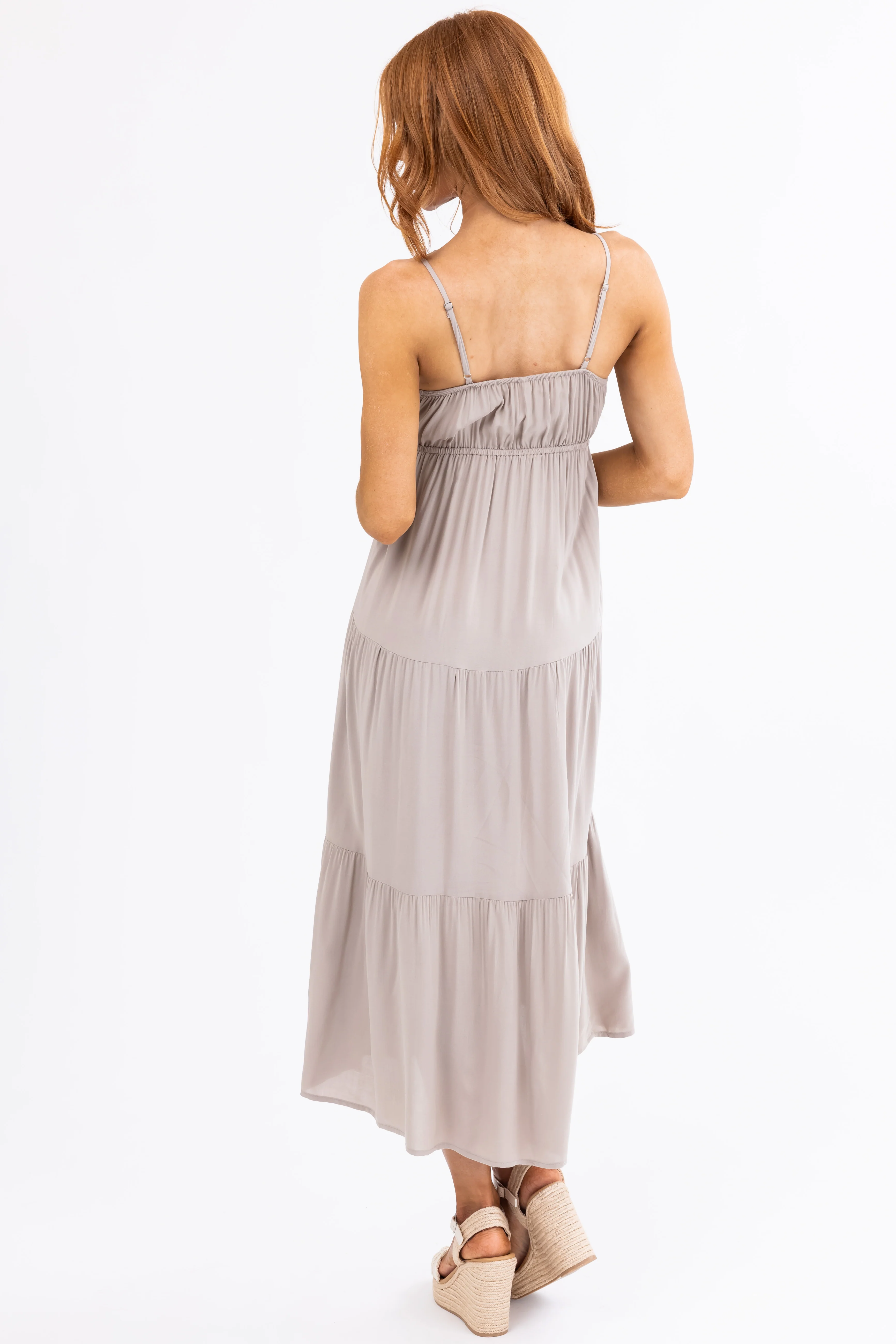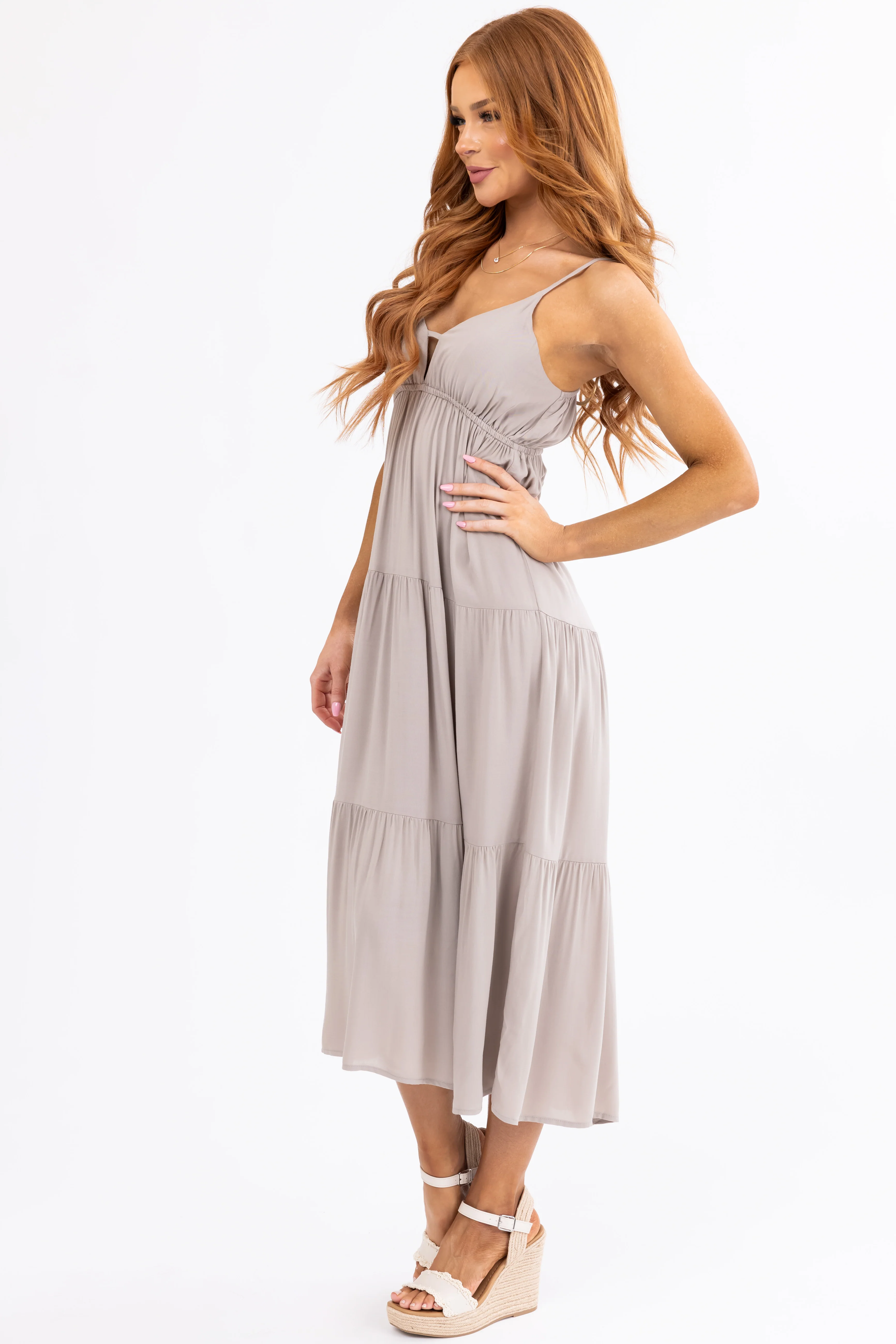 Oatmeal Sweetheart Neck Tiered Midi Dress