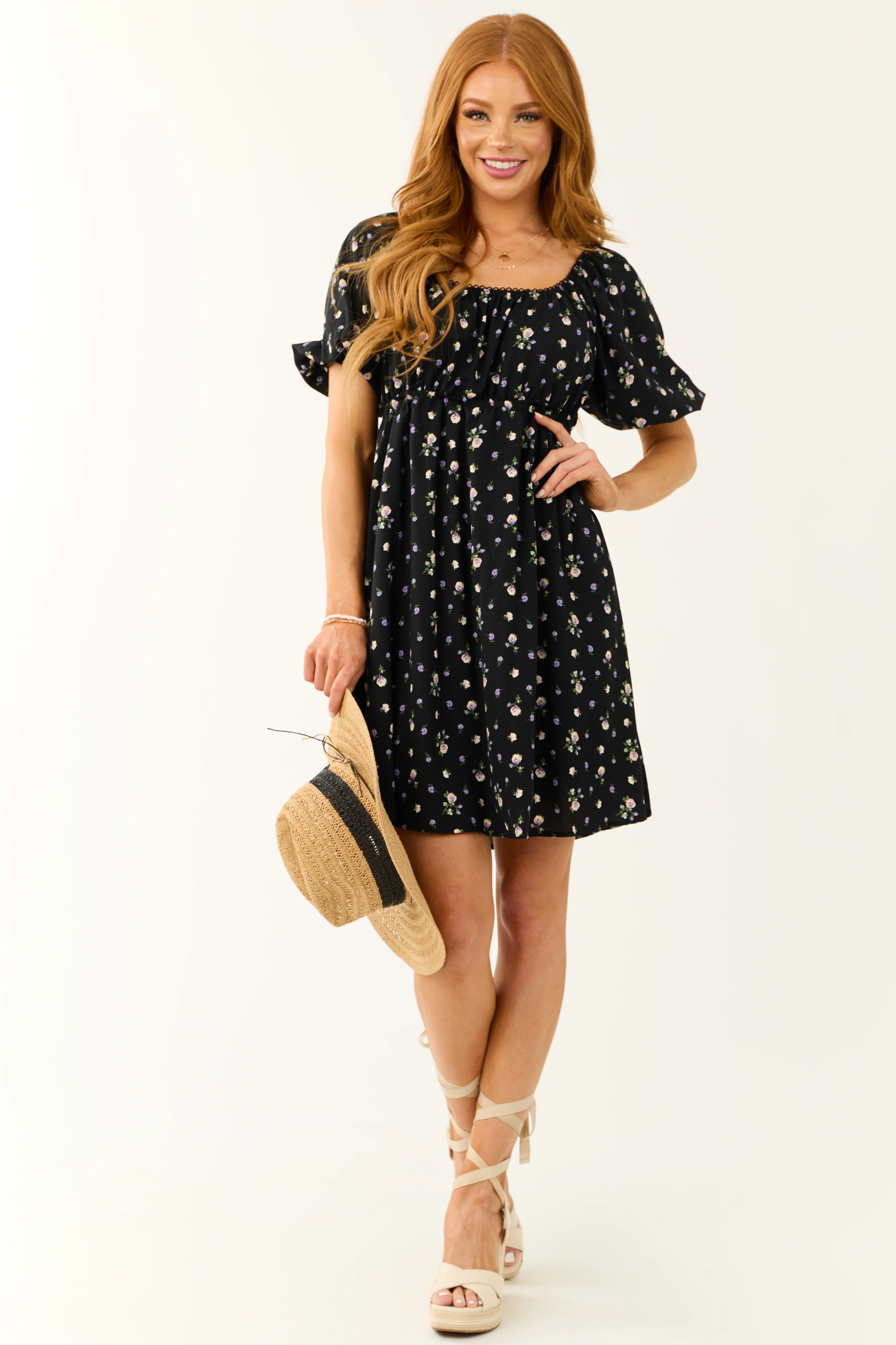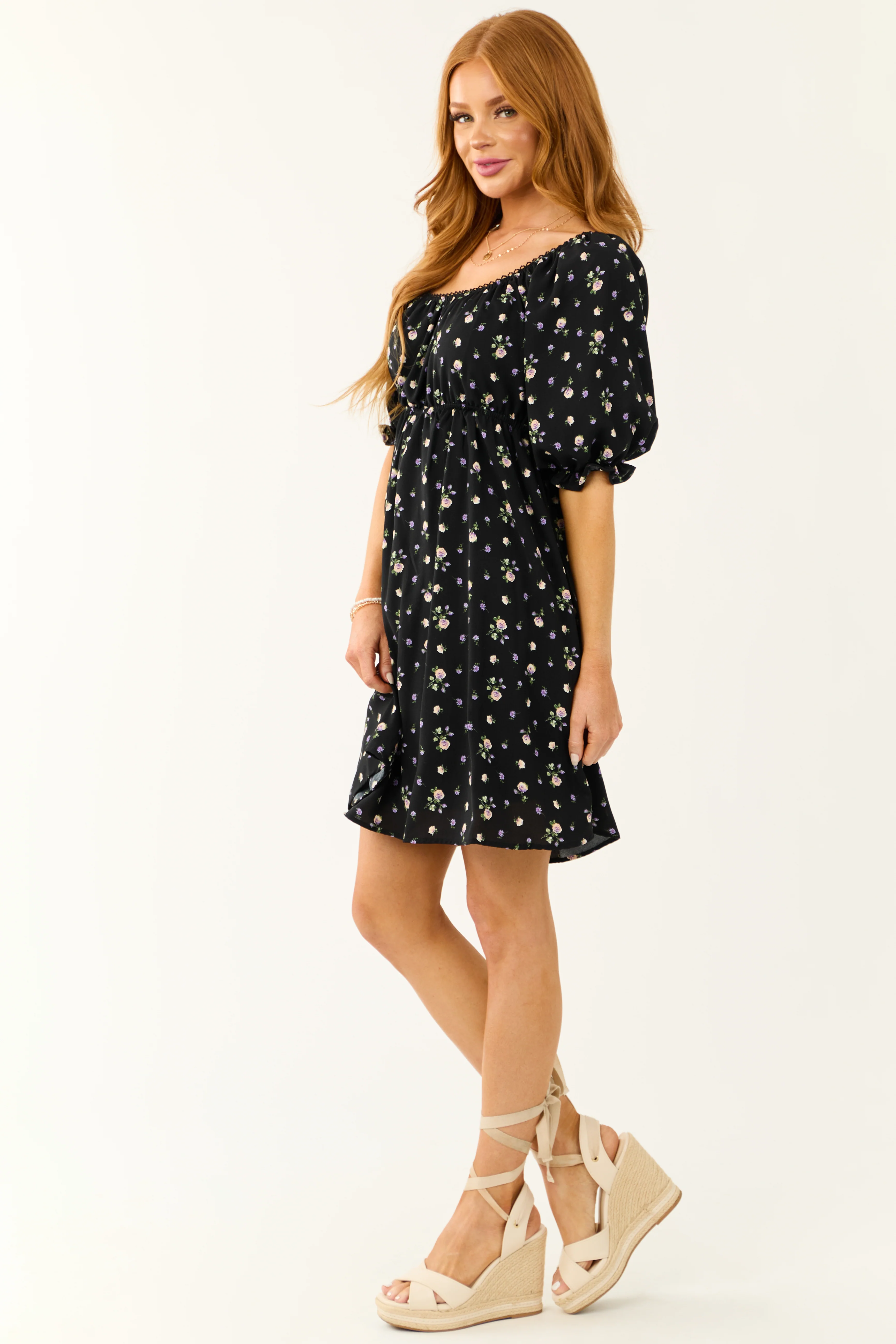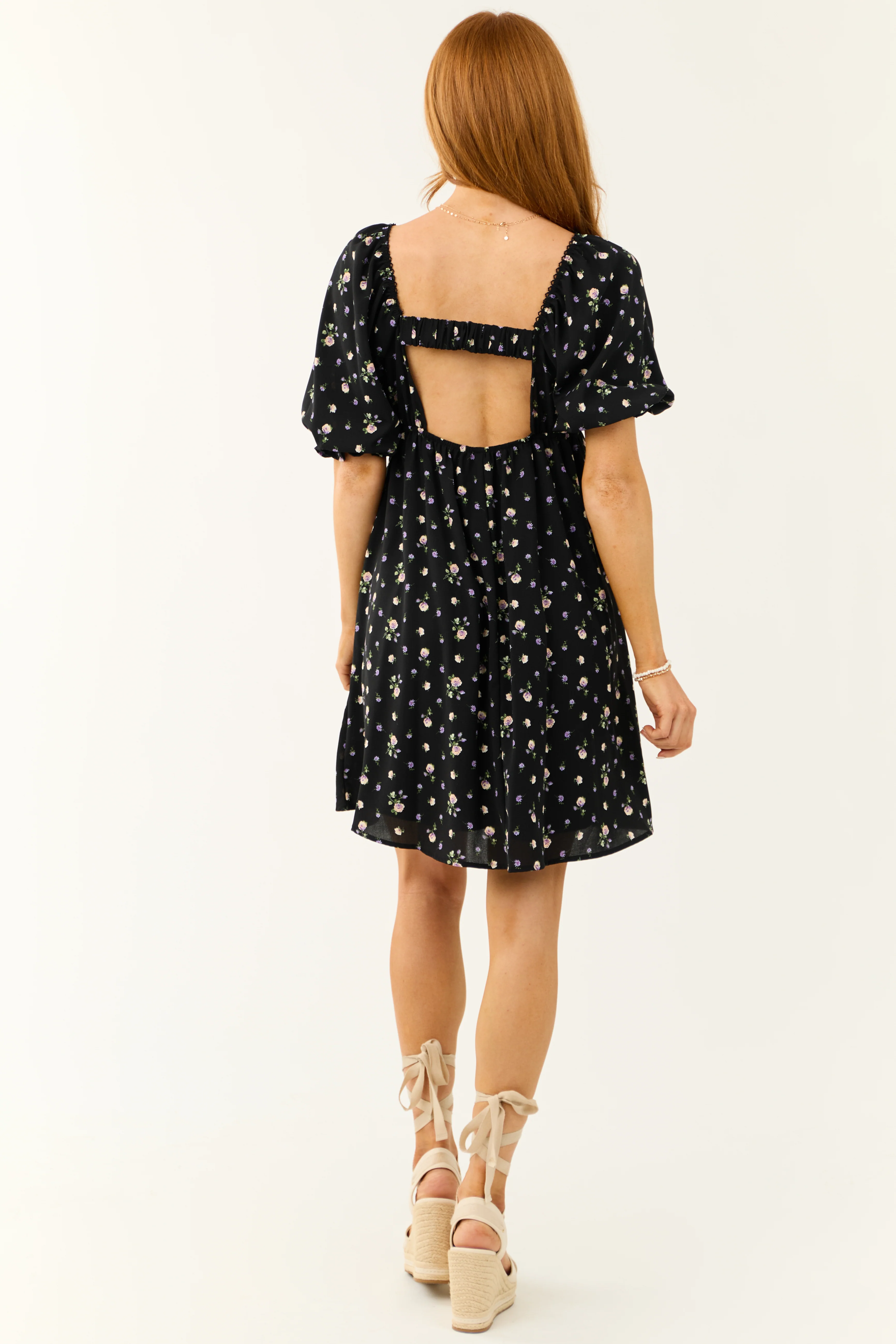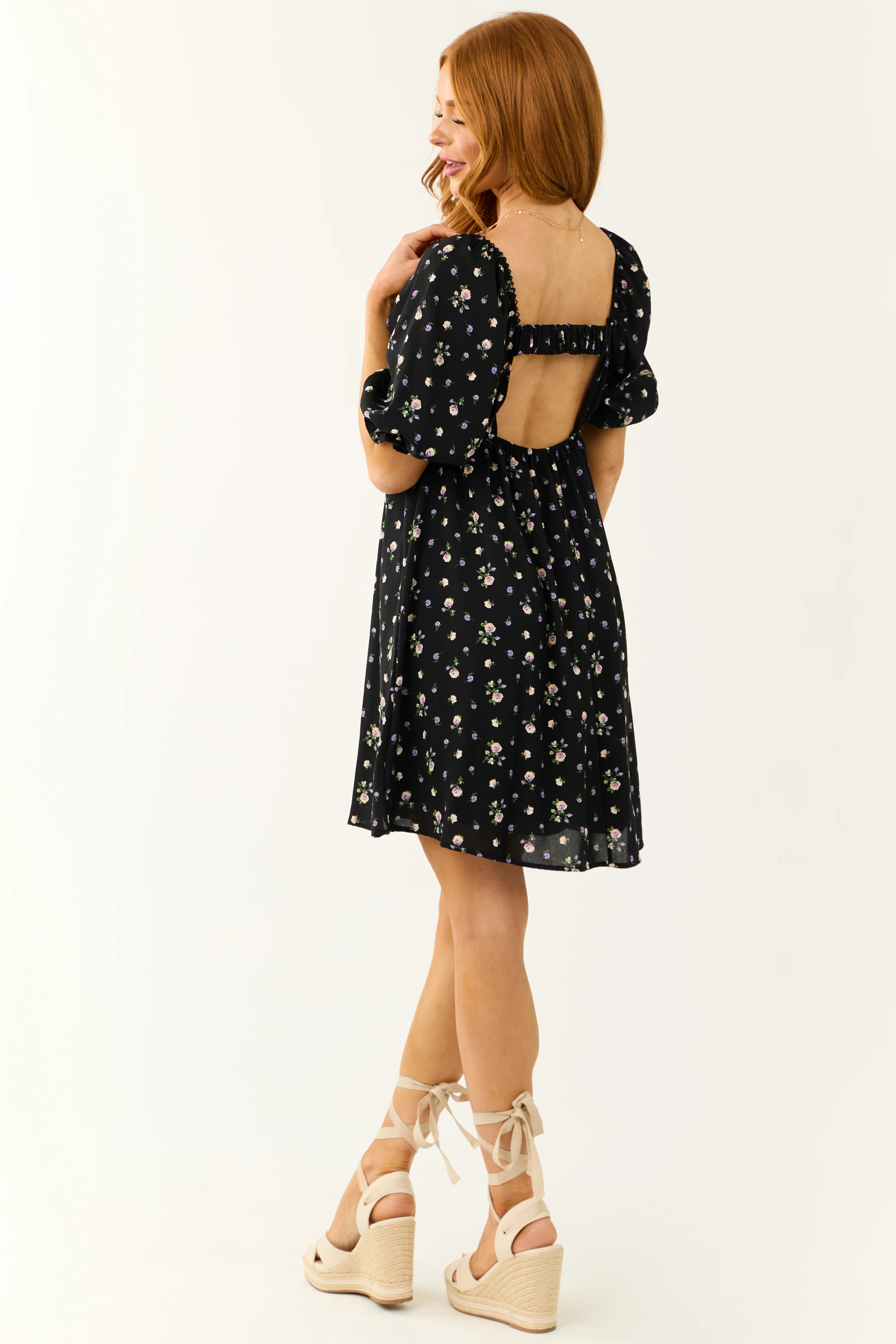 Black Floral Print Back Cut Out Mini Dress