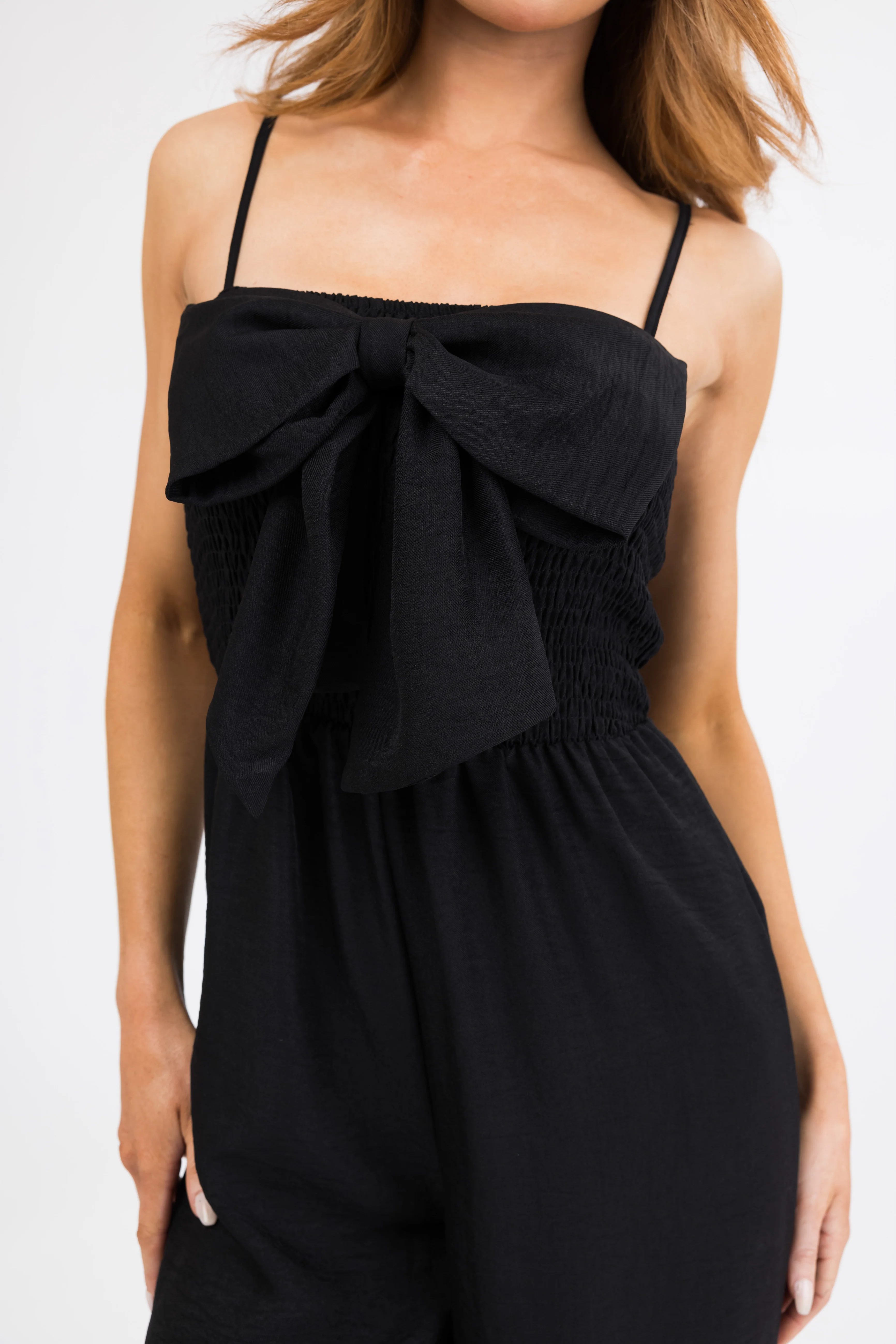 Black Bow Front Smocked Jumpsuit