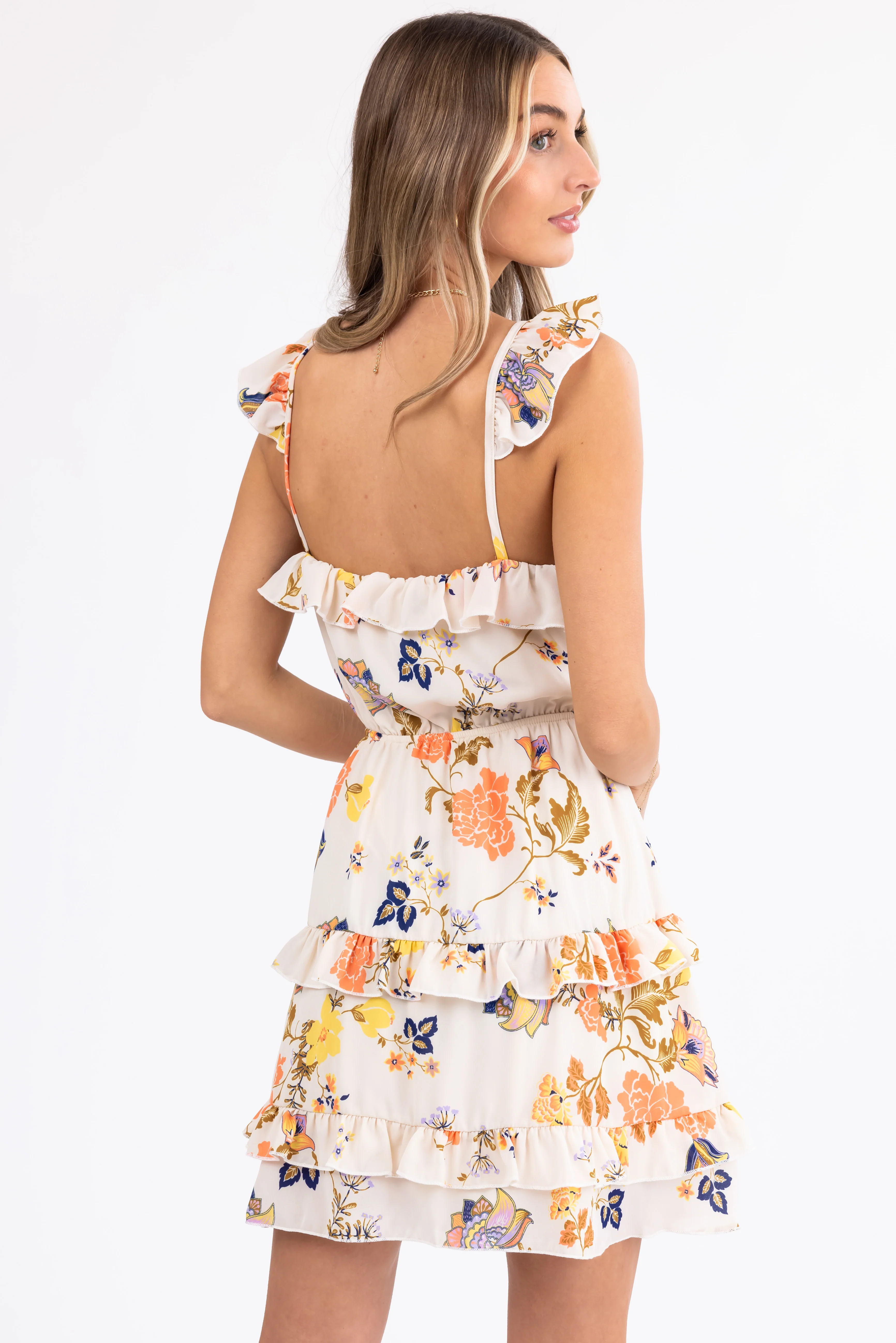 Cream Floral Print Ruffle Tiered Short Dress