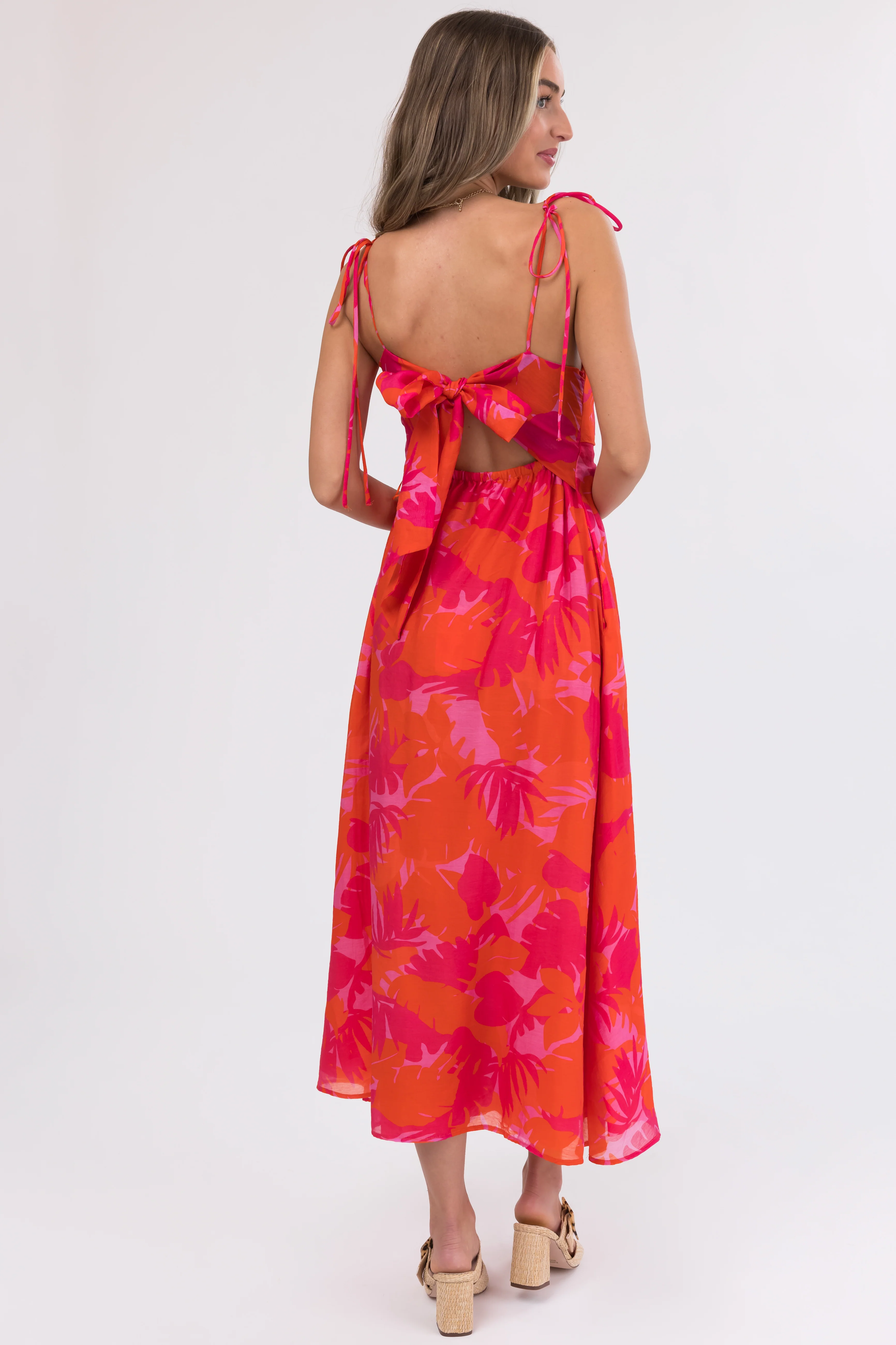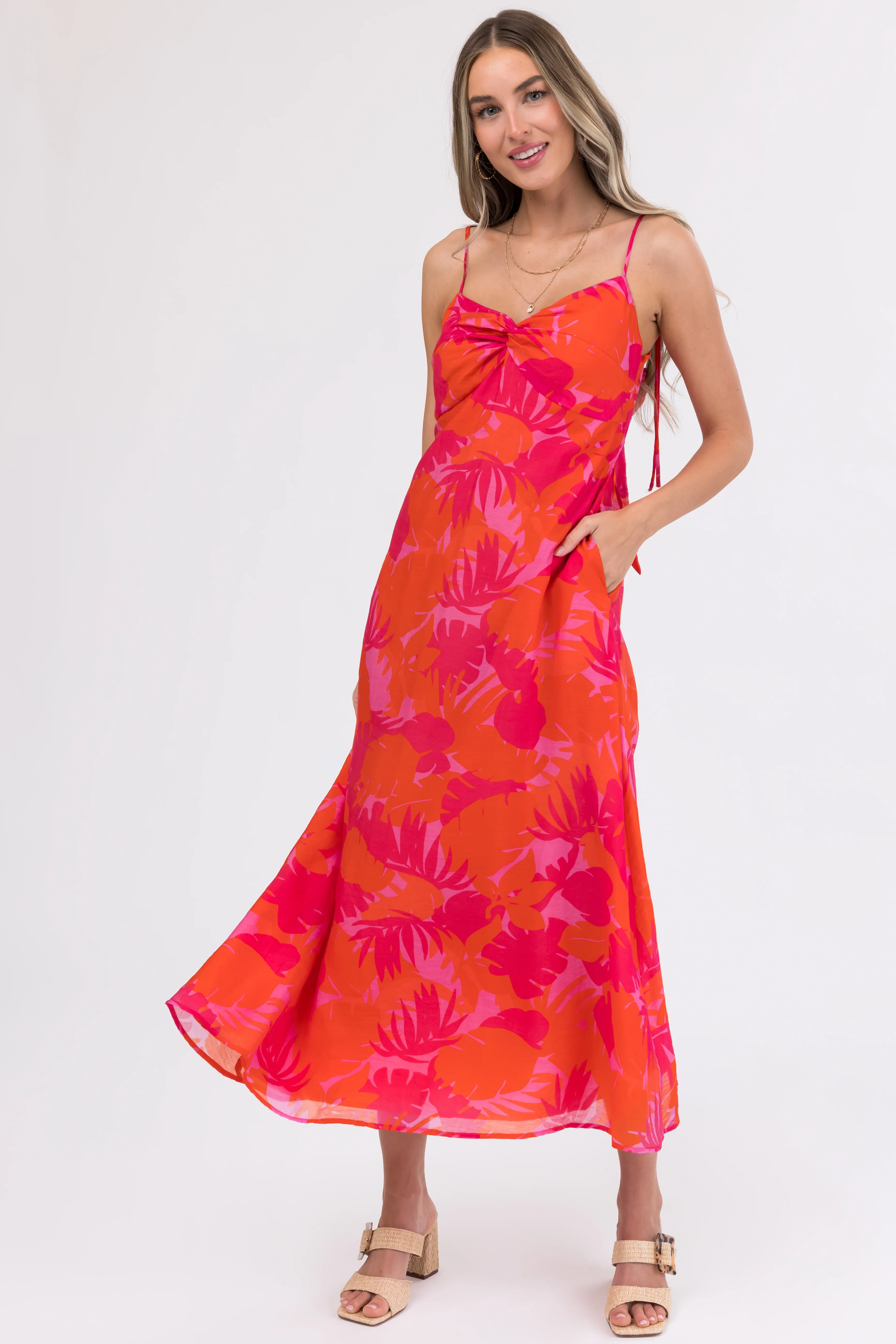 Raspberry Leaf Print Sleeveless Maxi Dress