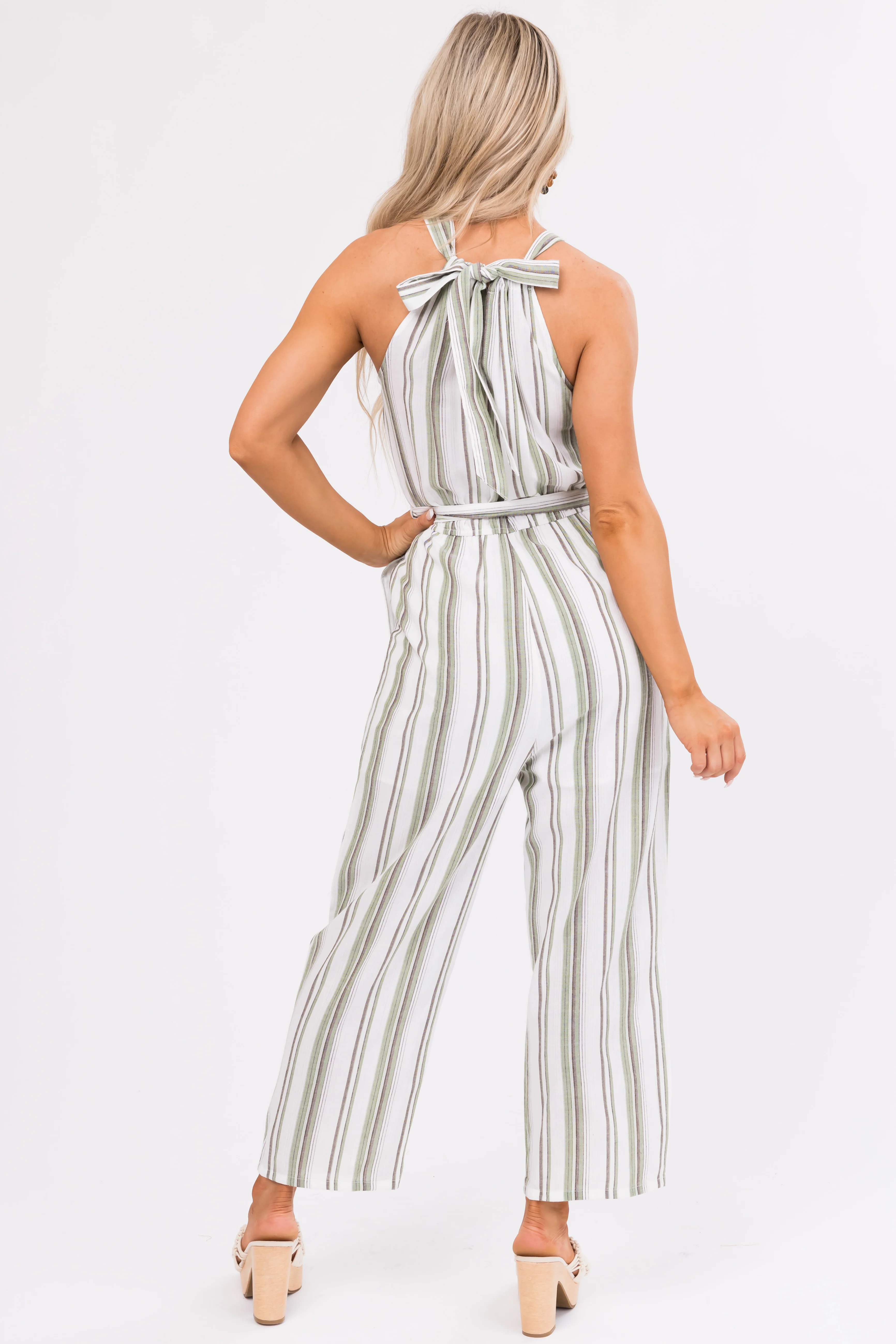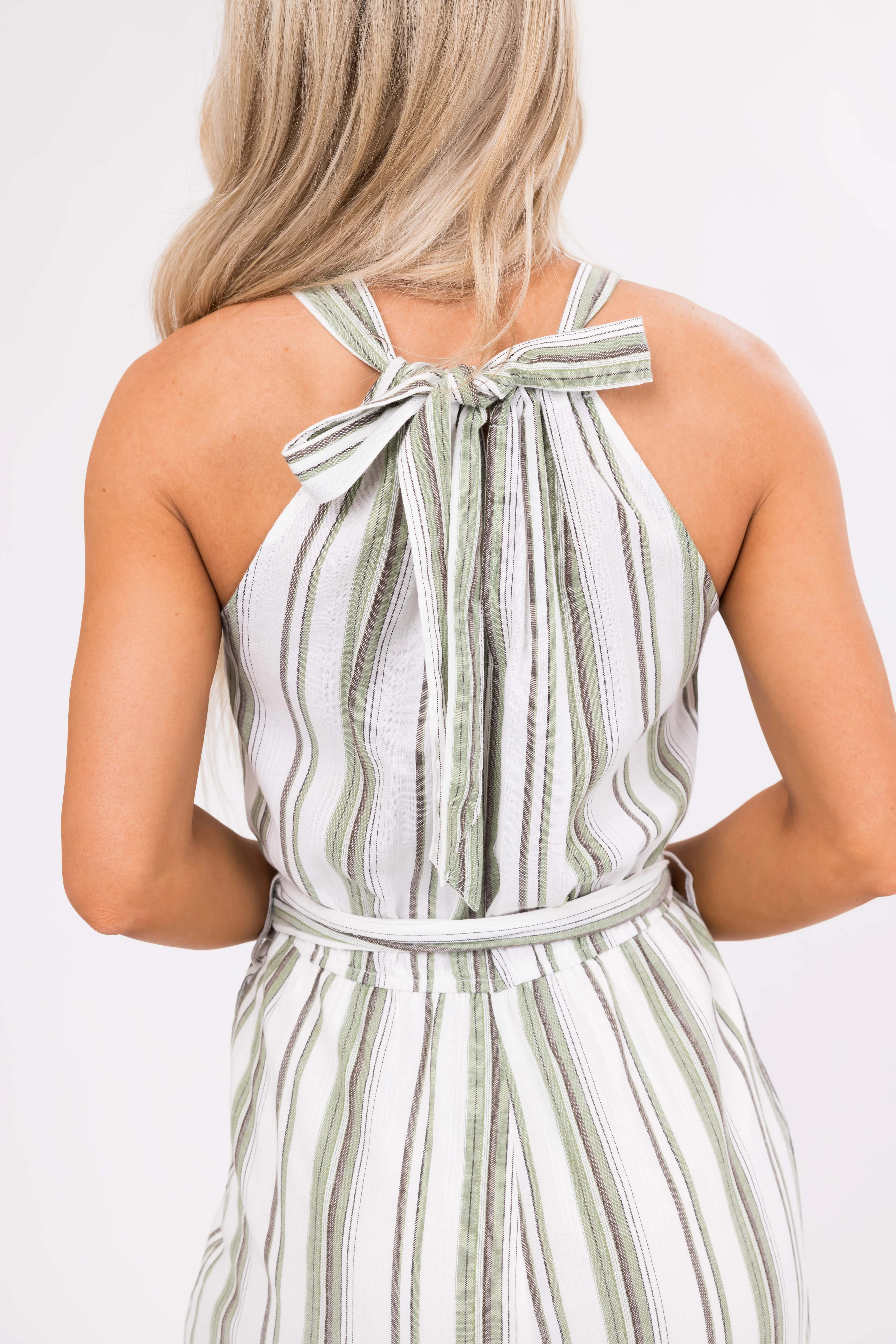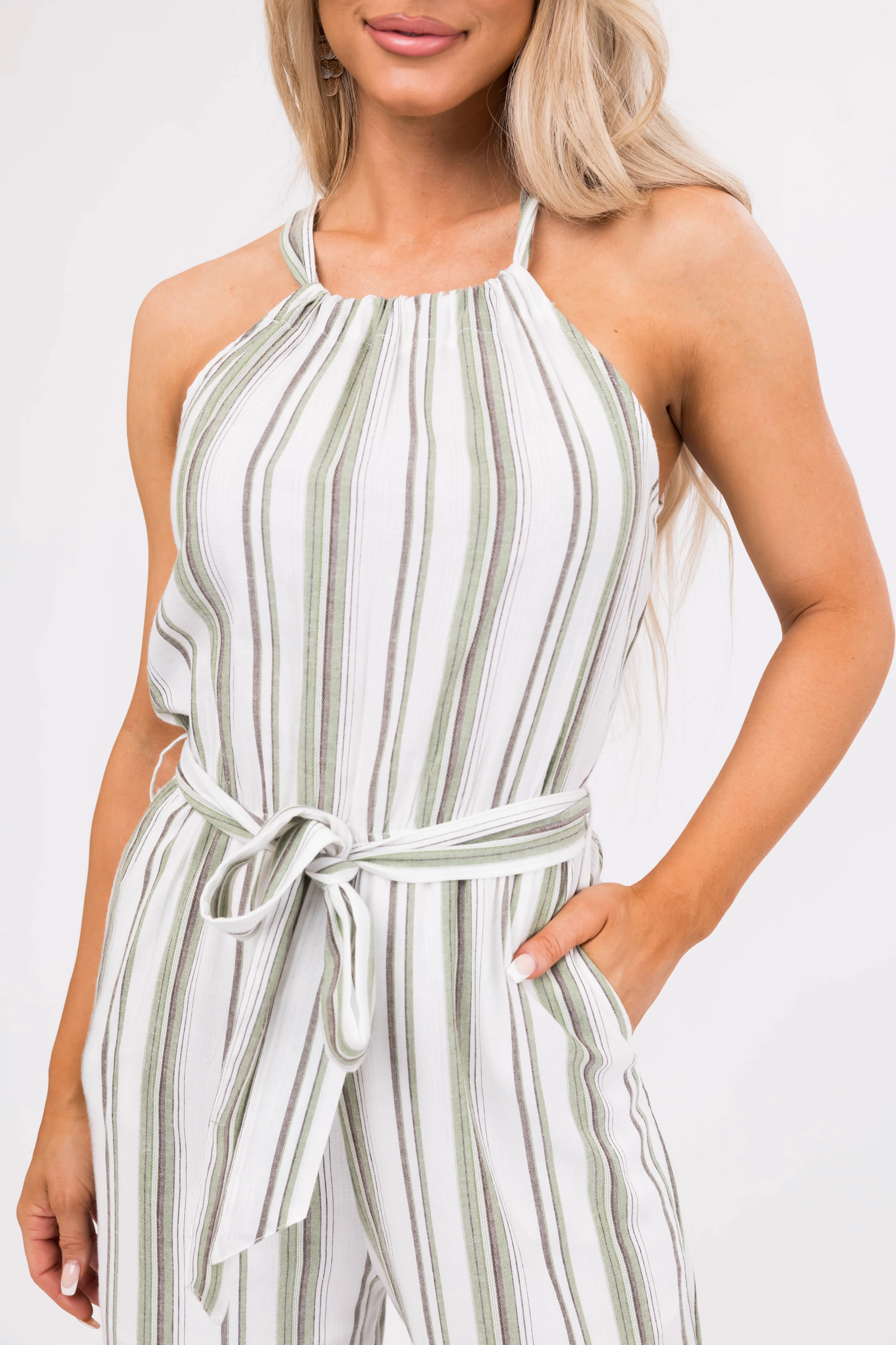 Ivory Striped Sleeveless Waist Tie Jumpsuit