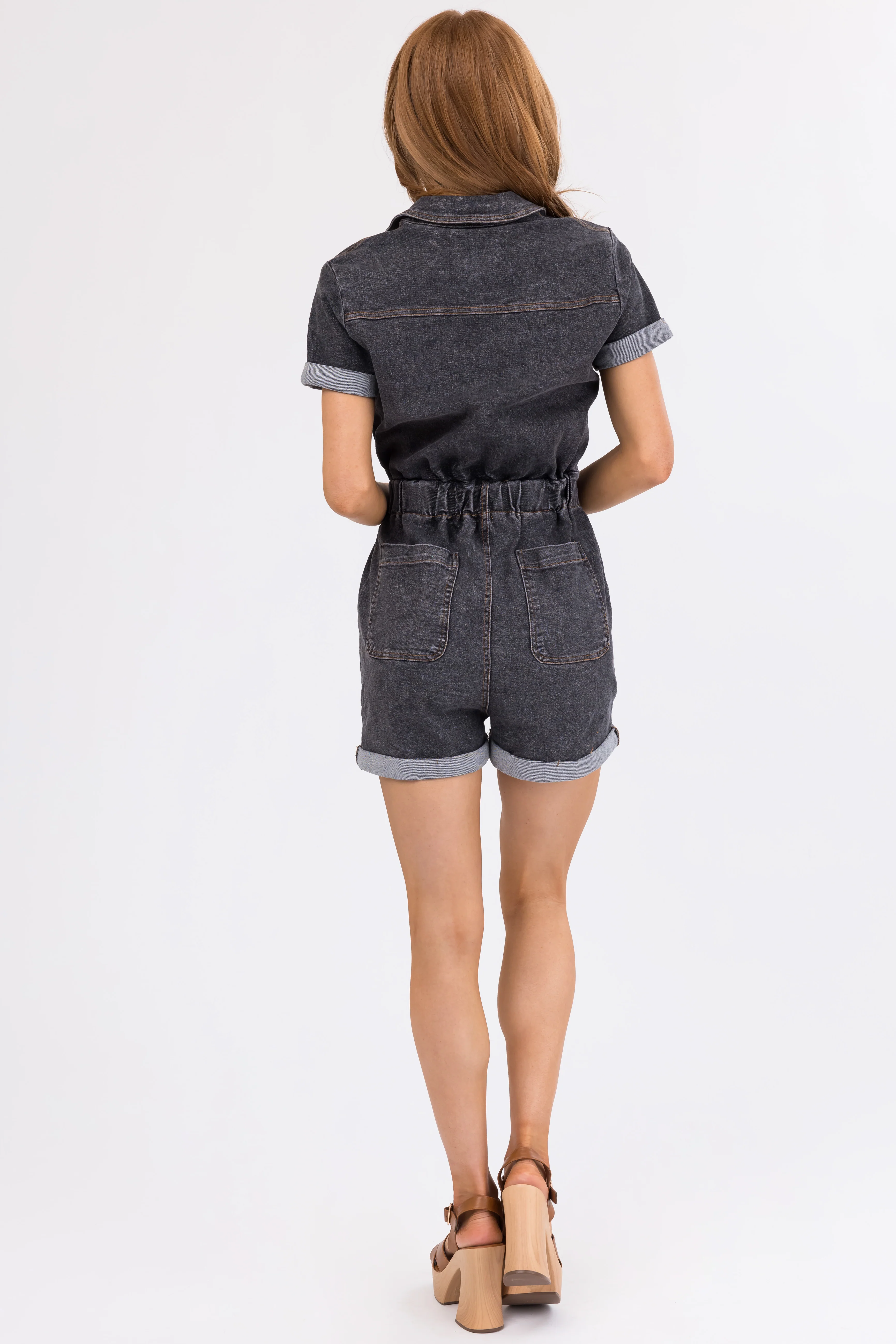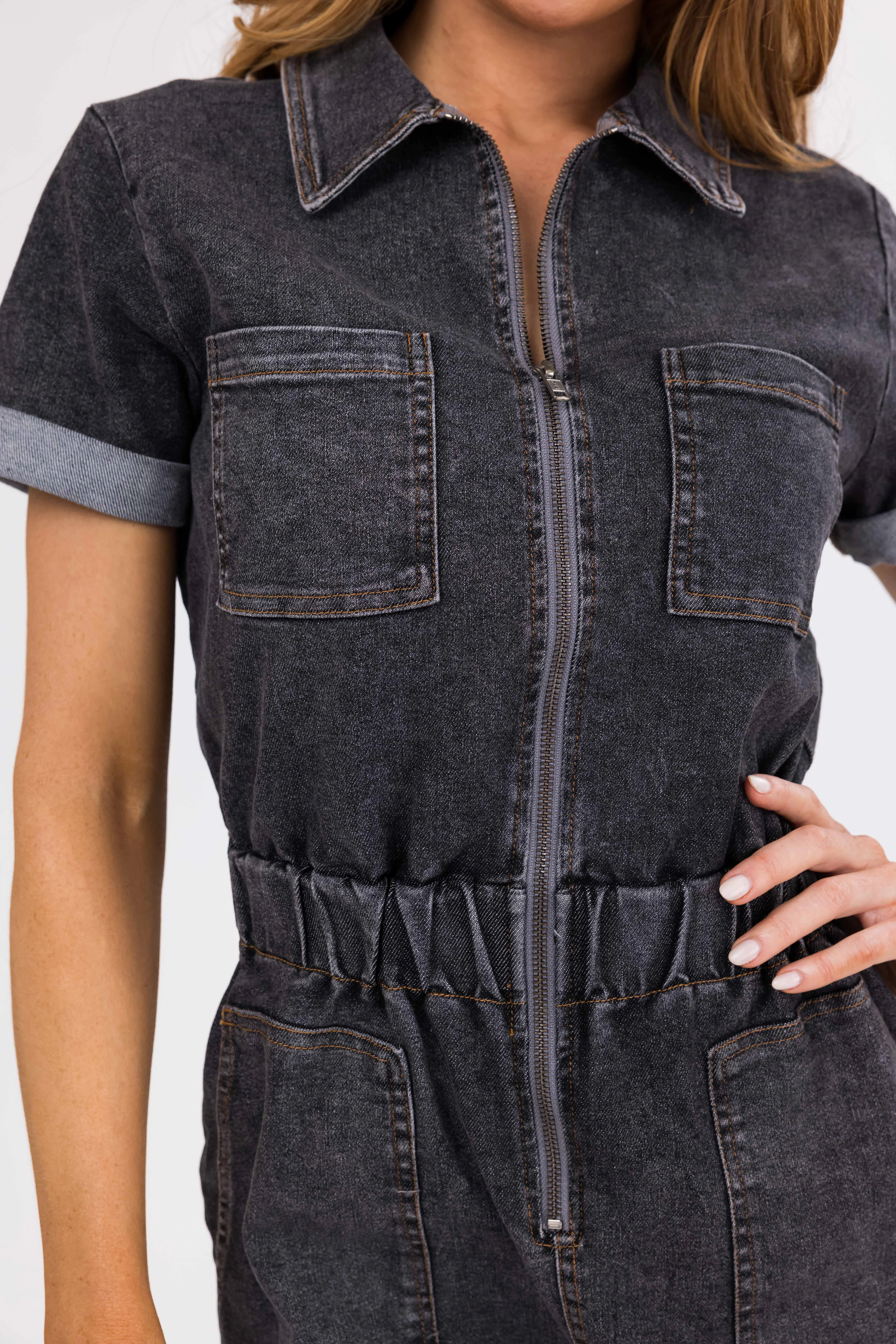 Charcoal Zip Up Short Sleeve Denim Romper